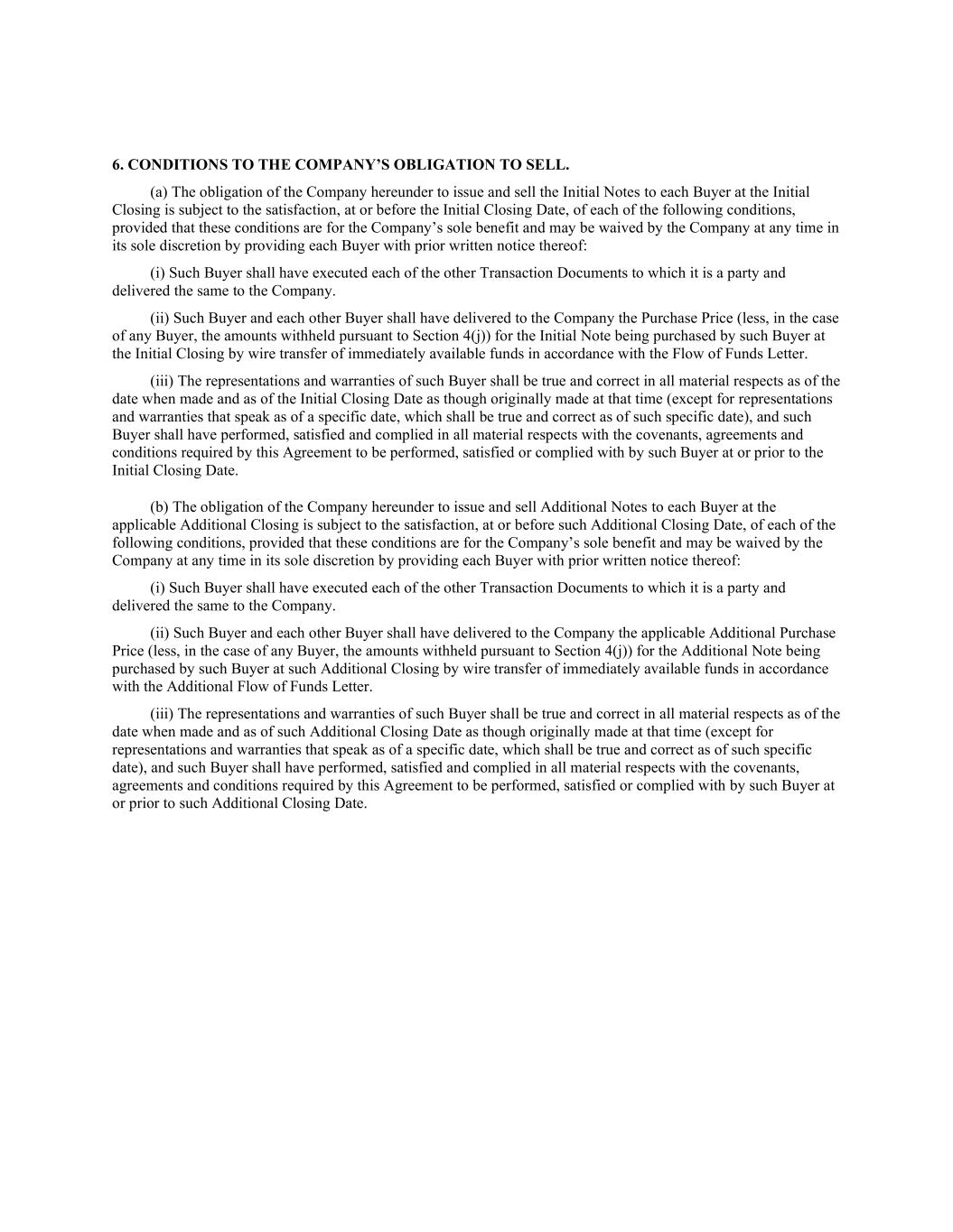 6. CONDITIONS TO THE COMPANY’S OBLIGATION TO SELL. (a) The obligation of the Company hereunder to issue and sell the Initial Notes to each Buyer at the Initial Closing is subject to the satisfaction, at or before the Initial Closing Date, of each of the following conditions, provided that these conditions are for the Company’s sole benefit and may be waived by the Company at any time in its sole discretion by providing each Buyer with prior written notice thereof: (i) Such Buyer shall have executed each of the other Transaction Documents to which it is a party and delivered the same to the Company. (ii) Such Buyer and each other Buyer shall have delivered to the Company the Purchase Price (less, in the case of any Buyer, the amounts withheld pursuant to Section 4(j)) for the Initial Note being purchased by such Buyer at the Initial Closing by wire transfer of immediately available funds in accordance with the Flow of Funds Letter. (iii) The representations and warranties of such Buyer shall be true and correct in all material respects as of the date when made and as of the Initial Closing Date as though originally made at that time (except for representations and warranties that speak as of a specific date, which shall be true and correct as of such specific date), and such Buyer shall have performed, satisfied and complied in all material respects with the covenants, agreements and conditions required by this Agreement to be performed, satisfied or complied with by such Buyer at or prior to the Initial Closing Date. (b) The obligation of the Company hereunder to issue and sell Additional Notes to each Buyer at the applicable Additional Closing is subject to the satisfaction, at or before such Additional Closing Date, of each of the following conditions, provided that these conditions are for the Company’s sole benefit and may be waived by the Company at any time in its sole discretion by providing each Buyer with prior written notice thereof: (i) Such Buyer shall have executed each of the other Transaction Documents to which it is a party and delivered the same to the Company. (ii) Such Buyer and each other Buyer shall have delivered to the Company the applicable Additional Purchase Price (less, in the case of any Buyer, the amounts withheld pursuant to Section 4(j)) for the Additional Note being purchased by such Buyer at such Additional Closing by wire transfer of immediately available funds in accordance with the Additional Flow of Funds Letter. (iii) The representations and warranties of such Buyer shall be true and correct in all material respects as of the date when made and as of such Additional Closing Date as though originally made at that time (except for representations and warranties that speak as of a specific date, which shall be true and correct as of such specific date), and such Buyer shall have performed, satisfied and complied in all material respects with the covenants, agreements and conditions required by this Agreement to be performed, satisfied or complied with by such Buyer at or prior to such Additional Closing Date.