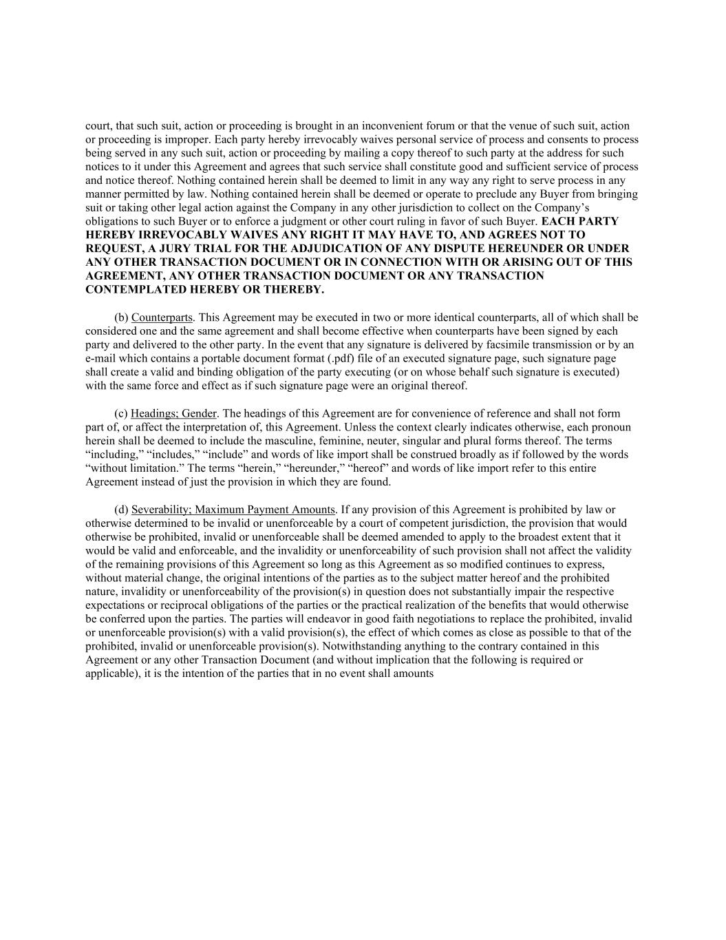court, that such suit, action or proceeding is brought in an inconvenient forum or that the venue of such suit, action or proceeding is improper. Each party hereby irrevocably waives personal service of process and consents to process being served in any such suit, action or proceeding by mailing a copy thereof to such party at the address for such notices to it under this Agreement and agrees that such service shall constitute good and sufficient service of process and notice thereof. Nothing contained herein shall be deemed to limit in any way any right to serve process in any manner permitted by law. Nothing contained herein shall be deemed or operate to preclude any Buyer from bringing suit or taking other legal action against the Company in any other jurisdiction to collect on the Company’s obligations to such Buyer or to enforce a judgment or other court ruling in favor of such Buyer. EACH PARTY HEREBY IRREVOCABLY WAIVES ANY RIGHT IT MAY HAVE TO, AND AGREES NOT TO REQUEST, A JURY TRIAL FOR THE ADJUDICATION OF ANY DISPUTE HEREUNDER OR UNDER ANY OTHER TRANSACTION DOCUMENT OR IN CONNECTION WITH OR ARISING OUT OF THIS AGREEMENT, ANY OTHER TRANSACTION DOCUMENT OR ANY TRANSACTION CONTEMPLATED HEREBY OR THEREBY. (b) Counterparts. This Agreement may be executed in two or more identical counterparts, all of which shall be considered one and the same agreement and shall become effective when counterparts have been signed by each party and delivered to the other party. In the event that any signature is delivered by facsimile transmission or by an e-mail which contains a portable document format (.pdf) file of an executed signature page, such signature page shall create a valid and binding obligation of the party executing (or on whose behalf such signature is executed) with the same force and effect as if such signature page were an original thereof. (c) Headings; Gender. The headings of this Agreement are for convenience of reference and shall not form part of, or affect the interpretation of, this Agreement. Unless the context clearly indicates otherwise, each pronoun herein shall be deemed to include the masculine, feminine, neuter, singular and plural forms thereof. The terms “including,” “includes,” “include” and words of like import shall be construed broadly as if followed by the words “without limitation.” The terms “herein,” “hereunder,” “hereof” and words of like import refer to this entire Agreement instead of just the provision in which they are found. (d) Severability; Maximum Payment Amounts. If any provision of this Agreement is prohibited by law or otherwise determined to be invalid or unenforceable by a court of competent jurisdiction, the provision that would otherwise be prohibited, invalid or unenforceable shall be deemed amended to apply to the broadest extent that it would be valid and enforceable, and the invalidity or unenforceability of such provision shall not affect the validity of the remaining provisions of this Agreement so long as this Agreement as so modified continues to express, without material change, the original intentions of the parties as to the subject matter hereof and the prohibited nature, invalidity or unenforceability of the provision(s) in question does not substantially impair the respective expectations or reciprocal obligations of the parties or the practical realization of the benefits that would otherwise be conferred upon the parties. The parties will endeavor in good faith negotiations to replace the prohibited, invalid or unenforceable provision(s) with a valid provision(s), the effect of which comes as close as possible to that of the prohibited, invalid or unenforceable provision(s). Notwithstanding anything to the contrary contained in this Agreement or any other Transaction Document (and without implication that the following is required or applicable), it is the intention of the parties that in no event shall amounts