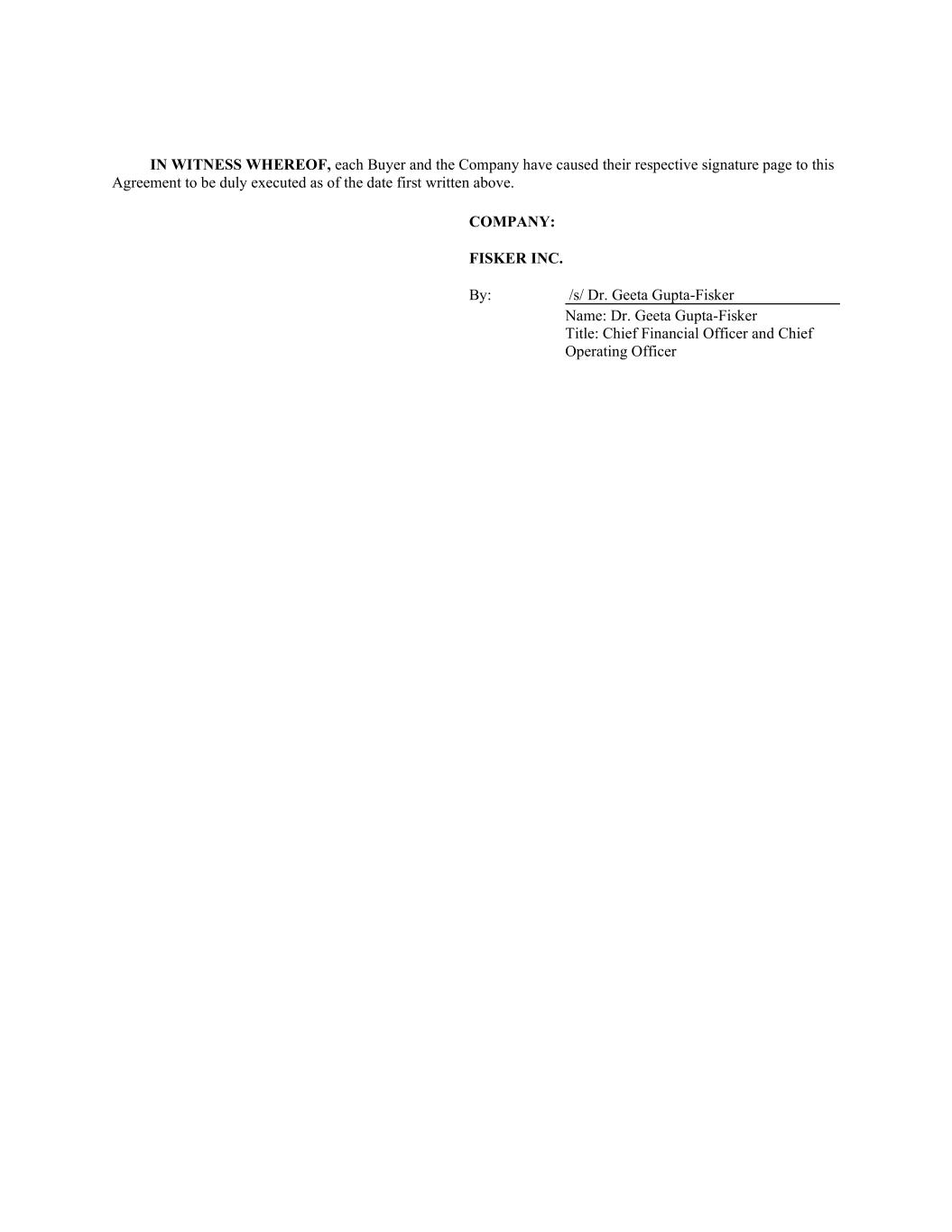 IN WITNESS WHEREOF, each Buyer and the Company have caused their respective signature page to this Agreement to be duly executed as of the date first written above. COMPANY: FISKER INC. By: /s/ Dr. Geeta Gupta-Fisker Name: Dr. Geeta Gupta-Fisker Title: Chief Financial Officer and Chief Operating Officer