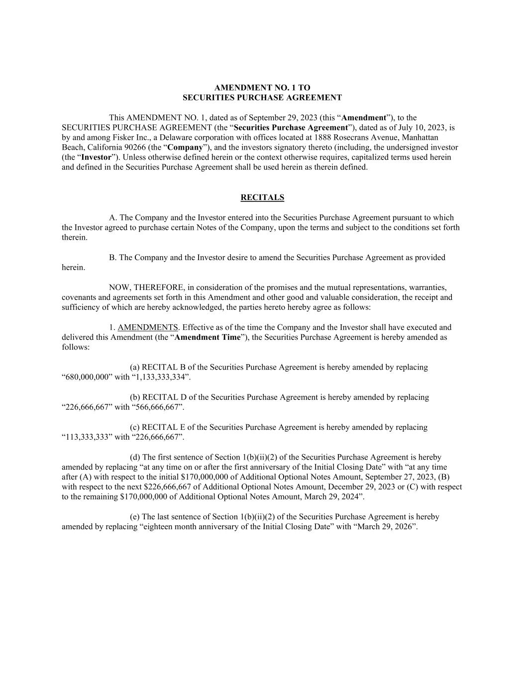 AMENDMENT NO. 1 TO SECURITIES PURCHASE AGREEMENT This AMENDMENT NO. 1, dated as of September 29, 2023 (this “Amendment”), to the SECURITIES PURCHASE AGREEMENT (the “Securities Purchase Agreement”), dated as of July 10, 2023, is by and among Fisker Inc., a Delaware corporation with offices located at 1888 Rosecrans Avenue, Manhattan Beach, California 90266 (the “Company”), and the investors signatory thereto (including, the undersigned investor (the “Investor”). Unless otherwise defined herein or the context otherwise requires, capitalized terms used herein and defined in the Securities Purchase Agreement shall be used herein as therein defined. RECITALS A. The Company and the Investor entered into the Securities Purchase Agreement pursuant to which the Investor agreed to purchase certain Notes of the Company, upon the terms and subject to the conditions set forth therein. B. The Company and the Investor desire to amend the Securities Purchase Agreement as provided herein. NOW, THEREFORE, in consideration of the promises and the mutual representations, warranties, covenants and agreements set forth in this Amendment and other good and valuable consideration, the receipt and sufficiency of which are hereby acknowledged, the parties hereto hereby agree as follows: 1. AMENDMENTS. Effective as of the time the Company and the Investor shall have executed and delivered this Amendment (the “Amendment Time”), the Securities Purchase Agreement is hereby amended as follows: (a) RECITAL B of the Securities Purchase Agreement is hereby amended by replacing “680,000,000” with “1,133,333,334”. (b) RECITAL D of the Securities Purchase Agreement is hereby amended by replacing “226,666,667” with “566,666,667”. (c) RECITAL E of the Securities Purchase Agreement is hereby amended by replacing “113,333,333” with “226,666,667”. (d) The first sentence of Section 1(b)(ii)(2) of the Securities Purchase Agreement is hereby amended by replacing “at any time on or after the first anniversary of the Initial Closing Date” with “at any time after (A) with respect to the initial $170,000,000 of Additional Optional Notes Amount, September 27, 2023, (B) with respect to the next $226,666,667 of Additional Optional Notes Amount, December 29, 2023 or (C) with respect to the remaining $170,000,000 of Additional Optional Notes Amount, March 29, 2024”. (e) The last sentence of Section 1(b)(ii)(2) of the Securities Purchase Agreement is hereby amended by replacing “eighteen month anniversary of the Initial Closing Date” with “March 29, 2026”.