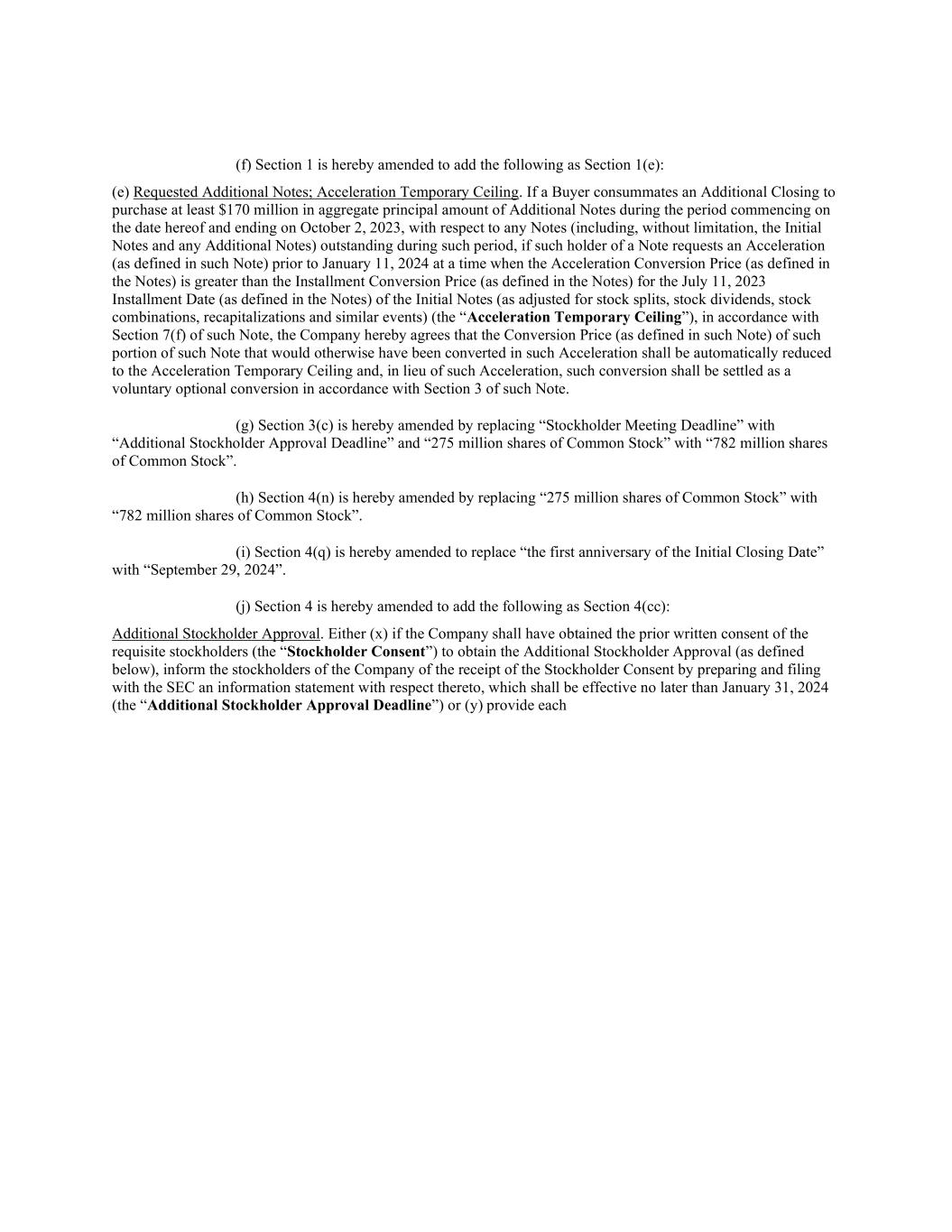 (f) Section 1 is hereby amended to add the following as Section 1(e): (e) Requested Additional Notes; Acceleration Temporary Ceiling. If a Buyer consummates an Additional Closing to purchase at least $170 million in aggregate principal amount of Additional Notes during the period commencing on the date hereof and ending on October 2, 2023, with respect to any Notes (including, without limitation, the Initial Notes and any Additional Notes) outstanding during such period, if such holder of a Note requests an Acceleration (as defined in such Note) prior to January 11, 2024 at a time when the Acceleration Conversion Price (as defined in the Notes) is greater than the Installment Conversion Price (as defined in the Notes) for the July 11, 2023 Installment Date (as defined in the Notes) of the Initial Notes (as adjusted for stock splits, stock dividends, stock combinations, recapitalizations and similar events) (the “Acceleration Temporary Ceiling”), in accordance with Section 7(f) of such Note, the Company hereby agrees that the Conversion Price (as defined in such Note) of such portion of such Note that would otherwise have been converted in such Acceleration shall be automatically reduced to the Acceleration Temporary Ceiling and, in lieu of such Acceleration, such conversion shall be settled as a voluntary optional conversion in accordance with Section 3 of such Note. (g) Section 3(c) is hereby amended by replacing “Stockholder Meeting Deadline” with “Additional Stockholder Approval Deadline” and “275 million shares of Common Stock” with “782 million shares of Common Stock”. (h) Section 4(n) is hereby amended by replacing “275 million shares of Common Stock” with “782 million shares of Common Stock”. (i) Section 4(q) is hereby amended to replace “the first anniversary of the Initial Closing Date” with “September 29, 2024”. (j) Section 4 is hereby amended to add the following as Section 4(cc): Additional Stockholder Approval. Either (x) if the Company shall have obtained the prior written consent of the requisite stockholders (the “Stockholder Consent”) to obtain the Additional Stockholder Approval (as defined below), inform the stockholders of the Company of the receipt of the Stockholder Consent by preparing and filing with the SEC an information statement with respect thereto, which shall be effective no later than January 31, 2024 (the “Additional Stockholder Approval Deadline”) or (y) provide each