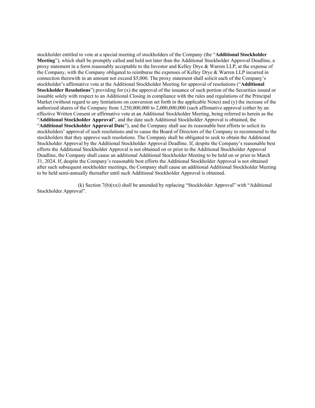 stockholder entitled to vote at a special meeting of stockholders of the Company (the “Additional Stockholder Meeting”), which shall be promptly called and held not later than the Additional Stockholder Approval Deadline, a proxy statement in a form reasonably acceptable to the Investor and Kelley Drye & Warren LLP, at the expense of the Company, with the Company obligated to reimburse the expenses of Kelley Drye & Warren LLP incurred in connection therewith in an amount not exceed $5,000. The proxy statement shall solicit each of the Company’s stockholder’s affirmative vote at the Additional Stockholder Meeting for approval of resolutions (“Additional Stockholder Resolutions”) providing for (x) the approval of the issuance of such portion of the Securities issued or issuable solely with respect to an Additional Closing in compliance with the rules and regulations of the Principal Market (without regard to any limitations on conversion set forth in the applicable Notes) and (y) the increase of the authorized shares of the Company from 1,250,000,000 to 2,000,000,000 (such affirmative approval (either by an effective Written Consent or affirmative vote at an Additional Stockholder Meeting, being referred to herein as the “Additional Stockholder Approval”, and the date such Additional Stockholder Approval is obtained, the “Additional Stockholder Approval Date”), and the Company shall use its reasonable best efforts to solicit its stockholders’ approval of such resolutions and to cause the Board of Directors of the Company to recommend to the stockholders that they approve such resolutions. The Company shall be obligated to seek to obtain the Additional Stockholder Approval by the Additional Stockholder Approval Deadline. If, despite the Company’s reasonable best efforts the Additional Stockholder Approval is not obtained on or prior to the Additional Stockholder Approval Deadline, the Company shall cause an additional Additional Stockholder Meeting to be held on or prior to March 31, 2024. If, despite the Company’s reasonable best efforts the Additional Stockholder Approval is not obtained after such subsequent stockholder meetings, the Company shall cause an additional Additional Stockholder Meeting to be held semi-annually thereafter until such Additional Stockholder Approval is obtained. (k) Section 7(b)(xxi) shall be amended by replacing “Stockholder Approval” with “Additional Stockholder Approval”.