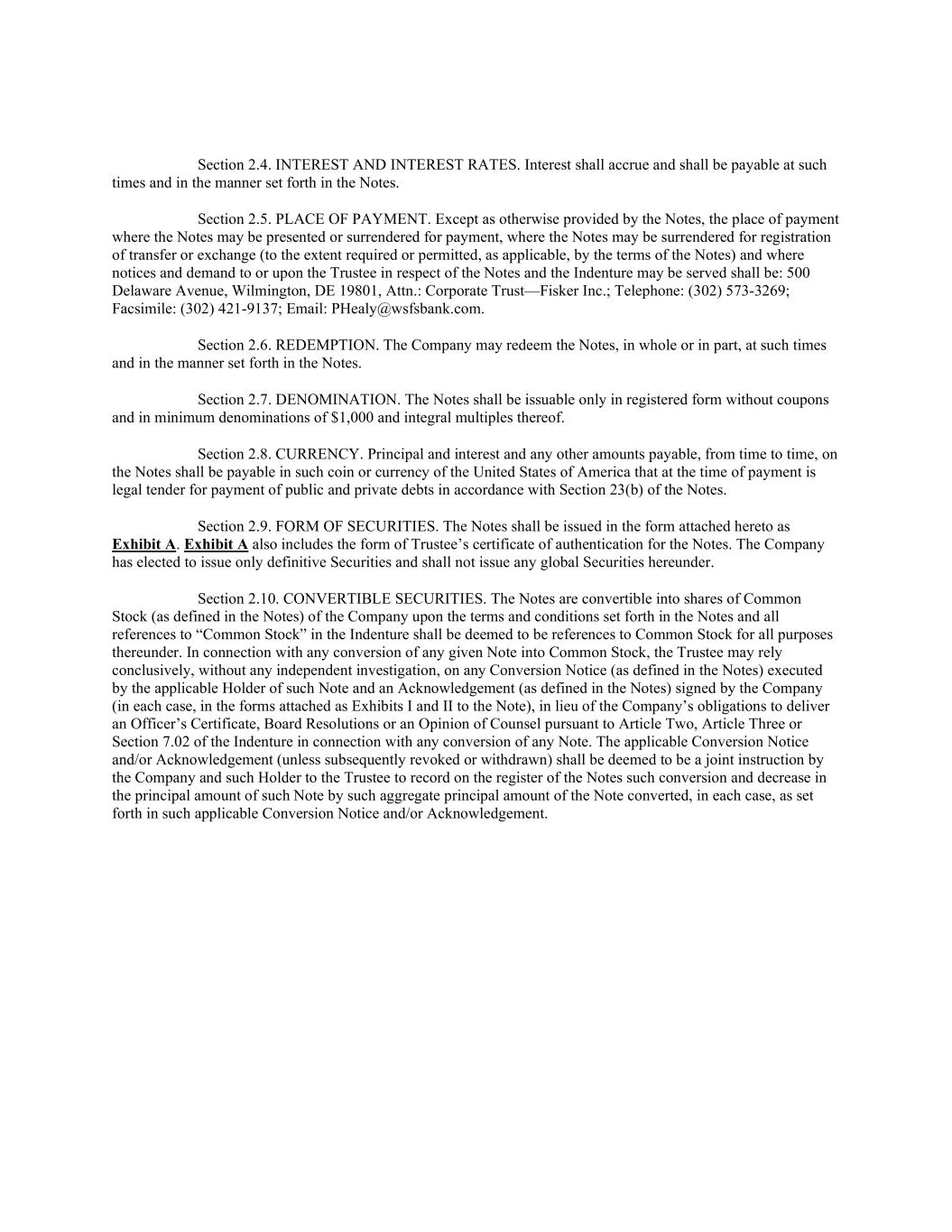 Section 2.4. INTEREST AND INTEREST RATES. Interest shall accrue and shall be payable at such times and in the manner set forth in the Notes. Section 2.5. PLACE OF PAYMENT. Except as otherwise provided by the Notes, the place of payment where the Notes may be presented or surrendered for payment, where the Notes may be surrendered for registration of transfer or exchange (to the extent required or permitted, as applicable, by the terms of the Notes) and where notices and demand to or upon the Trustee in respect of the Notes and the Indenture may be served shall be: 500 Delaware Avenue, Wilmington, DE 19801, Attn.: Corporate Trust—Fisker Inc.; Telephone: (302) 573-3269; Facsimile: (302) 421-9137; Email: PHealy@wsfsbank.com. Section 2.6. REDEMPTION. The Company may redeem the Notes, in whole or in part, at such times and in the manner set forth in the Notes. Section 2.7. DENOMINATION. The Notes shall be issuable only in registered form without coupons and in minimum denominations of $1,000 and integral multiples thereof. Section 2.8. CURRENCY. Principal and interest and any other amounts payable, from time to time, on the Notes shall be payable in such coin or currency of the United States of America that at the time of payment is legal tender for payment of public and private debts in accordance with Section 23(b) of the Notes. Section 2.9. FORM OF SECURITIES. The Notes shall be issued in the form attached hereto as Exhibit A. Exhibit A also includes the form of Trustee’s certificate of authentication for the Notes. The Company has elected to issue only definitive Securities and shall not issue any global Securities hereunder. Section 2.10. CONVERTIBLE SECURITIES. The Notes are convertible into shares of Common Stock (as defined in the Notes) of the Company upon the terms and conditions set forth in the Notes and all references to “Common Stock” in the Indenture shall be deemed to be references to Common Stock for all purposes thereunder. In connection with any conversion of any given Note into Common Stock, the Trustee may rely conclusively, without any independent investigation, on any Conversion Notice (as defined in the Notes) executed by the applicable Holder of such Note and an Acknowledgement (as defined in the Notes) signed by the Company (in each case, in the forms attached as Exhibits I and II to the Note), in lieu of the Company’s obligations to deliver an Officer’s Certificate, Board Resolutions or an Opinion of Counsel pursuant to Article Two, Article Three or Section 7.02 of the Indenture in connection with any conversion of any Note. The applicable Conversion Notice and/or Acknowledgement (unless subsequently revoked or withdrawn) shall be deemed to be a joint instruction by the Company and such Holder to the Trustee to record on the register of the Notes such conversion and decrease in the principal amount of such Note by such aggregate principal amount of the Note converted, in each case, as set forth in such applicable Conversion Notice and/or Acknowledgement.