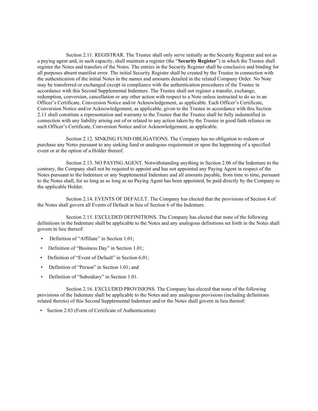 Section 2.11. REGISTRAR. The Trustee shall only serve initially as the Security Registrar and not as a paying agent and, in such capacity, shall maintain a register (the “Security Register”) in which the Trustee shall register the Notes and transfers of the Notes. The entries in the Security Register shall be conclusive and binding for all purposes absent manifest error. The initial Security Register shall be created by the Trustee in connection with the authentication of the initial Notes in the names and amounts detailed in the related Company Order. No Note may be transferred or exchanged except in compliance with the authentication procedures of the Trustee in accordance with this Second Supplemental Indenture. The Trustee shall not register a transfer, exchange, redemption, conversion, cancellation or any other action with respect to a Note unless instructed to do so in an Officer’s Certificate, Conversion Notice and/or Acknowledgement, as applicable. Each Officer’s Certificate, Conversion Notice and/or Acknowledgement, as applicable, given to the Trustee in accordance with this Section 2.11 shall constitute a representation and warranty to the Trustee that the Trustee shall be fully indemnified in connection with any liability arising out of or related to any action taken by the Trustee in good faith reliance on such Officer’s Certificate, Conversion Notice and/or Acknowledgement, as applicable. Section 2.12. SINKING FUND OBLIGATIONS. The Company has no obligation to redeem or purchase any Notes pursuant to any sinking fund or analogous requirement or upon the happening of a specified event or at the option of a Holder thereof. Section 2.13. NO PAYING AGENT. Notwithstanding anything in Section 2.06 of the Indenture to the contrary, the Company shall not be required to appoint and has not appointed any Paying Agent in respect of the Notes pursuant to the Indenture or any Supplemental Indenture and all amounts payable, from time to time, pursuant to the Notes shall, for so long as so long as no Paying Agent has been appointed, be paid directly by the Company to the applicable Holder. Section 2.14. EVENTS OF DEFAULT. The Company has elected that the provisions of Section 4 of the Notes shall govern all Events of Default in lieu of Section 6 of the Indenture. Section 2.15. EXCLUDED DEFINITIONS. The Company has elected that none of the following definitions in the Indenture shall be applicable to the Notes and any analogous definitions set forth in the Notes shall govern in lieu thereof: • Definition of “Affiliate” in Section 1.01; • Definition of “Business Day” in Section 1.01; • Definition of “Event of Default” in Section 6.01; • Definition of “Person” in Section 1.01; and • Definition of “Subsidiary” in Section 1.01. Section 2.16. EXCLUDED PROVISIONS. The Company has elected that none of the following provisions of the Indenture shall be applicable to the Notes and any analogous provisions (including definitions related thereto) of this Second Supplemental Indenture and/or the Notes shall govern in lieu thereof: • Section 2.03 (Form of Certificate of Authentication)