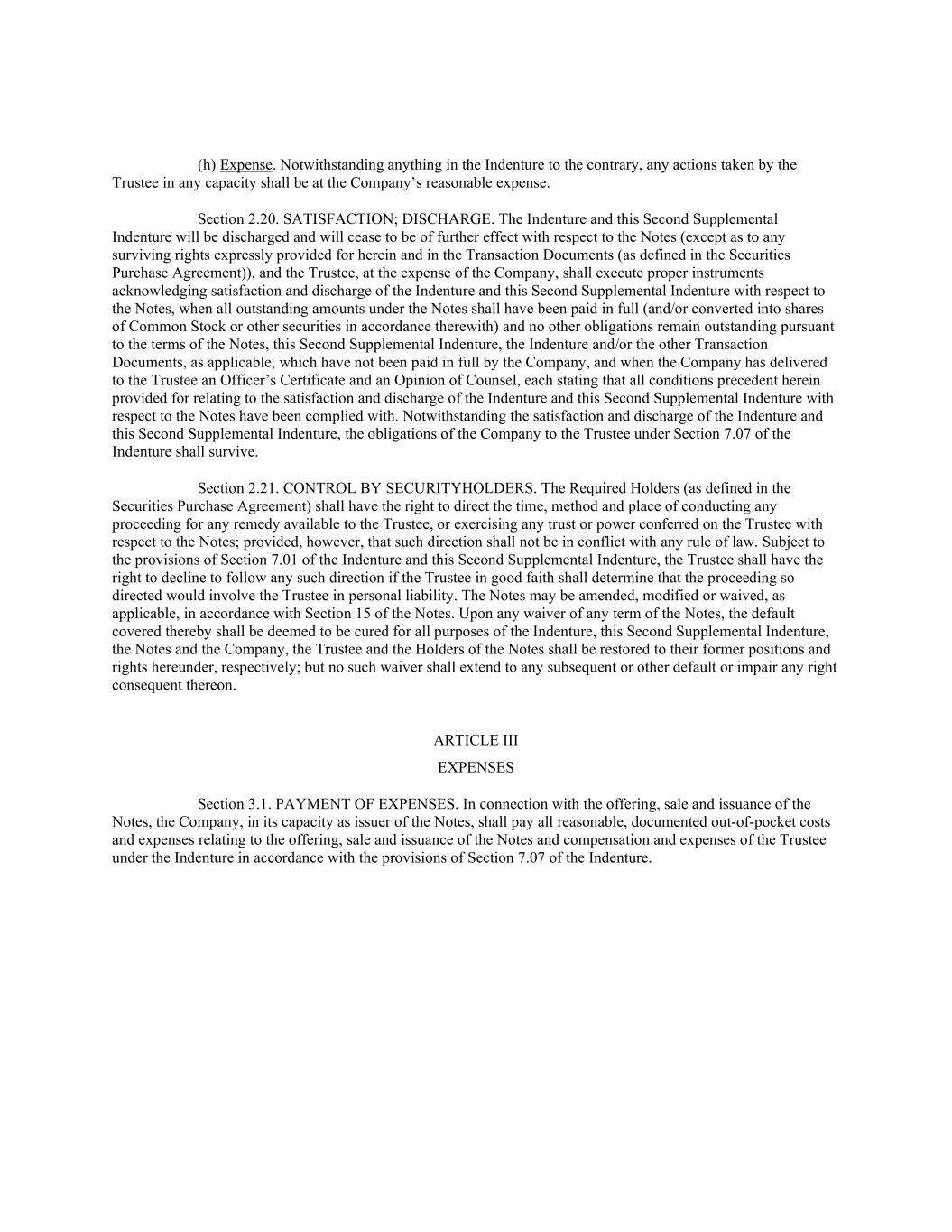 (h) Expense. Notwithstanding anything in the Indenture to the contrary, any actions taken by the Trustee in any capacity shall be at the Company’s reasonable expense. Section 2.20. SATISFACTION; DISCHARGE. The Indenture and this Second Supplemental Indenture will be discharged and will cease to be of further effect with respect to the Notes (except as to any surviving rights expressly provided for herein and in the Transaction Documents (as defined in the Securities Purchase Agreement)), and the Trustee, at the expense of the Company, shall execute proper instruments acknowledging satisfaction and discharge of the Indenture and this Second Supplemental Indenture with respect to the Notes, when all outstanding amounts under the Notes shall have been paid in full (and/or converted into shares of Common Stock or other securities in accordance therewith) and no other obligations remain outstanding pursuant to the terms of the Notes, this Second Supplemental Indenture, the Indenture and/or the other Transaction Documents, as applicable, which have not been paid in full by the Company, and when the Company has delivered to the Trustee an Officer’s Certificate and an Opinion of Counsel, each stating that all conditions precedent herein provided for relating to the satisfaction and discharge of the Indenture and this Second Supplemental Indenture with respect to the Notes have been complied with. Notwithstanding the satisfaction and discharge of the Indenture and this Second Supplemental Indenture, the obligations of the Company to the Trustee under Section 7.07 of the Indenture shall survive. Section 2.21. CONTROL BY SECURITYHOLDERS. The Required Holders (as defined in the Securities Purchase Agreement) shall have the right to direct the time, method and place of conducting any proceeding for any remedy available to the Trustee, or exercising any trust or power conferred on the Trustee with respect to the Notes; provided, however, that such direction shall not be in conflict with any rule of law. Subject to the provisions of Section 7.01 of the Indenture and this Second Supplemental Indenture, the Trustee shall have the right to decline to follow any such direction if the Trustee in good faith shall determine that the proceeding so directed would involve the Trustee in personal liability. The Notes may be amended, modified or waived, as applicable, in accordance with Section 15 of the Notes. Upon any waiver of any term of the Notes, the default covered thereby shall be deemed to be cured for all purposes of the Indenture, this Second Supplemental Indenture, the Notes and the Company, the Trustee and the Holders of the Notes shall be restored to their former positions and rights hereunder, respectively; but no such waiver shall extend to any subsequent or other default or impair any right consequent thereon. ARTICLE III EXPENSES Section 3.1. PAYMENT OF EXPENSES. In connection with the offering, sale and issuance of the Notes, the Company, in its capacity as issuer of the Notes, shall pay all reasonable, documented out-of-pocket costs and expenses relating to the offering, sale and issuance of the Notes and compensation and expenses of the Trustee under the Indenture in accordance with the provisions of Section 7.07 of the Indenture.