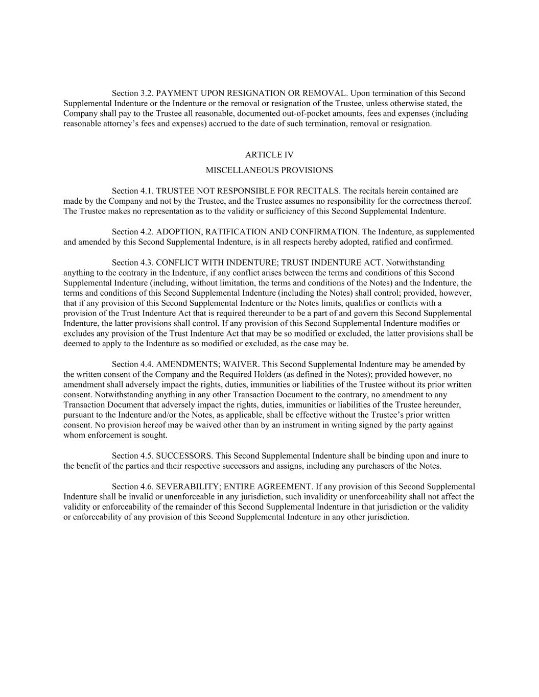Section 3.2. PAYMENT UPON RESIGNATION OR REMOVAL. Upon termination of this Second Supplemental Indenture or the Indenture or the removal or resignation of the Trustee, unless otherwise stated, the Company shall pay to the Trustee all reasonable, documented out-of-pocket amounts, fees and expenses (including reasonable attorney’s fees and expenses) accrued to the date of such termination, removal or resignation. ARTICLE IV MISCELLANEOUS PROVISIONS Section 4.1. TRUSTEE NOT RESPONSIBLE FOR RECITALS. The recitals herein contained are made by the Company and not by the Trustee, and the Trustee assumes no responsibility for the correctness thereof. The Trustee makes no representation as to the validity or sufficiency of this Second Supplemental Indenture. Section 4.2. ADOPTION, RATIFICATION AND CONFIRMATION. The Indenture, as supplemented and amended by this Second Supplemental Indenture, is in all respects hereby adopted, ratified and confirmed. Section 4.3. CONFLICT WITH INDENTURE; TRUST INDENTURE ACT. Notwithstanding anything to the contrary in the Indenture, if any conflict arises between the terms and conditions of this Second Supplemental Indenture (including, without limitation, the terms and conditions of the Notes) and the Indenture, the terms and conditions of this Second Supplemental Indenture (including the Notes) shall control; provided, however, that if any provision of this Second Supplemental Indenture or the Notes limits, qualifies or conflicts with a provision of the Trust Indenture Act that is required thereunder to be a part of and govern this Second Supplemental Indenture, the latter provisions shall control. If any provision of this Second Supplemental Indenture modifies or excludes any provision of the Trust Indenture Act that may be so modified or excluded, the latter provisions shall be deemed to apply to the Indenture as so modified or excluded, as the case may be. Section 4.4. AMENDMENTS; WAIVER. This Second Supplemental Indenture may be amended by the written consent of the Company and the Required Holders (as defined in the Notes); provided however, no amendment shall adversely impact the rights, duties, immunities or liabilities of the Trustee without its prior written consent. Notwithstanding anything in any other Transaction Document to the contrary, no amendment to any Transaction Document that adversely impact the rights, duties, immunities or liabilities of the Trustee hereunder, pursuant to the Indenture and/or the Notes, as applicable, shall be effective without the Trustee’s prior written consent. No provision hereof may be waived other than by an instrument in writing signed by the party against whom enforcement is sought. Section 4.5. SUCCESSORS. This Second Supplemental Indenture shall be binding upon and inure to the benefit of the parties and their respective successors and assigns, including any purchasers of the Notes. Section 4.6. SEVERABILITY; ENTIRE AGREEMENT. If any provision of this Second Supplemental Indenture shall be invalid or unenforceable in any jurisdiction, such invalidity or unenforceability shall not affect the validity or enforceability of the remainder of this Second Supplemental Indenture in that jurisdiction or the validity or enforceability of any provision of this Second Supplemental Indenture in any other jurisdiction.