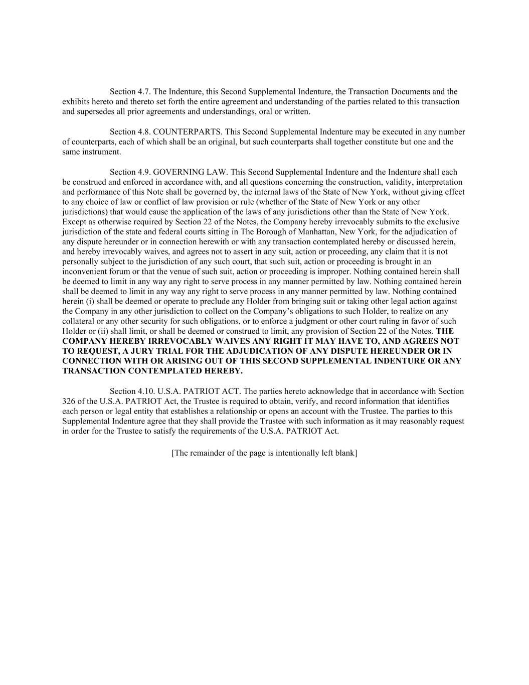 Section 4.7. The Indenture, this Second Supplemental Indenture, the Transaction Documents and the exhibits hereto and thereto set forth the entire agreement and understanding of the parties related to this transaction and supersedes all prior agreements and understandings, oral or written. Section 4.8. COUNTERPARTS. This Second Supplemental Indenture may be executed in any number of counterparts, each of which shall be an original, but such counterparts shall together constitute but one and the same instrument. Section 4.9. GOVERNING LAW. This Second Supplemental Indenture and the Indenture shall each be construed and enforced in accordance with, and all questions concerning the construction, validity, interpretation and performance of this Note shall be governed by, the internal laws of the State of New York, without giving effect to any choice of law or conflict of law provision or rule (whether of the State of New York or any other jurisdictions) that would cause the application of the laws of any jurisdictions other than the State of New York. Except as otherwise required by Section 22 of the Notes, the Company hereby irrevocably submits to the exclusive jurisdiction of the state and federal courts sitting in The Borough of Manhattan, New York, for the adjudication of any dispute hereunder or in connection herewith or with any transaction contemplated hereby or discussed herein, and hereby irrevocably waives, and agrees not to assert in any suit, action or proceeding, any claim that it is not personally subject to the jurisdiction of any such court, that such suit, action or proceeding is brought in an inconvenient forum or that the venue of such suit, action or proceeding is improper. Nothing contained herein shall be deemed to limit in any way any right to serve process in any manner permitted by law. Nothing contained herein shall be deemed to limit in any way any right to serve process in any manner permitted by law. Nothing contained herein (i) shall be deemed or operate to preclude any Holder from bringing suit or taking other legal action against the Company in any other jurisdiction to collect on the Company’s obligations to such Holder, to realize on any collateral or any other security for such obligations, or to enforce a judgment or other court ruling in favor of such Holder or (ii) shall limit, or shall be deemed or construed to limit, any provision of Section 22 of the Notes. THE COMPANY HEREBY IRREVOCABLY WAIVES ANY RIGHT IT MAY HAVE TO, AND AGREES NOT TO REQUEST, A JURY TRIAL FOR THE ADJUDICATION OF ANY DISPUTE HEREUNDER OR IN CONNECTION WITH OR ARISING OUT OF THIS SECOND SUPPLEMENTAL INDENTURE OR ANY TRANSACTION CONTEMPLATED HEREBY. Section 4.10. U.S.A. PATRIOT ACT. The parties hereto acknowledge that in accordance with Section 326 of the U.S.A. PATRIOT Act, the Trustee is required to obtain, verify, and record information that identifies each person or legal entity that establishes a relationship or opens an account with the Trustee. The parties to this Supplemental Indenture agree that they shall provide the Trustee with such information as it may reasonably request in order for the Trustee to satisfy the requirements of the U.S.A. PATRIOT Act. [The remainder of the page is intentionally left blank]