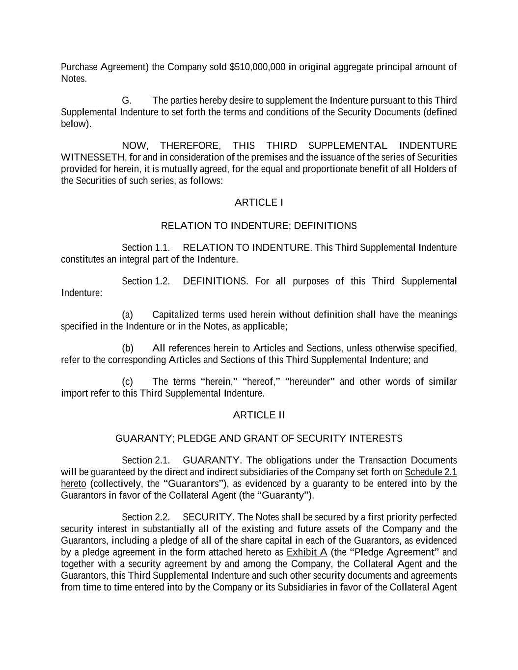 Purchase Agreement) the Company sold $510,000,000 in original aggregate principal amount of Notes. G. The parties hereby desire to supplement the Indenture pursuant to this Third Supplemental Indenture to set forth the terms and conditions of the Security Documents (defined below). NOW, THEREFORE, THIS THIRD SUPPLEMENTAL INDENTURE WITNESSETH, for and in consideration of the premises and the issuance of the series of Securities provided for herein, it is mutually agreed, for the equal and proportionate benefit of all Holders of the Securities of such series, as follows: ARTICLE I RELATION TO INDENTURE; DEFINITIONS Section 1.1. RELATION TO INDENTURE. This Third Supplemental Indenture constitutes an integral part of the Indenture. Section 1.2. DEFINITIONS. For all purposes of this Third Supplemental Indenture: (a) Capitalized terms used herein without definition shall have the meanings specified in the Indenture or in the Notes, as applicable; (b) All references herein to Articles and Sections, unless otherwise specified, refer to the corresponding Articles and Sections of this Third Supplemental Indenture; and (c) The terms “herein,” “hereof,” “hereunder” and other words of similar import refer to this Third Supplemental Indenture. ARTICLE II GUARANTY; PLEDGE AND GRANT OF SECURITY INTERESTS Section 2.1. GUARANTY. The obligations under the Transaction Documents will be guaranteed by the direct and indirect subsidiaries of the Company set forth on Schedule 2.1 hereto (collectively, the “Guarantors”), as evidenced by a guaranty to be entered into by the Guarantors in favor of the Collateral Agent (the “Guaranty”). Section 2.2. SECURITY. The Notes shall be secured by a first priority perfected security interest in substantially all of the existing and future assets of the Company and the Guarantors, including a pledge of all of the share capital in each of the Guarantors, as evidenced by a pledge agreement in the form attached hereto as Exhibit A (the “Pledge Agreement” and together with a security agreement by and among the Company, the Collateral Agent and the Guarantors, this Third Supplemental Indenture and such other security documents and agreements from time to time entered into by the Company or its Subsidiaries in favor of the Collateral Agent