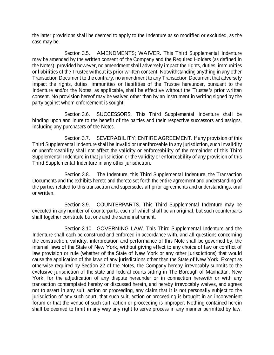 the latter provisions shall be deemed to apply to the Indenture as so modified or excluded, as the case may be. Section 3.5. AMENDMENTS; WAIVER. This Third Supplemental Indenture may be amended by the written consent of the Company and the Required Holders (as defined in the Notes); provided however, no amendment shall adversely impact the rights, duties, immunities or liabilities of the Trustee without its prior written consent. Notwithstanding anything in any other Transaction Document to the contrary, no amendment to any Transaction Document that adversely impact the rights, duties, immunities or liabilities of the Trustee hereunder, pursuant to the Indenture and/or the Notes, as applicable, shall be effective without the Trustee’s prior written consent. No provision hereof may be waived other than by an instrument in writing signed by the party against whom enforcement is sought. Section 3.6. SUCCESSORS. This Third Supplemental Indenture shall be binding upon and inure to the benefit of the parties and their respective successors and assigns, including any purchasers of the Notes. Section 3.7. SEVERABILITY; ENTIRE AGREEMENT. If any provision of this Third Supplemental Indenture shall be invalid or unenforceable in any jurisdiction, such invalidity or unenforceability shall not affect the validity or enforceability of the remainder of this Third Supplemental Indenture in that jurisdiction or the validity or enforceability of any provision of this Third Supplemental Indenture in any other jurisdiction. Section 3.8. The Indenture, this Third Supplemental Indenture, the Transaction Documents and the exhibits hereto and thereto set forth the entire agreement and understanding of the parties related to this transaction and supersedes all prior agreements and understandings, oral or written. Section 3.9. COUNTERPARTS. This Third Supplemental Indenture may be executed in any number of counterparts, each of which shall be an original, but such counterparts shall together constitute but one and the same instrument. Section 3.10. GOVERNING LAW. This Third Supplemental Indenture and the Indenture shall each be construed and enforced in accordance with, and all questions concerning the construction, validity, interpretation and performance of this Note shall be governed by, the internal laws of the State of New York, without giving effect to any choice of law or conflict of law provision or rule (whether of the State of New York or any other jurisdictions) that would cause the application of the laws of any jurisdictions other than the State of New York. Except as otherwise required by Section 22 of the Notes, the Company hereby irrevocably submits to the exclusive jurisdiction of the state and federal courts sitting in The Borough of Manhattan, New York, for the adjudication of any dispute hereunder or in connection herewith or with any transaction contemplated hereby or discussed herein, and hereby irrevocably waives, and agrees not to assert in any suit, action or proceeding, any claim that it is not personally subject to the jurisdiction of any such court, that such suit, action or proceeding is brought in an inconvenient forum or that the venue of such suit, action or proceeding is improper. Nothing contained herein shall be deemed to limit in any way any right to serve process in any manner permitted by law.
