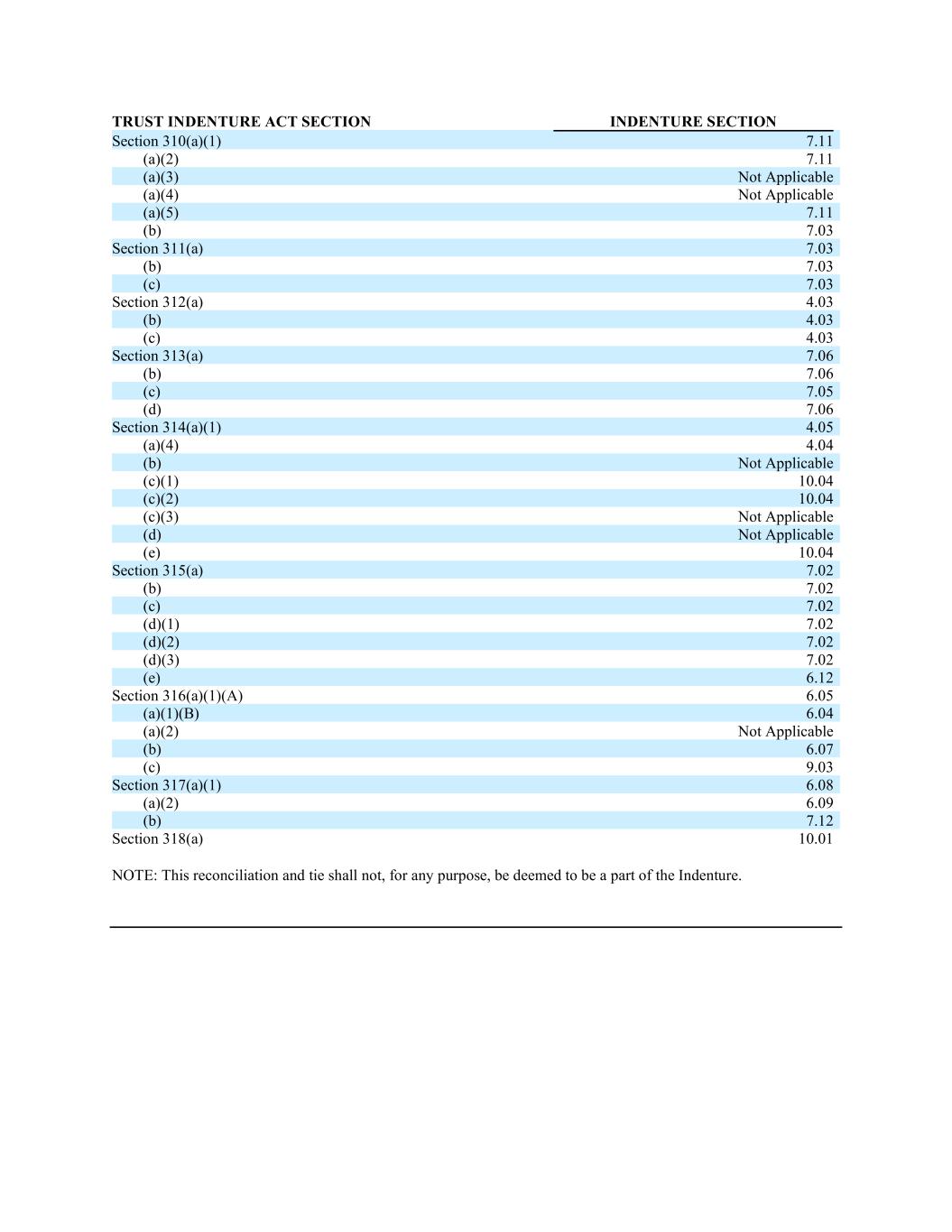 TRUST INDENTURE ACT SECTION INDENTURE SECTION Section 310(a)(1) 7.11 (a)(2) 7.11 (a)(3) Not Applicable (a)(4) Not Applicable (a)(5) 7.11 (b) 7.03 Section 311(a) 7.03 (b) 7.03 (c) 7.03 Section 312(a) 4.03 (b) 4.03 (c) 4.03 Section 313(a) 7.06 (b) 7.06 (c) 7.05 (d) 7.06 Section 314(a)(1) 4.05 (a)(4) 4.04 (b) Not Applicable (c)(1) 10.04 (c)(2) 10.04 (c)(3) Not Applicable (d) Not Applicable (e) 10.04 Section 315(a) 7.02 (b) 7.02 (c) 7.02 (d)(1) 7.02 (d)(2) 7.02 (d)(3) 7.02 (e) 6.12 Section 316(a)(1)(A) 6.05 (a)(1)(B) 6.04 (a)(2) Not Applicable (b) 6.07 (c) 9.03 Section 317(a)(1) 6.08 (a)(2) 6.09 (b) 7.12 Section 318(a) 10.01 NOTE: This reconciliation and tie shall not, for any purpose, be deemed to be a part of the Indenture.