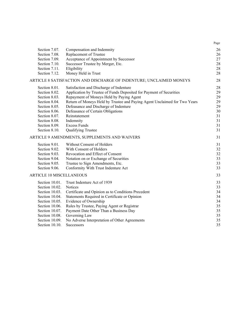 Page Section 7.07. Compensation and Indemnity 26 Section 7.08. Replacement of Trustee 26 Section 7.09. Acceptance of Appointment by Successor 27 Section 7.10. Successor Trustee by Merger, Etc. 28 Section 7.11. Eligibility 28 Section 7.12. Money Held in Trust 28 ARTICLE 8 SATISFACTION AND DISCHARGE OF INDENTURE; UNCLAIMED MONEYS 28 Section 8.01. Satisfaction and Discharge of Indenture 28 Section 8.02. Application by Trustee of Funds Deposited for Payment of Securities 29 Section 8.03. Repayment of Moneys Held by Paying Agent 29 Section 8.04. Return of Moneys Held by Trustee and Paying Agent Unclaimed for Two Years 29 Section 8.05. Defeasance and Discharge of Indenture 29 Section 8.06. Defeasance of Certain Obligations 30 Section 8.07. Reinstatement 31 Section 8.08. Indemnity 31 Section 8.09. Excess Funds 31 Section 8.10. Qualifying Trustee 31 ARTICLE 9 AMENDMENTS, SUPPLEMENTS AND WAIVERS 31 Section 9.01. Without Consent of Holders 31 Section 9.02. With Consent of Holders 32 Section 9.03. Revocation and Effect of Consent 32 Section 9.04. Notation on or Exchange of Securities 33 Section 9.05. Trustee to Sign Amendments, Etc. 33 Section 9.06. Conformity With Trust Indenture Act 33 ARTICLE 10 MISCELLANEOUS 33 Section 10.01. Trust Indenture Act of 1939 33 Section 10.02. Notices 33 Section 10.03. Certificate and Opinion as to Conditions Precedent 34 Section 10.04. Statements Required in Certificate or Opinion 34 Section 10.05. Evidence of Ownership 34 Section 10.06. Rules by Trustee, Paying Agent or Registrar 35 Section 10.07. Payment Date Other Than a Business Day 35 Section 10.08. Governing Law 35 Section 10.09. No Adverse Interpretation of Other Agreements 35 Section 10.10. Successors 35