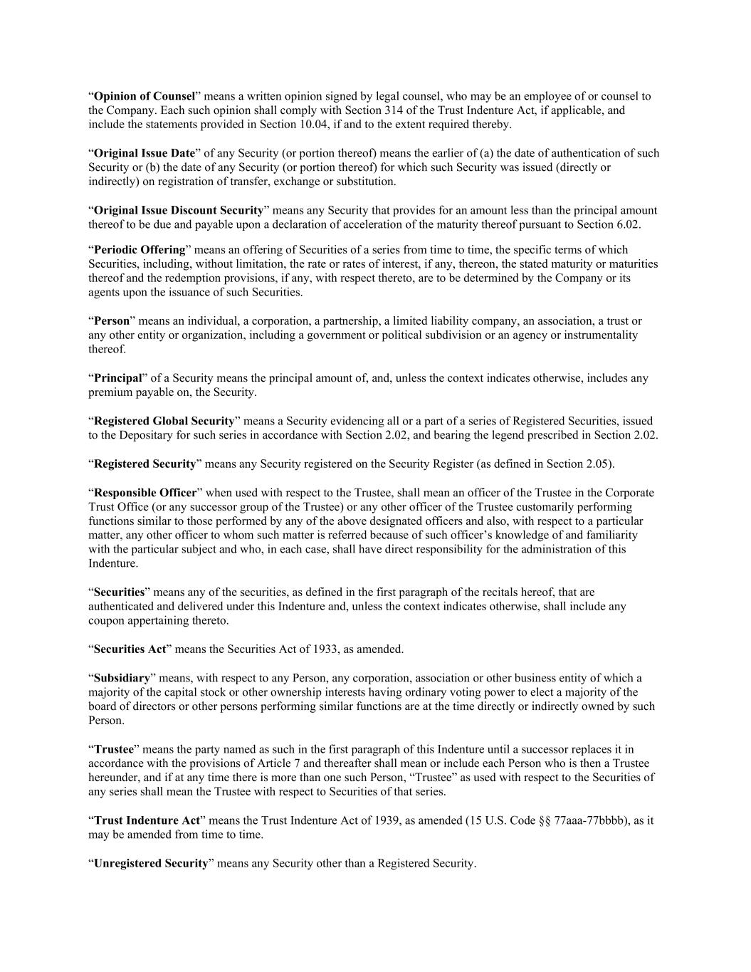 “Opinion of Counsel” means a written opinion signed by legal counsel, who may be an employee of or counsel to the Company. Each such opinion shall comply with Section 314 of the Trust Indenture Act, if applicable, and include the statements provided in Section 10.04, if and to the extent required thereby. “Original Issue Date” of any Security (or portion thereof) means the earlier of (a) the date of authentication of such Security or (b) the date of any Security (or portion thereof) for which such Security was issued (directly or indirectly) on registration of transfer, exchange or substitution. “Original Issue Discount Security” means any Security that provides for an amount less than the principal amount thereof to be due and payable upon a declaration of acceleration of the maturity thereof pursuant to Section 6.02. “Periodic Offering” means an offering of Securities of a series from time to time, the specific terms of which Securities, including, without limitation, the rate or rates of interest, if any, thereon, the stated maturity or maturities thereof and the redemption provisions, if any, with respect thereto, are to be determined by the Company or its agents upon the issuance of such Securities. “Person” means an individual, a corporation, a partnership, a limited liability company, an association, a trust or any other entity or organization, including a government or political subdivision or an agency or instrumentality thereof. “Principal” of a Security means the principal amount of, and, unless the context indicates otherwise, includes any premium payable on, the Security. “Registered Global Security” means a Security evidencing all or a part of a series of Registered Securities, issued to the Depositary for such series in accordance with Section 2.02, and bearing the legend prescribed in Section 2.02. “Registered Security” means any Security registered on the Security Register (as defined in Section 2.05). “Responsible Officer” when used with respect to the Trustee, shall mean an officer of the Trustee in the Corporate Trust Office (or any successor group of the Trustee) or any other officer of the Trustee customarily performing functions similar to those performed by any of the above designated officers and also, with respect to a particular matter, any other officer to whom such matter is referred because of such officer’s knowledge of and familiarity with the particular subject and who, in each case, shall have direct responsibility for the administration of this Indenture. “Securities” means any of the securities, as defined in the first paragraph of the recitals hereof, that are authenticated and delivered under this Indenture and, unless the context indicates otherwise, shall include any coupon appertaining thereto. “Securities Act” means the Securities Act of 1933, as amended. “Subsidiary” means, with respect to any Person, any corporation, association or other business entity of which a majority of the capital stock or other ownership interests having ordinary voting power to elect a majority of the board of directors or other persons performing similar functions are at the time directly or indirectly owned by such Person. “Trustee” means the party named as such in the first paragraph of this Indenture until a successor replaces it in accordance with the provisions of Article 7 and thereafter shall mean or include each Person who is then a Trustee hereunder, and if at any time there is more than one such Person, “Trustee” as used with respect to the Securities of any series shall mean the Trustee with respect to Securities of that series. “Trust Indenture Act” means the Trust Indenture Act of 1939, as amended (15 U.S. Code §§ 77aaa-77bbbb), as it may be amended from time to time. “Unregistered Security” means any Security other than a Registered Security.