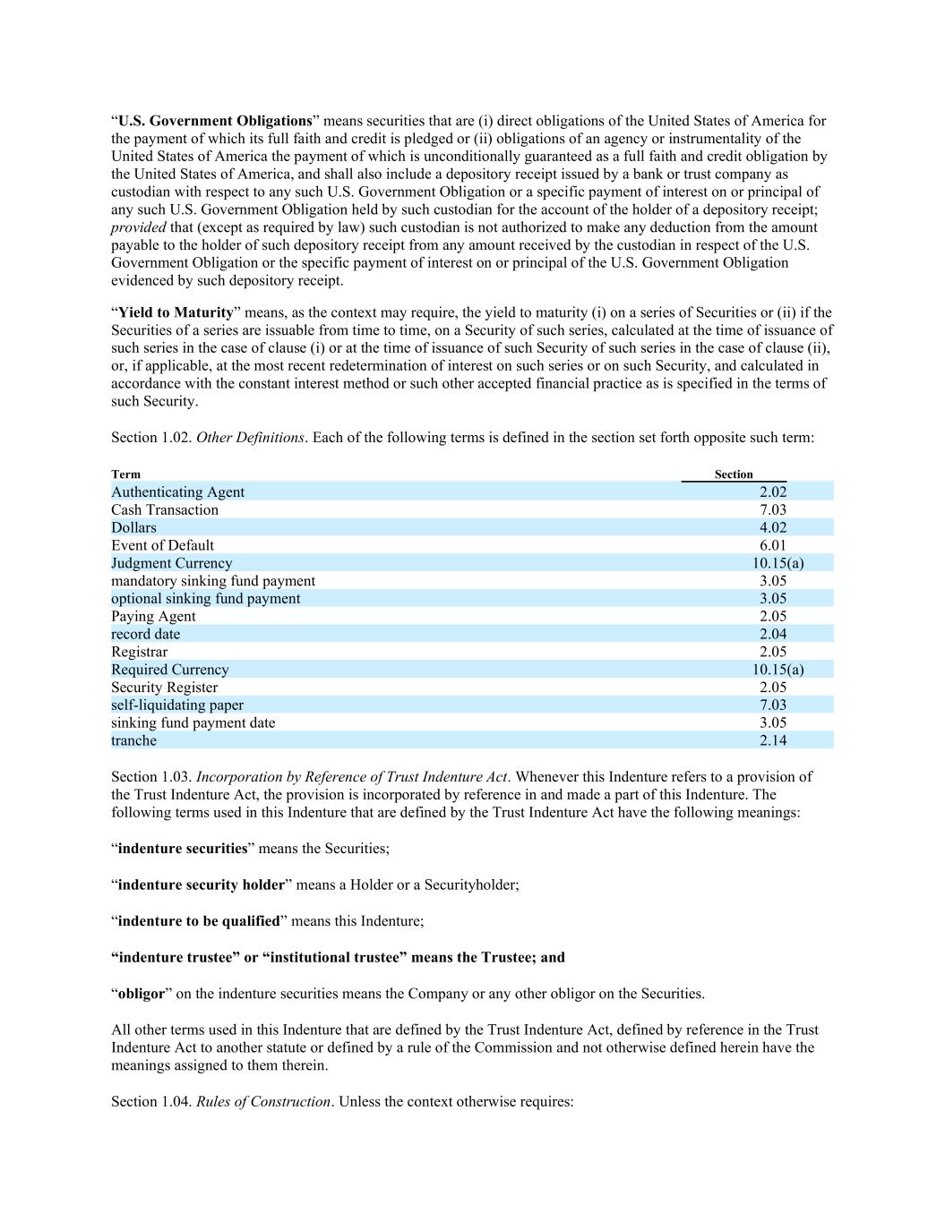 “U.S. Government Obligations” means securities that are (i) direct obligations of the United States of America for the payment of which its full faith and credit is pledged or (ii) obligations of an agency or instrumentality of the United States of America the payment of which is unconditionally guaranteed as a full faith and credit obligation by the United States of America, and shall also include a depository receipt issued by a bank or trust company as custodian with respect to any such U.S. Government Obligation or a specific payment of interest on or principal of any such U.S. Government Obligation held by such custodian for the account of the holder of a depository receipt; provided that (except as required by law) such custodian is not authorized to make any deduction from the amount payable to the holder of such depository receipt from any amount received by the custodian in respect of the U.S. Government Obligation or the specific payment of interest on or principal of the U.S. Government Obligation evidenced by such depository receipt. “Yield to Maturity” means, as the context may require, the yield to maturity (i) on a series of Securities or (ii) if the Securities of a series are issuable from time to time, on a Security of such series, calculated at the time of issuance of such series in the case of clause (i) or at the time of issuance of such Security of such series in the case of clause (ii), or, if applicable, at the most recent redetermination of interest on such series or on such Security, and calculated in accordance with the constant interest method or such other accepted financial practice as is specified in the terms of such Security. Section 1.02. Other Definitions. Each of the following terms is defined in the section set forth opposite such term: Term Section Authenticating Agent 2.02 Cash Transaction 7.03 Dollars 4.02 Event of Default 6.01 Judgment Currency 10.15(a) mandatory sinking fund payment 3.05 optional sinking fund payment 3.05 Paying Agent 2.05 record date 2.04 Registrar 2.05 Required Currency 10.15(a) Security Register 2.05 self-liquidating paper 7.03 sinking fund payment date 3.05 tranche 2.14 Section 1.03. Incorporation by Reference of Trust Indenture Act. Whenever this Indenture refers to a provision of the Trust Indenture Act, the provision is incorporated by reference in and made a part of this Indenture. The following terms used in this Indenture that are defined by the Trust Indenture Act have the following meanings: “indenture securities” means the Securities; “indenture security holder” means a Holder or a Securityholder; “indenture to be qualified” means this Indenture; “indenture trustee” or “institutional trustee” means the Trustee; and “obligor” on the indenture securities means the Company or any other obligor on the Securities. All other terms used in this Indenture that are defined by the Trust Indenture Act, defined by reference in the Trust Indenture Act to another statute or defined by a rule of the Commission and not otherwise defined herein have the meanings assigned to them therein. Section 1.04. Rules of Construction. Unless the context otherwise requires:
