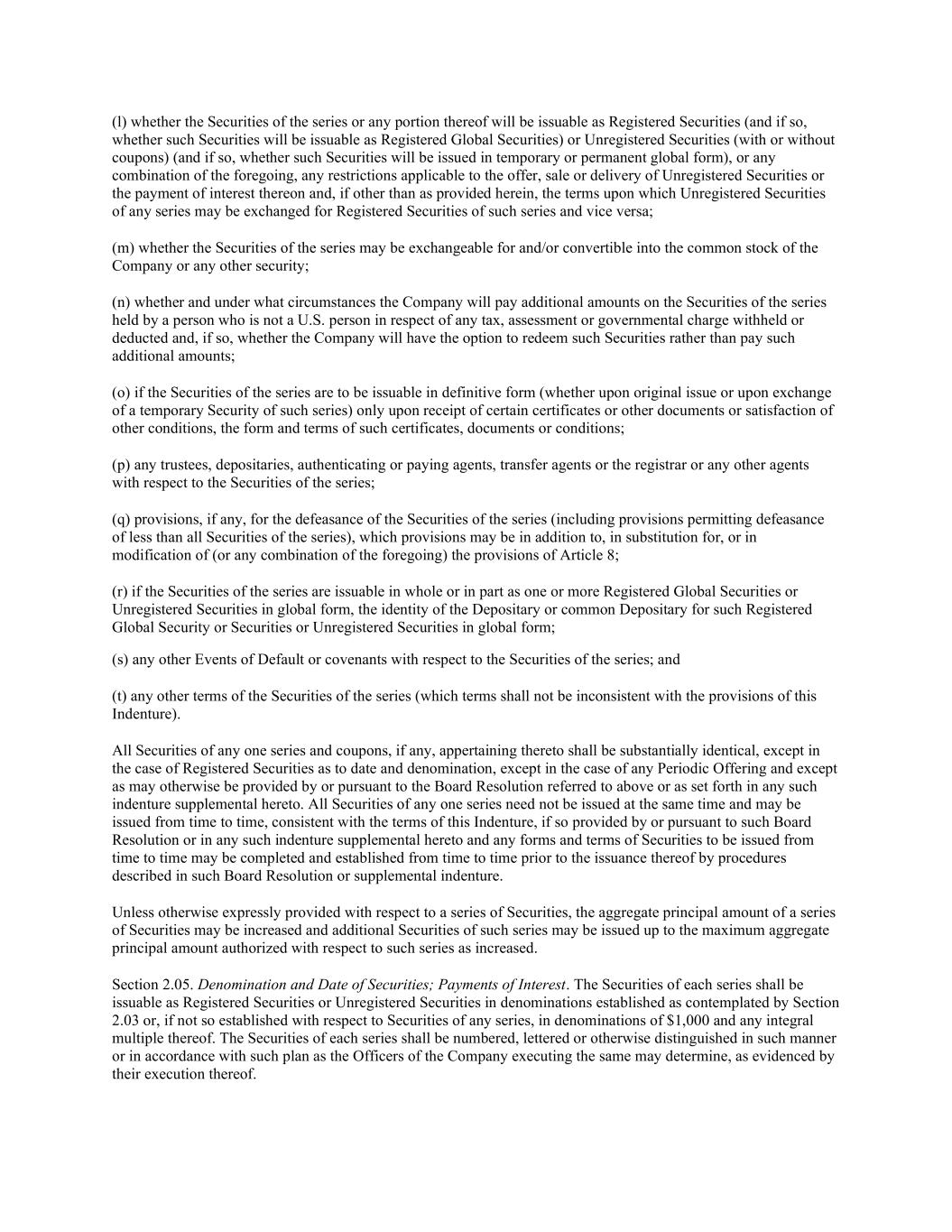 (l) whether the Securities of the series or any portion thereof will be issuable as Registered Securities (and if so, whether such Securities will be issuable as Registered Global Securities) or Unregistered Securities (with or without coupons) (and if so, whether such Securities will be issued in temporary or permanent global form), or any combination of the foregoing, any restrictions applicable to the offer, sale or delivery of Unregistered Securities or the payment of interest thereon and, if other than as provided herein, the terms upon which Unregistered Securities of any series may be exchanged for Registered Securities of such series and vice versa; (m) whether the Securities of the series may be exchangeable for and/or convertible into the common stock of the Company or any other security; (n) whether and under what circumstances the Company will pay additional amounts on the Securities of the series held by a person who is not a U.S. person in respect of any tax, assessment or governmental charge withheld or deducted and, if so, whether the Company will have the option to redeem such Securities rather than pay such additional amounts; (o) if the Securities of the series are to be issuable in definitive form (whether upon original issue or upon exchange of a temporary Security of such series) only upon receipt of certain certificates or other documents or satisfaction of other conditions, the form and terms of such certificates, documents or conditions; (p) any trustees, depositaries, authenticating or paying agents, transfer agents or the registrar or any other agents with respect to the Securities of the series; (q) provisions, if any, for the defeasance of the Securities of the series (including provisions permitting defeasance of less than all Securities of the series), which provisions may be in addition to, in substitution for, or in modification of (or any combination of the foregoing) the provisions of Article 8; (r) if the Securities of the series are issuable in whole or in part as one or more Registered Global Securities or Unregistered Securities in global form, the identity of the Depositary or common Depositary for such Registered Global Security or Securities or Unregistered Securities in global form; (s) any other Events of Default or covenants with respect to the Securities of the series; and (t) any other terms of the Securities of the series (which terms shall not be inconsistent with the provisions of this Indenture). All Securities of any one series and coupons, if any, appertaining thereto shall be substantially identical, except in the case of Registered Securities as to date and denomination, except in the case of any Periodic Offering and except as may otherwise be provided by or pursuant to the Board Resolution referred to above or as set forth in any such indenture supplemental hereto. All Securities of any one series need not be issued at the same time and may be issued from time to time, consistent with the terms of this Indenture, if so provided by or pursuant to such Board Resolution or in any such indenture supplemental hereto and any forms and terms of Securities to be issued from time to time may be completed and established from time to time prior to the issuance thereof by procedures described in such Board Resolution or supplemental indenture. Unless otherwise expressly provided with respect to a series of Securities, the aggregate principal amount of a series of Securities may be increased and additional Securities of such series may be issued up to the maximum aggregate principal amount authorized with respect to such series as increased. Section 2.05. Denomination and Date of Securities; Payments of Interest. The Securities of each series shall be issuable as Registered Securities or Unregistered Securities in denominations established as contemplated by Section 2.03 or, if not so established with respect to Securities of any series, in denominations of $1,000 and any integral multiple thereof. The Securities of each series shall be numbered, lettered or otherwise distinguished in such manner or in accordance with such plan as the Officers of the Company executing the same may determine, as evidenced by their execution thereof.