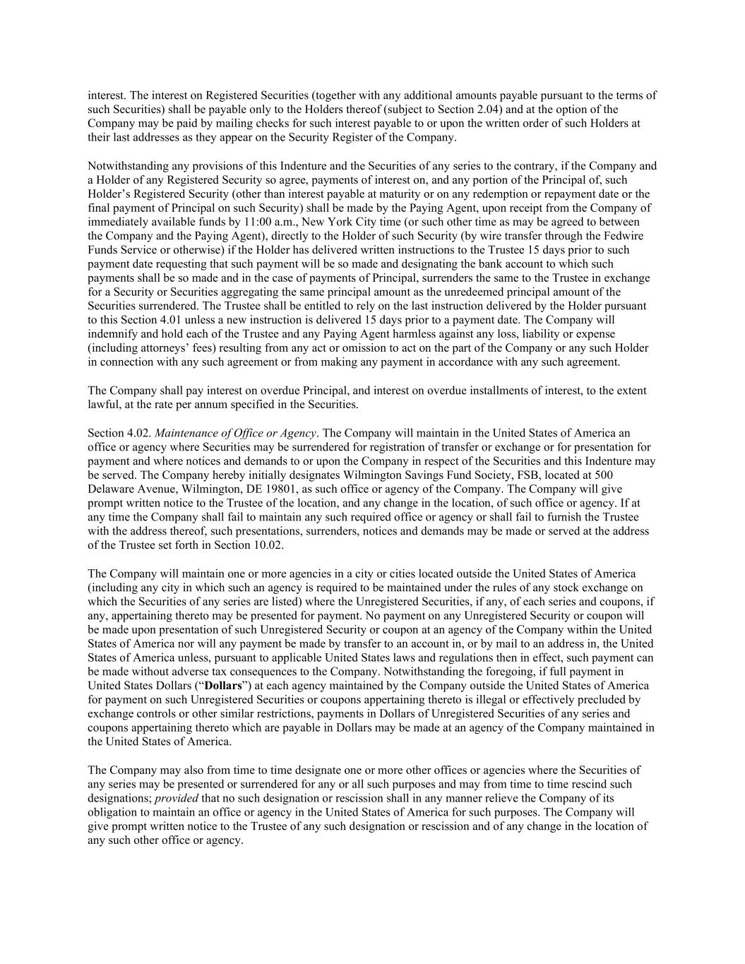 interest. The interest on Registered Securities (together with any additional amounts payable pursuant to the terms of such Securities) shall be payable only to the Holders thereof (subject to Section 2.04) and at the option of the Company may be paid by mailing checks for such interest payable to or upon the written order of such Holders at their last addresses as they appear on the Security Register of the Company. Notwithstanding any provisions of this Indenture and the Securities of any series to the contrary, if the Company and a Holder of any Registered Security so agree, payments of interest on, and any portion of the Principal of, such Holder’s Registered Security (other than interest payable at maturity or on any redemption or repayment date or the final payment of Principal on such Security) shall be made by the Paying Agent, upon receipt from the Company of immediately available funds by 11:00 a.m., New York City time (or such other time as may be agreed to between the Company and the Paying Agent), directly to the Holder of such Security (by wire transfer through the Fedwire Funds Service or otherwise) if the Holder has delivered written instructions to the Trustee 15 days prior to such payment date requesting that such payment will be so made and designating the bank account to which such payments shall be so made and in the case of payments of Principal, surrenders the same to the Trustee in exchange for a Security or Securities aggregating the same principal amount as the unredeemed principal amount of the Securities surrendered. The Trustee shall be entitled to rely on the last instruction delivered by the Holder pursuant to this Section 4.01 unless a new instruction is delivered 15 days prior to a payment date. The Company will indemnify and hold each of the Trustee and any Paying Agent harmless against any loss, liability or expense (including attorneys’ fees) resulting from any act or omission to act on the part of the Company or any such Holder in connection with any such agreement or from making any payment in accordance with any such agreement. The Company shall pay interest on overdue Principal, and interest on overdue installments of interest, to the extent lawful, at the rate per annum specified in the Securities. Section 4.02. Maintenance of Office or Agency. The Company will maintain in the United States of America an office or agency where Securities may be surrendered for registration of transfer or exchange or for presentation for payment and where notices and demands to or upon the Company in respect of the Securities and this Indenture may be served. The Company hereby initially designates Wilmington Savings Fund Society, FSB, located at 500 Delaware Avenue, Wilmington, DE 19801, as such office or agency of the Company. The Company will give prompt written notice to the Trustee of the location, and any change in the location, of such office or agency. If at any time the Company shall fail to maintain any such required office or agency or shall fail to furnish the Trustee with the address thereof, such presentations, surrenders, notices and demands may be made or served at the address of the Trustee set forth in Section 10.02. The Company will maintain one or more agencies in a city or cities located outside the United States of America (including any city in which such an agency is required to be maintained under the rules of any stock exchange on which the Securities of any series are listed) where the Unregistered Securities, if any, of each series and coupons, if any, appertaining thereto may be presented for payment. No payment on any Unregistered Security or coupon will be made upon presentation of such Unregistered Security or coupon at an agency of the Company within the United States of America nor will any payment be made by transfer to an account in, or by mail to an address in, the United States of America unless, pursuant to applicable United States laws and regulations then in effect, such payment can be made without adverse tax consequences to the Company. Notwithstanding the foregoing, if full payment in United States Dollars (“Dollars”) at each agency maintained by the Company outside the United States of America for payment on such Unregistered Securities or coupons appertaining thereto is illegal or effectively precluded by exchange controls or other similar restrictions, payments in Dollars of Unregistered Securities of any series and coupons appertaining thereto which are payable in Dollars may be made at an agency of the Company maintained in the United States of America. The Company may also from time to time designate one or more other offices or agencies where the Securities of any series may be presented or surrendered for any or all such purposes and may from time to time rescind such designations; provided that no such designation or rescission shall in any manner relieve the Company of its obligation to maintain an office or agency in the United States of America for such purposes. The Company will give prompt written notice to the Trustee of any such designation or rescission and of any change in the location of any such other office or agency.