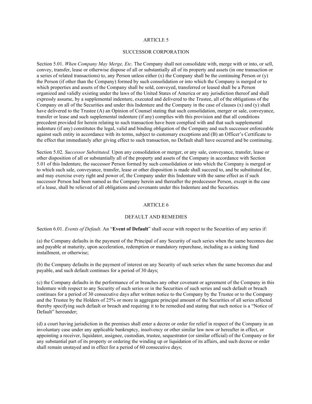 ARTICLE 5 SUCCESSOR CORPORATION Section 5.01. When Company May Merge, Etc. The Company shall not consolidate with, merge with or into, or sell, convey, transfer, lease or otherwise dispose of all or substantially all of its property and assets (in one transaction or a series of related transactions) to, any Person unless either (x) the Company shall be the continuing Person or (y) the Person (if other than the Company) formed by such consolidation or into which the Company is merged or to which properties and assets of the Company shall be sold, conveyed, transferred or leased shall be a Person organized and validly existing under the laws of the United States of America or any jurisdiction thereof and shall expressly assume, by a supplemental indenture, executed and delivered to the Trustee, all of the obligations of the Company on all of the Securities and under this Indenture and the Company in the case of clauses (x) and (y) shall have delivered to the Trustee (A) an Opinion of Counsel stating that such consolidation, merger or sale, conveyance, transfer or lease and such supplemental indenture (if any) complies with this provision and that all conditions precedent provided for herein relating to such transaction have been complied with and that such supplemental indenture (if any) constitutes the legal, valid and binding obligation of the Company and such successor enforceable against such entity in accordance with its terms, subject to customary exceptions and (B) an Officer’s Certificate to the effect that immediately after giving effect to such transaction, no Default shall have occurred and be continuing. Section 5.02. Successor Substituted. Upon any consolidation or merger, or any sale, conveyance, transfer, lease or other disposition of all or substantially all of the property and assets of the Company in accordance with Section 5.01 of this Indenture, the successor Person formed by such consolidation or into which the Company is merged or to which such sale, conveyance, transfer, lease or other disposition is made shall succeed to, and be substituted for, and may exercise every right and power of, the Company under this Indenture with the same effect as if such successor Person had been named as the Company herein and thereafter the predecessor Person, except in the case of a lease, shall be relieved of all obligations and covenants under this Indenture and the Securities. ARTICLE 6 DEFAULT AND REMEDIES Section 6.01. Events of Default. An “Event of Default” shall occur with respect to the Securities of any series if: (a) the Company defaults in the payment of the Principal of any Security of such series when the same becomes due and payable at maturity, upon acceleration, redemption or mandatory repurchase, including as a sinking fund installment, or otherwise; (b) the Company defaults in the payment of interest on any Security of such series when the same becomes due and payable, and such default continues for a period of 30 days; (c) the Company defaults in the performance of or breaches any other covenant or agreement of the Company in this Indenture with respect to any Security of such series or in the Securities of such series and such default or breach continues for a period of 30 consecutive days after written notice to the Company by the Trustee or to the Company and the Trustee by the Holders of 25% or more in aggregate principal amount of the Securities of all series affected thereby specifying such default or breach and requiring it to be remedied and stating that such notice is a “Notice of Default” hereunder; (d) a court having jurisdiction in the premises shall enter a decree or order for relief in respect of the Company in an involuntary case under any applicable bankruptcy, insolvency or other similar law now or hereafter in effect, or appointing a receiver, liquidator, assignee, custodian, trustee, sequestrator (or similar official) of the Company or for any substantial part of its property or ordering the winding up or liquidation of its affairs, and such decree or order shall remain unstayed and in effect for a period of 60 consecutive days;