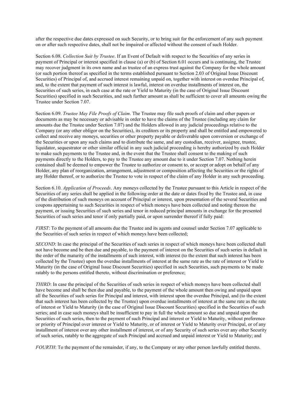 after the respective due dates expressed on such Security, or to bring suit for the enforcement of any such payment on or after such respective dates, shall not be impaired or affected without the consent of such Holder. Section 6.08. Collection Suit by Trustee. If an Event of Default with respect to the Securities of any series in payment of Principal or interest specified in clause (a) or (b) of Section 6.01 occurs and is continuing, the Trustee may recover judgment in its own name and as trustee of an express trust against the Company for the whole amount (or such portion thereof as specified in the terms established pursuant to Section 2.03 of Original Issue Discount Securities) of Principal of, and accrued interest remaining unpaid on, together with interest on overdue Principal of, and, to the extent that payment of such interest is lawful, interest on overdue installments of interest on, the Securities of such series, in each case at the rate or Yield to Maturity (in the case of Original Issue Discount Securities) specified in such Securities, and such further amount as shall be sufficient to cover all amounts owing the Trustee under Section 7.07. Section 6.09. Trustee May File Proofs of Claim. The Trustee may file such proofs of claim and other papers or documents as may be necessary or advisable in order to have the claims of the Trustee (including any claim for amounts due the Trustee under Section 7.07) and the Holders allowed in any judicial proceedings relative to the Company (or any other obligor on the Securities), its creditors or its property and shall be entitled and empowered to collect and receive any moneys, securities or other property payable or deliverable upon conversion or exchange of the Securities or upon any such claims and to distribute the same, and any custodian, receiver, assignee, trustee, liquidator, sequestrator or other similar official in any such judicial proceeding is hereby authorized by each Holder to make such payments to the Trustee and, in the event that the Trustee shall consent to the making of such payments directly to the Holders, to pay to the Trustee any amount due to it under Section 7.07. Nothing herein contained shall be deemed to empower the Trustee to authorize or consent to, or accept or adopt on behalf of any Holder, any plan of reorganization, arrangement, adjustment or composition affecting the Securities or the rights of any Holder thereof, or to authorize the Trustee to vote in respect of the claim of any Holder in any such proceeding. Section 6.10. Application of Proceeds. Any moneys collected by the Trustee pursuant to this Article in respect of the Securities of any series shall be applied in the following order at the date or dates fixed by the Trustee and, in case of the distribution of such moneys on account of Principal or interest, upon presentation of the several Securities and coupons appertaining to such Securities in respect of which moneys have been collected and noting thereon the payment, or issuing Securities of such series and tenor in reduced principal amounts in exchange for the presented Securities of such series and tenor if only partially paid, or upon surrender thereof if fully paid: FIRST: To the payment of all amounts due the Trustee and its agents and counsel under Section 7.07 applicable to the Securities of such series in respect of which moneys have been collected; SECOND: In case the principal of the Securities of such series in respect of which moneys have been collected shall not have become and be then due and payable, to the payment of interest on the Securities of such series in default in the order of the maturity of the installments of such interest, with interest (to the extent that such interest has been collected by the Trustee) upon the overdue installments of interest at the same rate as the rate of interest or Yield to Maturity (in the case of Original Issue Discount Securities) specified in such Securities, such payments to be made ratably to the persons entitled thereto, without discrimination or preference; THIRD: In case the principal of the Securities of such series in respect of which moneys have been collected shall have become and shall be then due and payable, to the payment of the whole amount then owing and unpaid upon all the Securities of such series for Principal and interest, with interest upon the overdue Principal, and (to the extent that such interest has been collected by the Trustee) upon overdue installments of interest at the same rate as the rate of interest or Yield to Maturity (in the case of Original Issue Discount Securities) specified in the Securities of such series; and in case such moneys shall be insufficient to pay in full the whole amount so due and unpaid upon the Securities of such series, then to the payment of such Principal and interest or Yield to Maturity, without preference or priority of Principal over interest or Yield to Maturity, or of interest or Yield to Maturity over Principal, or of any installment of interest over any other installment of interest, or of any Security of such series over any other Security of such series, ratably to the aggregate of such Principal and accrued and unpaid interest or Yield to Maturity; and FOURTH: To the payment of the remainder, if any, to the Company or any other person lawfully entitled thereto.