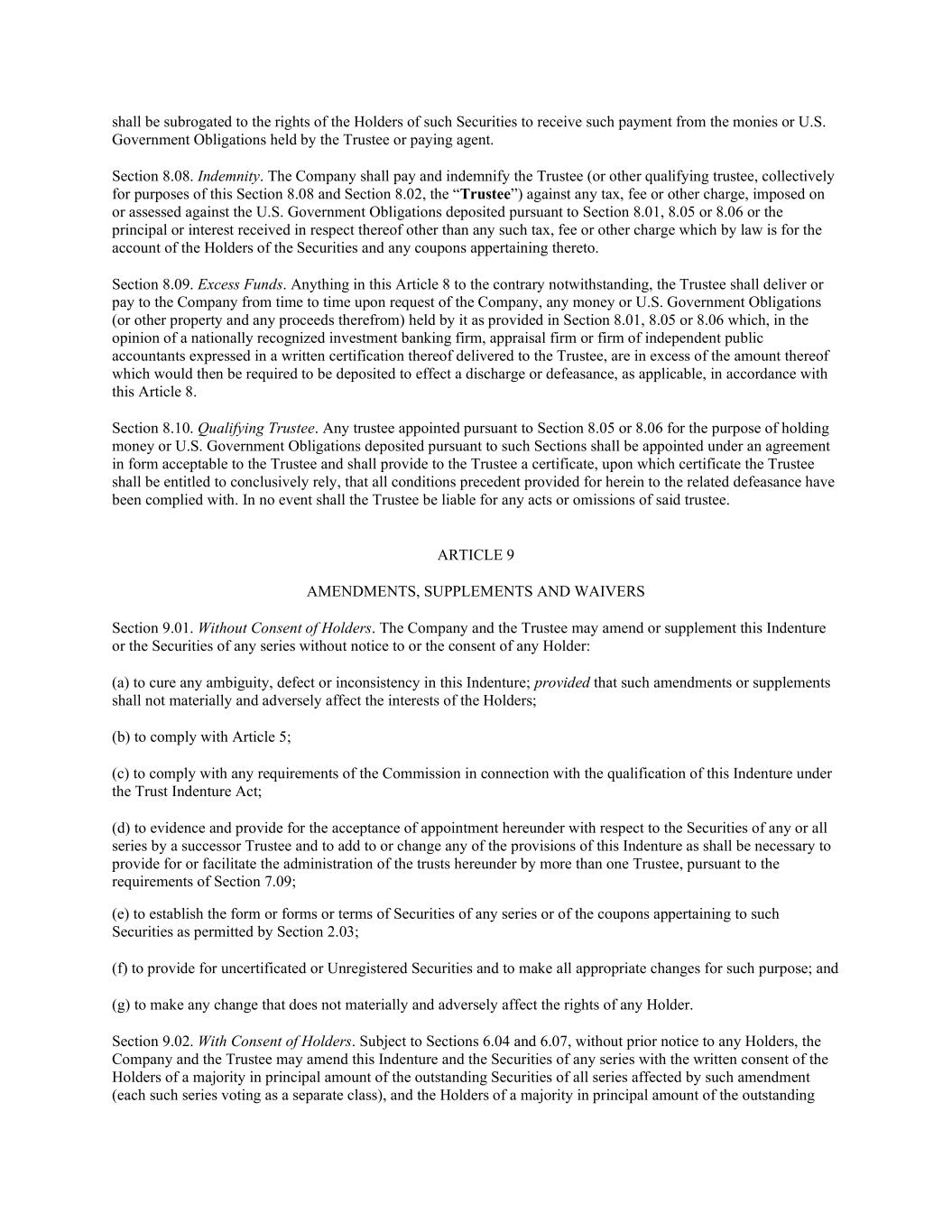 shall be subrogated to the rights of the Holders of such Securities to receive such payment from the monies or U.S. Government Obligations held by the Trustee or paying agent. Section 8.08. Indemnity. The Company shall pay and indemnify the Trustee (or other qualifying trustee, collectively for purposes of this Section 8.08 and Section 8.02, the “Trustee”) against any tax, fee or other charge, imposed on or assessed against the U.S. Government Obligations deposited pursuant to Section 8.01, 8.05 or 8.06 or the principal or interest received in respect thereof other than any such tax, fee or other charge which by law is for the account of the Holders of the Securities and any coupons appertaining thereto. Section 8.09. Excess Funds. Anything in this Article 8 to the contrary notwithstanding, the Trustee shall deliver or pay to the Company from time to time upon request of the Company, any money or U.S. Government Obligations (or other property and any proceeds therefrom) held by it as provided in Section 8.01, 8.05 or 8.06 which, in the opinion of a nationally recognized investment banking firm, appraisal firm or firm of independent public accountants expressed in a written certification thereof delivered to the Trustee, are in excess of the amount thereof which would then be required to be deposited to effect a discharge or defeasance, as applicable, in accordance with this Article 8. Section 8.10. Qualifying Trustee. Any trustee appointed pursuant to Section 8.05 or 8.06 for the purpose of holding money or U.S. Government Obligations deposited pursuant to such Sections shall be appointed under an agreement in form acceptable to the Trustee and shall provide to the Trustee a certificate, upon which certificate the Trustee shall be entitled to conclusively rely, that all conditions precedent provided for herein to the related defeasance have been complied with. In no event shall the Trustee be liable for any acts or omissions of said trustee. ARTICLE 9 AMENDMENTS, SUPPLEMENTS AND WAIVERS Section 9.01. Without Consent of Holders. The Company and the Trustee may amend or supplement this Indenture or the Securities of any series without notice to or the consent of any Holder: (a) to cure any ambiguity, defect or inconsistency in this Indenture; provided that such amendments or supplements shall not materially and adversely affect the interests of the Holders; (b) to comply with Article 5; (c) to comply with any requirements of the Commission in connection with the qualification of this Indenture under the Trust Indenture Act; (d) to evidence and provide for the acceptance of appointment hereunder with respect to the Securities of any or all series by a successor Trustee and to add to or change any of the provisions of this Indenture as shall be necessary to provide for or facilitate the administration of the trusts hereunder by more than one Trustee, pursuant to the requirements of Section 7.09; (e) to establish the form or forms or terms of Securities of any series or of the coupons appertaining to such Securities as permitted by Section 2.03; (f) to provide for uncertificated or Unregistered Securities and to make all appropriate changes for such purpose; and (g) to make any change that does not materially and adversely affect the rights of any Holder. Section 9.02. With Consent of Holders. Subject to Sections 6.04 and 6.07, without prior notice to any Holders, the Company and the Trustee may amend this Indenture and the Securities of any series with the written consent of the Holders of a majority in principal amount of the outstanding Securities of all series affected by such amendment (each such series voting as a separate class), and the Holders of a majority in principal amount of the outstanding