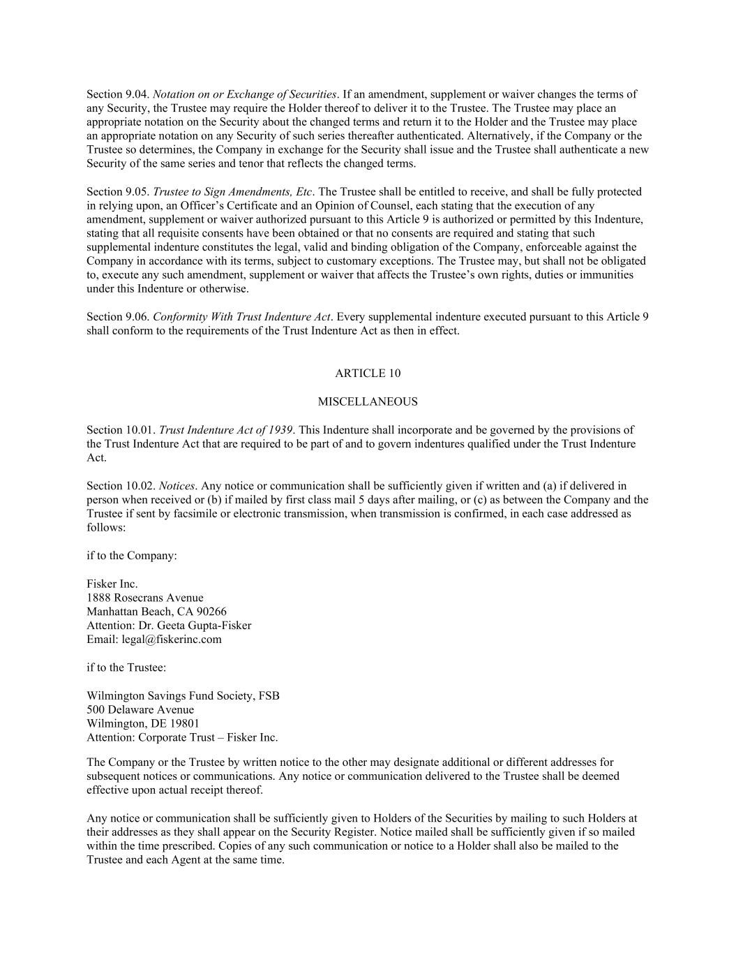Section 9.04. Notation on or Exchange of Securities. If an amendment, supplement or waiver changes the terms of any Security, the Trustee may require the Holder thereof to deliver it to the Trustee. The Trustee may place an appropriate notation on the Security about the changed terms and return it to the Holder and the Trustee may place an appropriate notation on any Security of such series thereafter authenticated. Alternatively, if the Company or the Trustee so determines, the Company in exchange for the Security shall issue and the Trustee shall authenticate a new Security of the same series and tenor that reflects the changed terms. Section 9.05. Trustee to Sign Amendments, Etc. The Trustee shall be entitled to receive, and shall be fully protected in relying upon, an Officer’s Certificate and an Opinion of Counsel, each stating that the execution of any amendment, supplement or waiver authorized pursuant to this Article 9 is authorized or permitted by this Indenture, stating that all requisite consents have been obtained or that no consents are required and stating that such supplemental indenture constitutes the legal, valid and binding obligation of the Company, enforceable against the Company in accordance with its terms, subject to customary exceptions. The Trustee may, but shall not be obligated to, execute any such amendment, supplement or waiver that affects the Trustee’s own rights, duties or immunities under this Indenture or otherwise. Section 9.06. Conformity With Trust Indenture Act. Every supplemental indenture executed pursuant to this Article 9 shall conform to the requirements of the Trust Indenture Act as then in effect. ARTICLE 10 MISCELLANEOUS Section 10.01. Trust Indenture Act of 1939. This Indenture shall incorporate and be governed by the provisions of the Trust Indenture Act that are required to be part of and to govern indentures qualified under the Trust Indenture Act. Section 10.02. Notices. Any notice or communication shall be sufficiently given if written and (a) if delivered in person when received or (b) if mailed by first class mail 5 days after mailing, or (c) as between the Company and the Trustee if sent by facsimile or electronic transmission, when transmission is confirmed, in each case addressed as follows: if to the Company: Fisker Inc. 1888 Rosecrans Avenue Manhattan Beach, CA 90266 Attention: Dr. Geeta Gupta-Fisker Email: legal@fiskerinc.com if to the Trustee: Wilmington Savings Fund Society, FSB 500 Delaware Avenue Wilmington, DE 19801 Attention: Corporate Trust – Fisker Inc. The Company or the Trustee by written notice to the other may designate additional or different addresses for subsequent notices or communications. Any notice or communication delivered to the Trustee shall be deemed effective upon actual receipt thereof. Any notice or communication shall be sufficiently given to Holders of the Securities by mailing to such Holders at their addresses as they shall appear on the Security Register. Notice mailed shall be sufficiently given if so mailed within the time prescribed. Copies of any such communication or notice to a Holder shall also be mailed to the Trustee and each Agent at the same time.