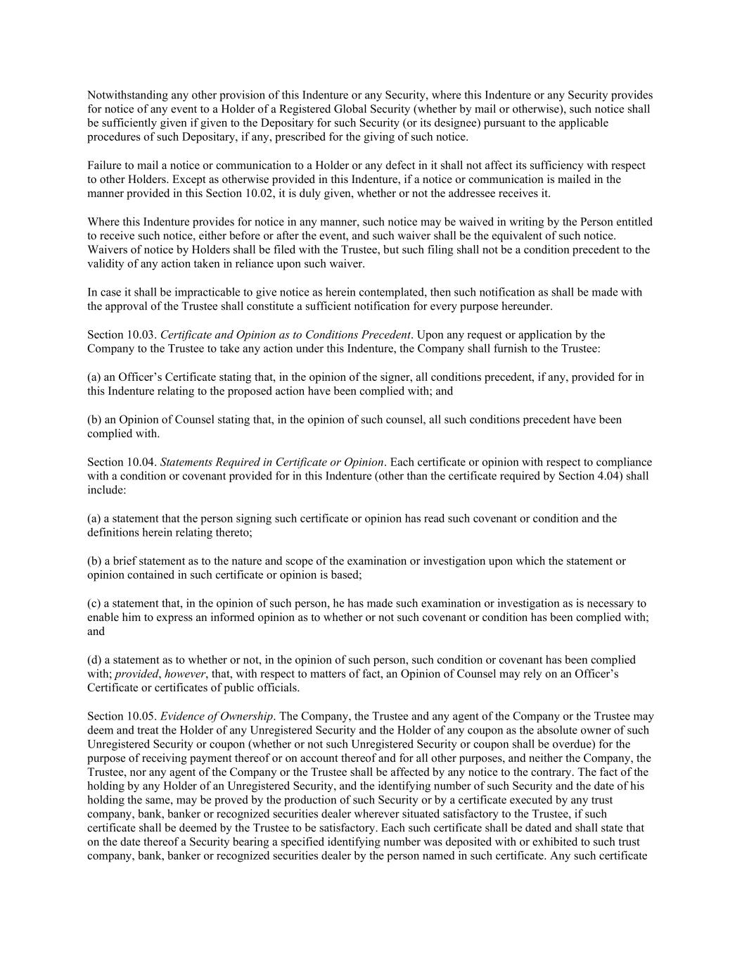 Notwithstanding any other provision of this Indenture or any Security, where this Indenture or any Security provides for notice of any event to a Holder of a Registered Global Security (whether by mail or otherwise), such notice shall be sufficiently given if given to the Depositary for such Security (or its designee) pursuant to the applicable procedures of such Depositary, if any, prescribed for the giving of such notice. Failure to mail a notice or communication to a Holder or any defect in it shall not affect its sufficiency with respect to other Holders. Except as otherwise provided in this Indenture, if a notice or communication is mailed in the manner provided in this Section 10.02, it is duly given, whether or not the addressee receives it. Where this Indenture provides for notice in any manner, such notice may be waived in writing by the Person entitled to receive such notice, either before or after the event, and such waiver shall be the equivalent of such notice. Waivers of notice by Holders shall be filed with the Trustee, but such filing shall not be a condition precedent to the validity of any action taken in reliance upon such waiver. In case it shall be impracticable to give notice as herein contemplated, then such notification as shall be made with the approval of the Trustee shall constitute a sufficient notification for every purpose hereunder. Section 10.03. Certificate and Opinion as to Conditions Precedent. Upon any request or application by the Company to the Trustee to take any action under this Indenture, the Company shall furnish to the Trustee: (a) an Officer’s Certificate stating that, in the opinion of the signer, all conditions precedent, if any, provided for in this Indenture relating to the proposed action have been complied with; and (b) an Opinion of Counsel stating that, in the opinion of such counsel, all such conditions precedent have been complied with. Section 10.04. Statements Required in Certificate or Opinion. Each certificate or opinion with respect to compliance with a condition or covenant provided for in this Indenture (other than the certificate required by Section 4.04) shall include: (a) a statement that the person signing such certificate or opinion has read such covenant or condition and the definitions herein relating thereto; (b) a brief statement as to the nature and scope of the examination or investigation upon which the statement or opinion contained in such certificate or opinion is based; (c) a statement that, in the opinion of such person, he has made such examination or investigation as is necessary to enable him to express an informed opinion as to whether or not such covenant or condition has been complied with; and (d) a statement as to whether or not, in the opinion of such person, such condition or covenant has been complied with; provided, however, that, with respect to matters of fact, an Opinion of Counsel may rely on an Officer’s Certificate or certificates of public officials. Section 10.05. Evidence of Ownership. The Company, the Trustee and any agent of the Company or the Trustee may deem and treat the Holder of any Unregistered Security and the Holder of any coupon as the absolute owner of such Unregistered Security or coupon (whether or not such Unregistered Security or coupon shall be overdue) for the purpose of receiving payment thereof or on account thereof and for all other purposes, and neither the Company, the Trustee, nor any agent of the Company or the Trustee shall be affected by any notice to the contrary. The fact of the holding by any Holder of an Unregistered Security, and the identifying number of such Security and the date of his holding the same, may be proved by the production of such Security or by a certificate executed by any trust company, bank, banker or recognized securities dealer wherever situated satisfactory to the Trustee, if such certificate shall be deemed by the Trustee to be satisfactory. Each such certificate shall be dated and shall state that on the date thereof a Security bearing a specified identifying number was deposited with or exhibited to such trust company, bank, banker or recognized securities dealer by the person named in such certificate. Any such certificate