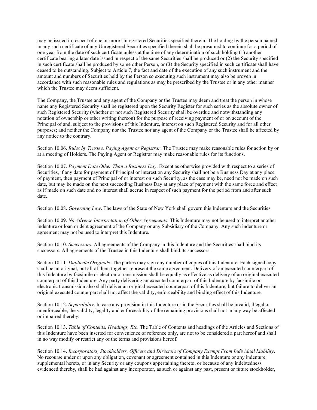 may be issued in respect of one or more Unregistered Securities specified therein. The holding by the person named in any such certificate of any Unregistered Securities specified therein shall be presumed to continue for a period of one year from the date of such certificate unless at the time of any determination of such holding (1) another certificate bearing a later date issued in respect of the same Securities shall be produced or (2) the Security specified in such certificate shall be produced by some other Person, or (3) the Security specified in such certificate shall have ceased to be outstanding. Subject to Article 7, the fact and date of the execution of any such instrument and the amount and numbers of Securities held by the Person so executing such instrument may also be proven in accordance with such reasonable rules and regulations as may be prescribed by the Trustee or in any other manner which the Trustee may deem sufficient. The Company, the Trustee and any agent of the Company or the Trustee may deem and treat the person in whose name any Registered Security shall be registered upon the Security Register for such series as the absolute owner of such Registered Security (whether or not such Registered Security shall be overdue and notwithstanding any notation of ownership or other writing thereon) for the purpose of receiving payment of or on account of the Principal of and, subject to the provisions of this Indenture, interest on such Registered Security and for all other purposes; and neither the Company nor the Trustee nor any agent of the Company or the Trustee shall be affected by any notice to the contrary. Section 10.06. Rules by Trustee, Paying Agent or Registrar. The Trustee may make reasonable rules for action by or at a meeting of Holders. The Paying Agent or Registrar may make reasonable rules for its functions. Section 10.07. Payment Date Other Than a Business Day. Except as otherwise provided with respect to a series of Securities, if any date for payment of Principal or interest on any Security shall not be a Business Day at any place of payment, then payment of Principal of or interest on such Security, as the case may be, need not be made on such date, but may be made on the next succeeding Business Day at any place of payment with the same force and effect as if made on such date and no interest shall accrue in respect of such payment for the period from and after such date. Section 10.08. Governing Law. The laws of the State of New York shall govern this Indenture and the Securities. Section 10.09. No Adverse Interpretation of Other Agreements. This Indenture may not be used to interpret another indenture or loan or debt agreement of the Company or any Subsidiary of the Company. Any such indenture or agreement may not be used to interpret this Indenture. Section 10.10. Successors. All agreements of the Company in this Indenture and the Securities shall bind its successors. All agreements of the Trustee in this Indenture shall bind its successors. Section 10.11. Duplicate Originals. The parties may sign any number of copies of this Indenture. Each signed copy shall be an original, but all of them together represent the same agreement. Delivery of an executed counterpart of this Indenture by facsimile or electronic transmission shall be equally as effective as delivery of an original executed counterpart of this Indenture. Any party delivering an executed counterpart of this Indenture by facsimile or electronic transmission also shall deliver an original executed counterpart of this Indenture, but failure to deliver an original executed counterpart shall not affect the validity, enforceability and binding effect of this Indenture. Section 10.12. Separability. In case any provision in this Indenture or in the Securities shall be invalid, illegal or unenforceable, the validity, legality and enforceability of the remaining provisions shall not in any way be affected or impaired thereby. Section 10.13. Table of Contents, Headings, Etc. The Table of Contents and headings of the Articles and Sections of this Indenture have been inserted for convenience of reference only, are not to be considered a part hereof and shall in no way modify or restrict any of the terms and provisions hereof. Section 10.14. Incorporators, Stockholders, Officers and Directors of Company Exempt From Individual Liability. No recourse under or upon any obligation, covenant or agreement contained in this Indenture or any indenture supplemental hereto, or in any Security or any coupons appertaining thereto, or because of any indebtedness evidenced thereby, shall be had against any incorporator, as such or against any past, present or future stockholder,