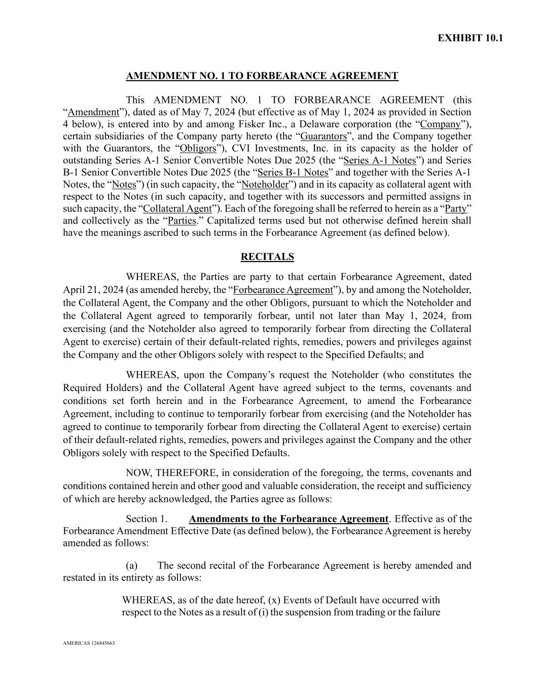 EXHIBIT 10.1 AMERICAS 126845663 AMENDMENT NO. 1 TO FORBEARANCE AGREEMENT This AMENDMENT NO. 1 TO FORBEARANCE AGREEMENT (this “Amendment”), dated as of May 7, 2024 (but effective as of May 1, 2024 as provided in Section 4 below), is entered into by and among Fisker Inc., a Delaware corporation (the “Company”), certain subsidiaries of the Company party hereto (the “Guarantors”, and the Company together with the Guarantors, the “Obligors”), CVI Investments, Inc. in its capacity as the holder of outstanding Series A-1 Senior Convertible Notes Due 2025 (the “Series A-1 Notes”) and Series B-1 Senior Convertible Notes Due 2025 (the “Series B-1 Notes” and together with the Series A-1 Notes, the “Notes”) (in such capacity, the “Noteholder”) and in its capacity as collateral agent with respect to the Notes (in such capacity, and together with its successors and permitted assigns in such capacity, the “Collateral Agent”). Each of the foregoing shall be referred to herein as a “Party” and collectively as the “Parties.” Capitalized terms used but not otherwise defined herein shall have the meanings ascribed to such terms in the Forbearance Agreement (as defined below). RECITALS WHEREAS, the Parties are party to that certain Forbearance Agreement, dated April 21, 2024 (as amended hereby, the “Forbearance Agreement”), by and among the Noteholder, the Collateral Agent, the Company and the other Obligors, pursuant to which the Noteholder and the Collateral Agent agreed to temporarily forbear, until not later than May 1, 2024, from exercising (and the Noteholder also agreed to temporarily forbear from directing the Collateral Agent to exercise) certain of their default-related rights, remedies, powers and privileges against the Company and the other Obligors solely with respect to the Specified Defaults; and WHEREAS, upon the Company’s request the Noteholder (who constitutes the Required Holders) and the Collateral Agent have agreed subject to the terms, covenants and conditions set forth herein and in the Forbearance Agreement, to amend the Forbearance Agreement, including to continue to temporarily forbear from exercising (and the Noteholder has agreed to continue to temporarily forbear from directing the Collateral Agent to exercise) certain of their default-related rights, remedies, powers and privileges against the Company and the other Obligors solely with respect to the Specified Defaults. NOW, THEREFORE, in consideration of the foregoing, the terms, covenants and conditions contained herein and other good and valuable consideration, the receipt and sufficiency of which are hereby acknowledged, the Parties agree as follows: Section 1. Amendments to the Forbearance Agreement. Effective as of the Forbearance Amendment Effective Date (as defined below), the Forbearance Agreement is hereby amended as follows: (a) The second recital of the Forbearance Agreement is hereby amended and restated in its entirety as follows: WHEREAS, as of the date hereof, (x) Events of Default have occurred with respect to the Notes as a result of (i) the suspension from trading or the failure