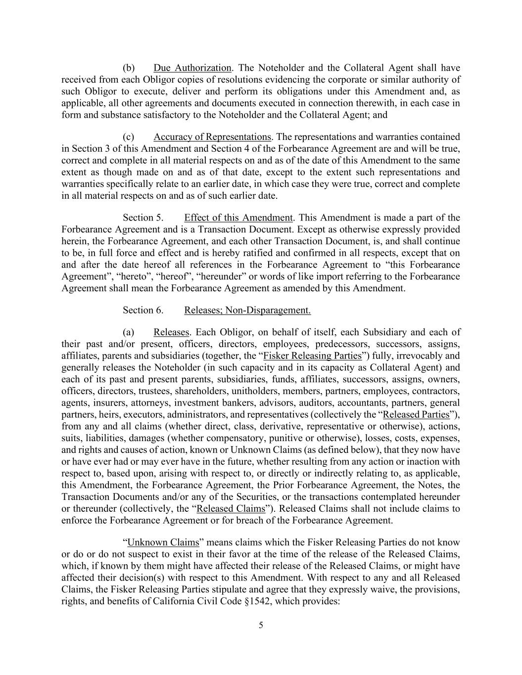 5 (b) Due Authorization. The Noteholder and the Collateral Agent shall have received from each Obligor copies of resolutions evidencing the corporate or similar authority of such Obligor to execute, deliver and perform its obligations under this Amendment and, as applicable, all other agreements and documents executed in connection therewith, in each case in form and substance satisfactory to the Noteholder and the Collateral Agent; and (c) Accuracy of Representations. The representations and warranties contained in Section 3 of this Amendment and Section 4 of the Forbearance Agreement are and will be true, correct and complete in all material respects on and as of the date of this Amendment to the same extent as though made on and as of that date, except to the extent such representations and warranties specifically relate to an earlier date, in which case they were true, correct and complete in all material respects on and as of such earlier date. Section 5. Effect of this Amendment. This Amendment is made a part of the Forbearance Agreement and is a Transaction Document. Except as otherwise expressly provided herein, the Forbearance Agreement, and each other Transaction Document, is, and shall continue to be, in full force and effect and is hereby ratified and confirmed in all respects, except that on and after the date hereof all references in the Forbearance Agreement to “this Forbearance Agreement”, “hereto”, “hereof”, “hereunder” or words of like import referring to the Forbearance Agreement shall mean the Forbearance Agreement as amended by this Amendment. Section 6. Releases; Non-Disparagement. (a) Releases. Each Obligor, on behalf of itself, each Subsidiary and each of their past and/or present, officers, directors, employees, predecessors, successors, assigns, affiliates, parents and subsidiaries (together, the “Fisker Releasing Parties”) fully, irrevocably and generally releases the Noteholder (in such capacity and in its capacity as Collateral Agent) and each of its past and present parents, subsidiaries, funds, affiliates, successors, assigns, owners, officers, directors, trustees, shareholders, unitholders, members, partners, employees, contractors, agents, insurers, attorneys, investment bankers, advisors, auditors, accountants, partners, general partners, heirs, executors, administrators, and representatives (collectively the “Released Parties”), from any and all claims (whether direct, class, derivative, representative or otherwise), actions, suits, liabilities, damages (whether compensatory, punitive or otherwise), losses, costs, expenses, and rights and causes of action, known or Unknown Claims (as defined below), that they now have or have ever had or may ever have in the future, whether resulting from any action or inaction with respect to, based upon, arising with respect to, or directly or indirectly relating to, as applicable, this Amendment, the Forbearance Agreement, the Prior Forbearance Agreement, the Notes, the Transaction Documents and/or any of the Securities, or the transactions contemplated hereunder or thereunder (collectively, the “Released Claims”). Released Claims shall not include claims to enforce the Forbearance Agreement or for breach of the Forbearance Agreement. “Unknown Claims” means claims which the Fisker Releasing Parties do not know or do or do not suspect to exist in their favor at the time of the release of the Released Claims, which, if known by them might have affected their release of the Released Claims, or might have affected their decision(s) with respect to this Amendment. With respect to any and all Released Claims, the Fisker Releasing Parties stipulate and agree that they expressly waive, the provisions, rights, and benefits of California Civil Code §1542, which provides: