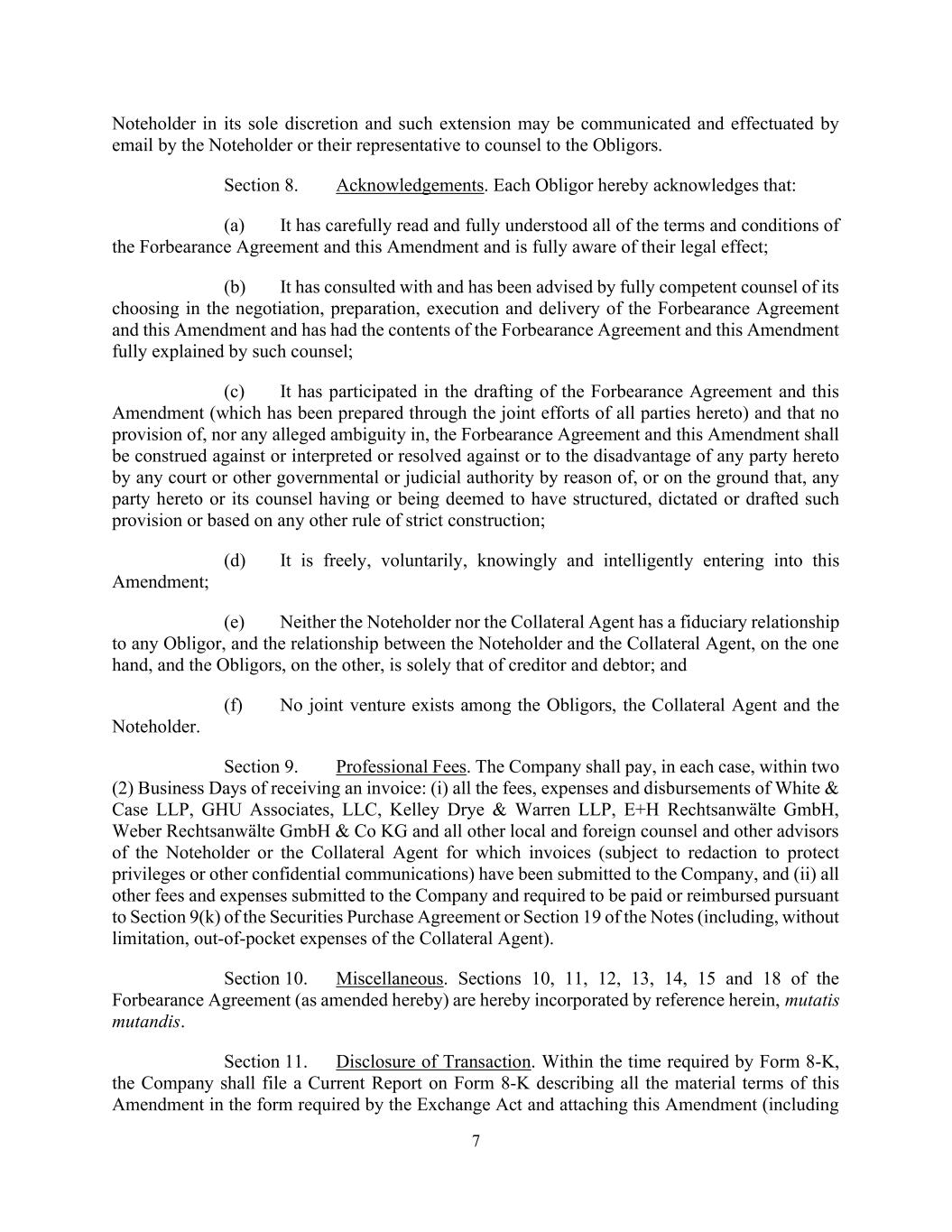 7 Noteholder in its sole discretion and such extension may be communicated and effectuated by email by the Noteholder or their representative to counsel to the Obligors. Section 8. Acknowledgements. Each Obligor hereby acknowledges that: (a) It has carefully read and fully understood all of the terms and conditions of the Forbearance Agreement and this Amendment and is fully aware of their legal effect; (b) It has consulted with and has been advised by fully competent counsel of its choosing in the negotiation, preparation, execution and delivery of the Forbearance Agreement and this Amendment and has had the contents of the Forbearance Agreement and this Amendment fully explained by such counsel; (c) It has participated in the drafting of the Forbearance Agreement and this Amendment (which has been prepared through the joint efforts of all parties hereto) and that no provision of, nor any alleged ambiguity in, the Forbearance Agreement and this Amendment shall be construed against or interpreted or resolved against or to the disadvantage of any party hereto by any court or other governmental or judicial authority by reason of, or on the ground that, any party hereto or its counsel having or being deemed to have structured, dictated or drafted such provision or based on any other rule of strict construction; (d) It is freely, voluntarily, knowingly and intelligently entering into this Amendment; (e) Neither the Noteholder nor the Collateral Agent has a fiduciary relationship to any Obligor, and the relationship between the Noteholder and the Collateral Agent, on the one hand, and the Obligors, on the other, is solely that of creditor and debtor; and (f) No joint venture exists among the Obligors, the Collateral Agent and the Noteholder. Section 9. Professional Fees. The Company shall pay, in each case, within two (2) Business Days of receiving an invoice: (i) all the fees, expenses and disbursements of White & Case LLP, GHU Associates, LLC, Kelley Drye & Warren LLP, E+H Rechtsanwälte GmbH, Weber Rechtsanwälte GmbH & Co KG and all other local and foreign counsel and other advisors of the Noteholder or the Collateral Agent for which invoices (subject to redaction to protect privileges or other confidential communications) have been submitted to the Company, and (ii) all other fees and expenses submitted to the Company and required to be paid or reimbursed pursuant to Section 9(k) of the Securities Purchase Agreement or Section 19 of the Notes (including, without limitation, out-of-pocket expenses of the Collateral Agent). Section 10. Miscellaneous. Sections 10, 11, 12, 13, 14, 15 and 18 of the Forbearance Agreement (as amended hereby) are hereby incorporated by reference herein, mutatis mutandis. Section 11. Disclosure of Transaction. Within the time required by Form 8-K, the Company shall file a Current Report on Form 8-K describing all the material terms of this Amendment in the form required by the Exchange Act and attaching this Amendment (including