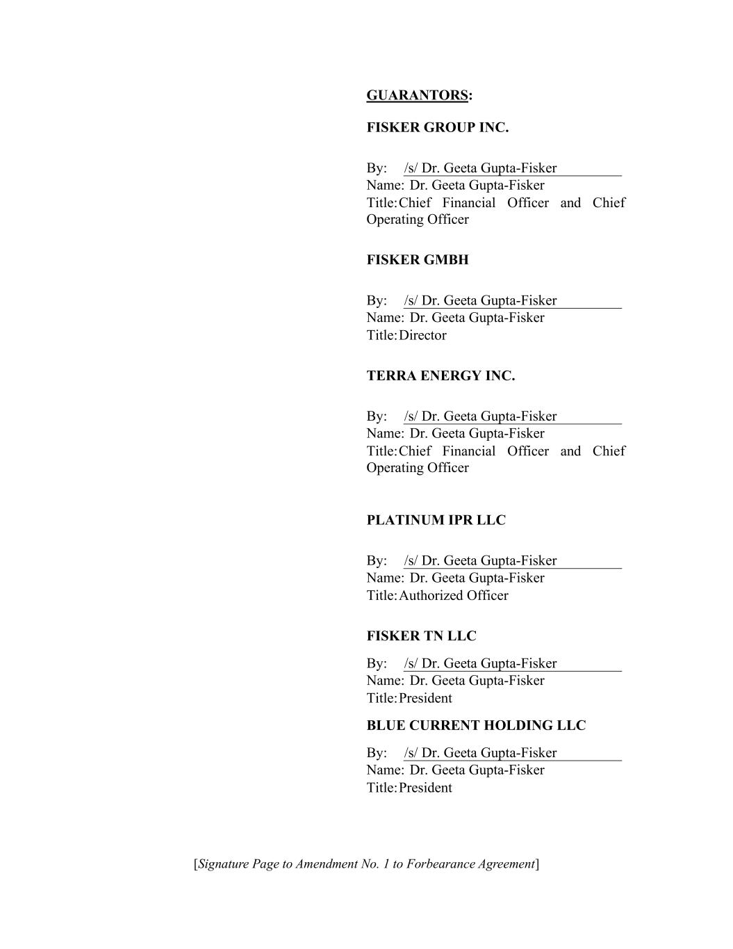 [Signature Page to Amendment No. 1 to Forbearance Agreement] GUARANTORS: FISKER GROUP INC. By: /s/ Dr. Geeta Gupta-Fisker Name: Dr. Geeta Gupta-Fisker Title: Chief Financial Officer and Chief Operating Officer FISKER GMBH By: /s/ Dr. Geeta Gupta-Fisker Name: Dr. Geeta Gupta-Fisker Title: Director TERRA ENERGY INC. By: /s/ Dr. Geeta Gupta-Fisker Name: Dr. Geeta Gupta-Fisker Title: Chief Financial Officer and Chief Operating Officer PLATINUM IPR LLC By: /s/ Dr. Geeta Gupta-Fisker Name: Dr. Geeta Gupta-Fisker Title: Authorized Officer FISKER TN LLC By: /s/ Dr. Geeta Gupta-Fisker Name: Dr. Geeta Gupta-Fisker Title: President BLUE CURRENT HOLDING LLC By: /s/ Dr. Geeta Gupta-Fisker Name: Dr. Geeta Gupta-Fisker Title: President