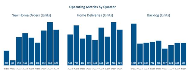 We continue to evaluate new communities and to develop an attractive pipeline of land acquisition opportunities. During the three months ended September 30, 2024, we had 626 new home orders and 629 home deliveries. As of September 30, 2024, we had 691 homes in backlog. Set forth below is summary quarterly information prior to September 30, 2024, regarding certain of our key operating metrics: