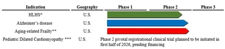 Laromestrocel is a proprietary, scalable, allogeneic cellular therapy that has multiple modes of action that include pro-vascular, pro-regenerative, and anti-inflammatory mechanisms, promoting tissue repair and healing with broad potential applications across a spectrum of disease areas. We are currently pursuing four pipeline indications: Hypoplastic Left Heart Syndrome (“HLHS”), Alzheimer’s disease (“AD”), pediatric Dilated Cardiomyopathy (“DCM”) and Aging-related Frailty. Our mission is to continue to advance the development and regulatory approval of laromestrocel and make it available to all the patients who may need it.