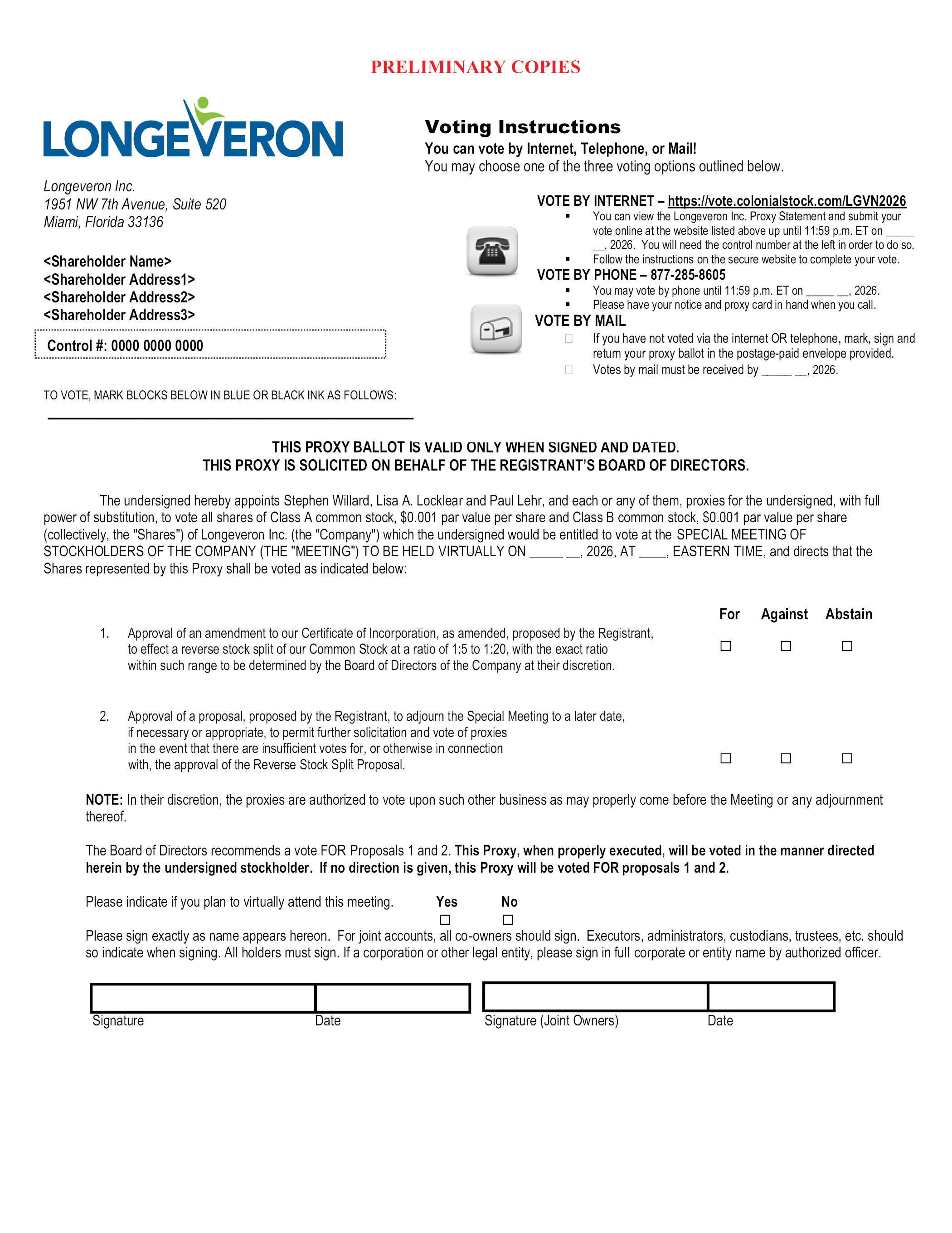 PRELIMINARY COPIES Longeveron Inc. 1951 NW 7th Avenue, Suite 520 Miami, Florida 33136 <Shareholder Name> <Shareholder Address1> <Shareholder Address2> <Shareholder Address3> TO VOTE, MARK BLOCKS BELOW IN BLUE OR BLACK INK AS FOLLOWS__ THIS PROXY BALLOT IS VALID ONLY WHEN SIGNED AND DATED. THIS PROXY IS SOLICITED ON BEHALF OF THE REGISTRANT’S BOARD OF DIRECTORS. The undersigned hereby appoints Stephen Willard, Lisa A. Locklear and Paul Lehr, and each or any of them, proxies for the undersigned, with full power of substitution, to vote all shares of Class A common stock, $0.001 par value per share and Class B common stock, $0.001 par value per share (collectively, the “Shares”) of Longeveron Inc. (the “Company”) which the undersigned would be entitled to vote at the SPECIAL MEETING OF STOCKHOLDERS OF THE COMPANY (THE “MEETING”) TO BE HELD VIRTUALLY ON _____ __, 2026, AT ____, EASTERN TIME, and directs that the Shares represented by this Proxy shall be voted as indicated below: 1. Approval of an amendment to our Certificate of Incorporation, as amended, proposed by the Registrant, to effect a reverse stock split of our Common Stock at a ratio of 1:5 to 1:20, with the exact ratio within such range to be determined by the Board of Directors of the Company at their discretion. 2. Approval of a proposal, proposed by the Registrant, to adjourn the Special Meeting to a later date, if necessary or appropriate, to permit further solicitation and vote of proxies in the event that there are insufficient votes for, or otherwise in connection with, the approval of the Reverse Stock Split Proposal. NOTE: In their discretion, the proxies are authorized to vote upon such other business as may properly come before the Meeting or any adjournment thereof. The Board of Directors recommends a vote FOR Proposals 1 and 2. This Proxy, when properly executed, will be voted in the manner directed herein by the undersigned stockholder. If no direction is given, this Proxy will be voted FOR proposals 1 and 2. Please indicate if you plan to virtually attend this meeting. Yes No Please sign exactly as name appears hereon. For joint accounts, all co-owners should sign. Executors, administrators, custodians, trustees, etc. should so indicate when signing. All holders must sign. If a corporation or other legal entity, please sign in full corporate or entity name by authorized officer. Signature Date Signature (Joint Owners) Date
