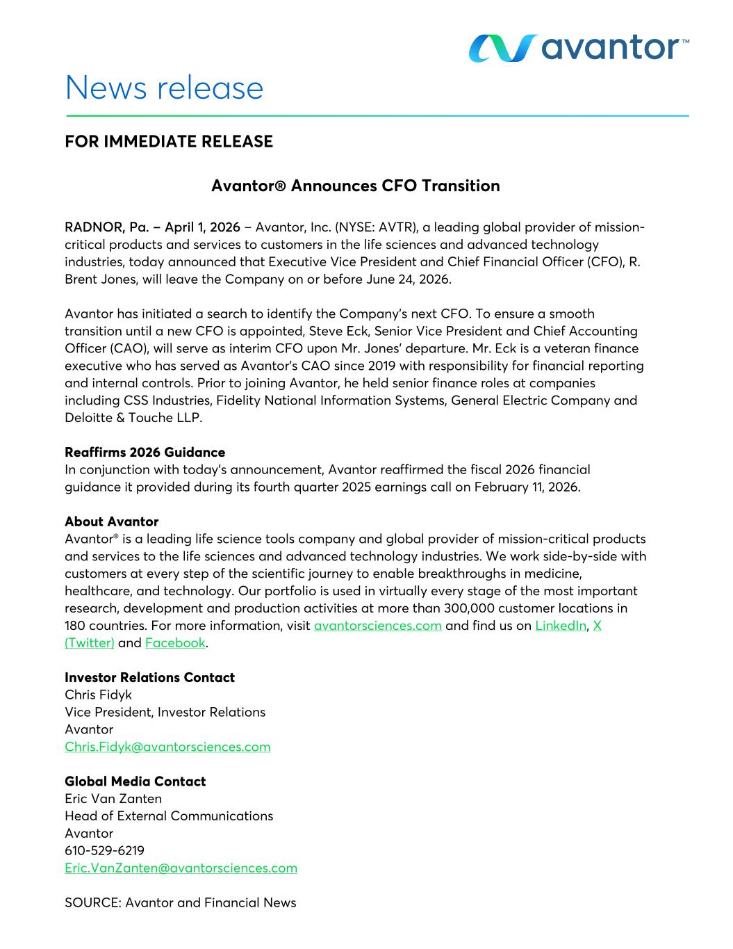 News release FOR IMMEDIATE RELEASE Avantor® Announces CFO Transition RADNOR, Pa. – April 1, 2026 – Avantor, Inc. (NYSE: AVTR), a leading global provider of mission- critical products and services to customers in the life sciences and advanced technology industries, today announced that Executive Vice President and Chief Financial Officer (CFO), R. Brent Jones, will leave the Company on or before June 24, 2026. Avantor has initiated a search to identify the Company’s next CFO. To ensure a smooth transition until a new CFO is appointed, Steve Eck, Senior Vice President and Chief Accounting Officer (CAO), will serve as interim CFO upon Mr. Jones’ departure. Mr. Eck is a veteran finance executive who has served as Avantor’s CAO since 2019 with responsibility for financial reporting and internal controls. Prior to joining Avantor, he held senior finance roles at companies including CSS Industries, Fidelity National Information Systems, General Electric Company and Deloitte & Touche LLP. Reaffirms 2026 Guidance In conjunction with today’s announcement, Avantor reaffirmed the fiscal 2026 financial guidance it provided during its fourth quarter 2025 earnings call on February 11, 2026. About Avantor Avantor® is a leading life science tools company and global provider of mission-critical products and services to the life sciences and advanced technology industries. We work side-by-side with customers at every step of the scientific journey to enable breakthroughs in medicine, healthcare, and technology. Our portfolio is used in virtually every stage of the most important research, development and production activities at more than 300,000 customer locations in 180 countries. For more information, visit avantorsciences.com and find us on LinkedIn, X (Twitter) and Facebook. Investor Relations Contact Chris Fidyk Vice President, Investor Relations Avantor Chris.Fidyk@avantorsciences.com Global Media Contact Eric Van Zanten Head of External Communications Avantor 610-529-6219 Eric.VanZanten@avantorsciences.com SOURCE: Avantor and Financial News
