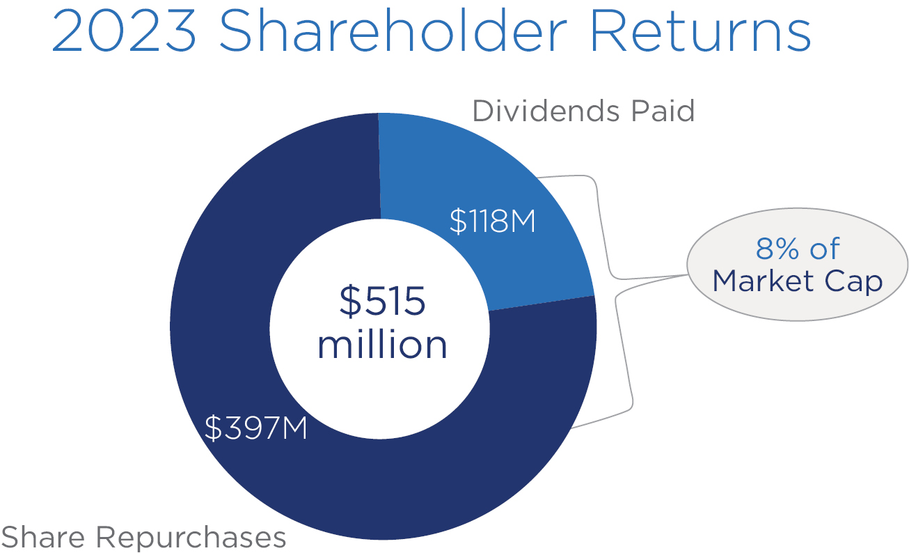 The continued focus and thoughtful execution of our team in 2023 led to the delivery of diluted earnings per share of $3.41 and adjusted diluted earnings per share of $4.01. For 2023, net income was $289 million, adjusted net income was $341 million, and adjusted EBITDA was $659 million. Net cash provided by operating activities was $376 million, and free cash flow was $339 million in 2023. We also returned $515 million to our stockholders in 2023, including dividend payments of $118 million and stock repurchases of $397 million. This highlights your Board’s continued confidence in our business and our strategy.*