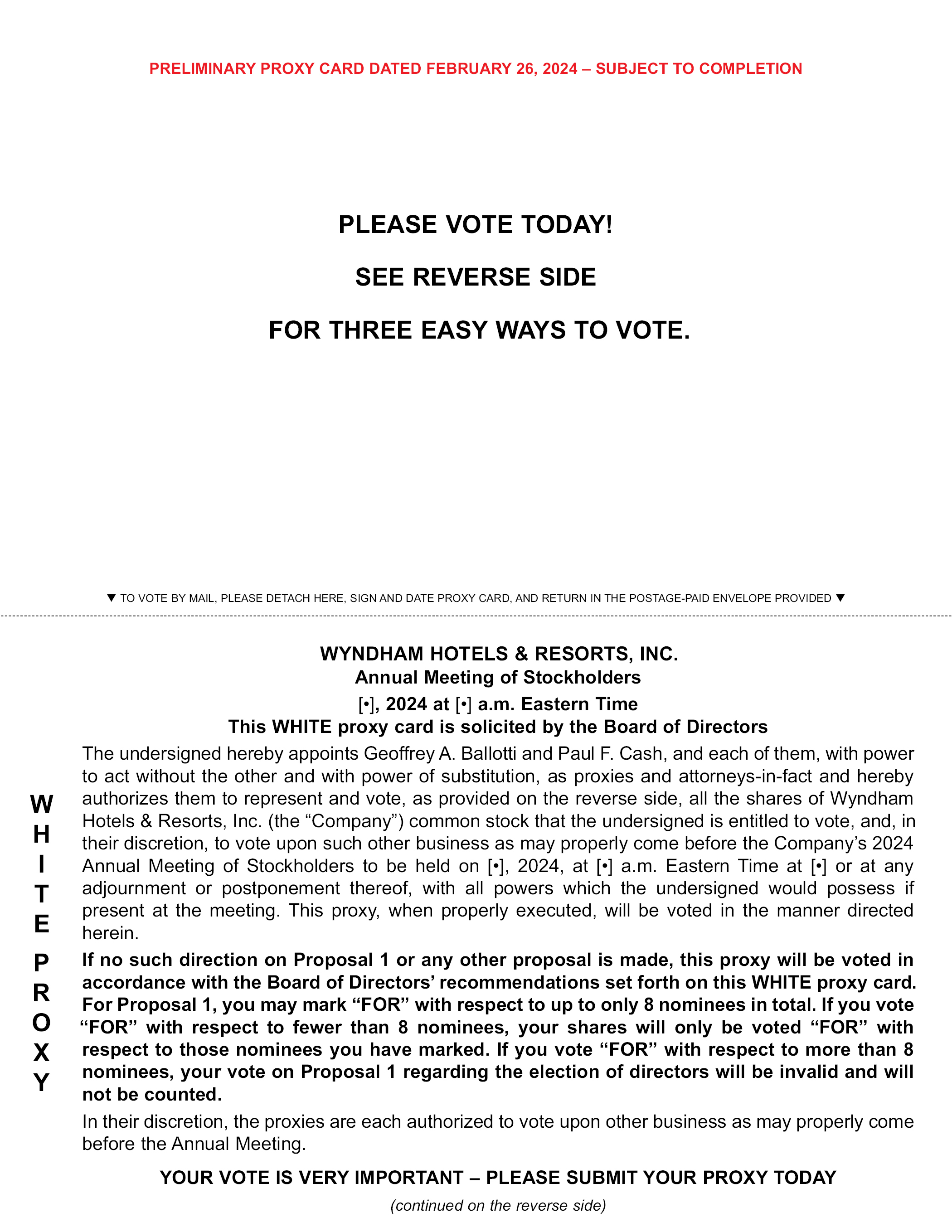 PRELIMINARY PROXY CARD DATED FEBRUARY 26, 2024 – SUBJECT TO COMPLETION PLEASE VOTE TODAY! SEE REVERSE SIDE FOR THREE EASY WAYS TO VOTE. TO VOTE BY MAIL, PLEASE DETACH HERE, SIGN AND DATE PROXY CARD, AND RETURN IN THE POSTAGE-PAID ENVELOPE PROVIDED WH I TE PROXY WYNDHAM HOTELS & RESORTS, INC. Annual Meeting of Stockholders, 2024 at a.m. Eastern Time This WHITE proxy card is solicited by the Board of Directors The undersigned hereby appoints Geoffrey A. Ballotti and Paul F. Cash, and each of them, with power to act without the other and with power of substitution, as proxies and attorneys-in-fact and hereby authorizes them to represent and vote, as provided on the reverse side, all the shares of Wyndham Hotels & Resorts, Inc. (the Company) common stock that the undersigned is entitled to vote, and, in their discretion, to vote upon such other business as may properly come before the Company’s 2024 Annual Meeting of Stockholders to be held on, 2024, at a.m. Eastern Time at or at any adjournment or postponement thereof, with all powers which the undersigned would possess if present at the meeting. This proxy, when properly executed, will be voted in the manner directed herein. If no such direction on Proposal 1 or any other proposal is made, this proxy will be voted in accordance with the Board of Directors’ recommendations set forth on this WHITE proxy card. For Proposal 1, you may mark “FOR” with respect to up to only 8 nominees in total. If you vote “FOR” with respect to fewer than 8 nominees, your shares will only be voted “FOR” with respect to those nominees you have marked. If you vote “FOR” with respect to more than 8 nominees, your vote on Proposal 1 regarding the election of directors will be invalid and will not be counted. In their discretion, the proxies are each authorized to vote upon other business as may properly come before the Annual Meeting. YOUR VOTE IS VERY IMPORTANT – PLEASE SUBMIT YOUR PROXY TODAY continued on the reverse side.