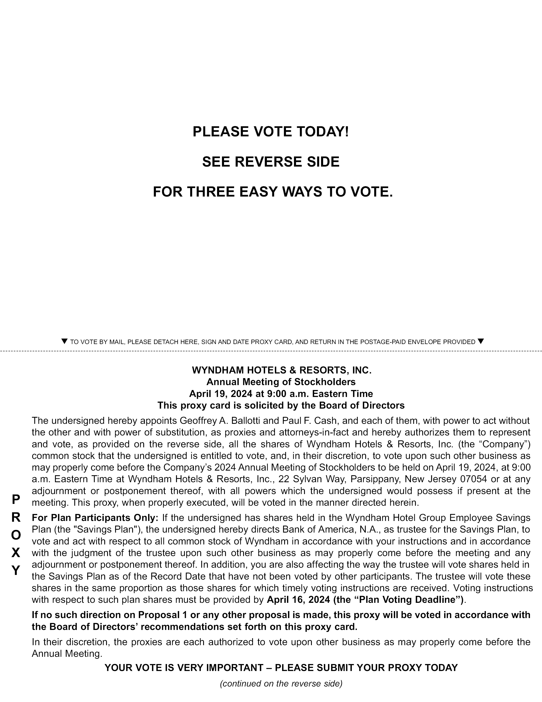 PLEASE VOTE TODAY! SEE REVERSE SIDE FOR THREE EASY WAYS TO VOTE. TO VOTE BY MAIL, PLEASE DETACH HERE, SIGN AND DATE PROXY CARD, AND RETURN IN THE POSTAGE-PAID ENVELOPE PROVIDED WYNDHAM HOTELS & RESORTS, INC. Annual Meeting of Stockholders April 19, 2024 at 9:00 a.m. Eastern Time This proxy card is solicited by the Board of Directors The undersigned hereby appoints Geoffrey A. Ballotti and Paul F. Cash, and each of them, with power to act without the other and with power of substitution, as proxies and attorneys-in-fact and hereby authorizes them to represent and vote, as provided on the reverse side, all the shares of Wyndham Hotels & Resorts, Inc. (the “Company”) common stock that the undersigned is entitled to vote, and, in their discretion, to vote upon such other business as may properly come before the Company’s 2024 Annual Meeting of Stockholders to be held on April 19, 2024, at 9:00 a.m. Eastern Time at Wyndham Hotels & Resorts, Inc., 22 Sylvan Way, Parsippany, New Jersey 07054 or at any adjournment or postponement thereof, with all powers which the undersigned would possess if present at the meeting. This proxy, when properly executed, will be voted in the manner directed herein.For PIan Participants Only: If the undersigned has shares held in the Wyndham Hotel Group Employee Savings Plan (the “Savings Plan”), the undersigned hereby directs Bank of America, N.A., as trustee for the Savings Plan, to vote and act with respect to all common stock of Wyndham in accordance with your instructions and in accordance with the judgment of the trustee upon such other business as may properly come before the meeting and any adjournment or postponement thereof. In addition, you are also affecting the way the trustee will vote shares held in the Savings Plan as of the Record Date that have not been voted by other participants. The trustee will vote these shares in the same proportion as those shares for which timely voting instructions are received. Voting instructions with respect to such plan shares must be provided by April 16, 2024 (the “Plan Voting Deadline”). If no such direction on Proposal 1 or any other proposal is made, this proxy will be voted in accordance with the Board of Directors’ recommendations set forth on this proxy card. In their discretion, the proxies are each authorized to vote upon other business as may properly come before the Annual Meeting. YOUR VOTE IS VERY IMPORTANT – PLEASE SUBMIT YOUR PROXY TODAY PROXY YOUR VOTE IS VERY IMPORTANT – PLEASE SUBMIT YOUR PROXY TODAY (continued on the reverse side)