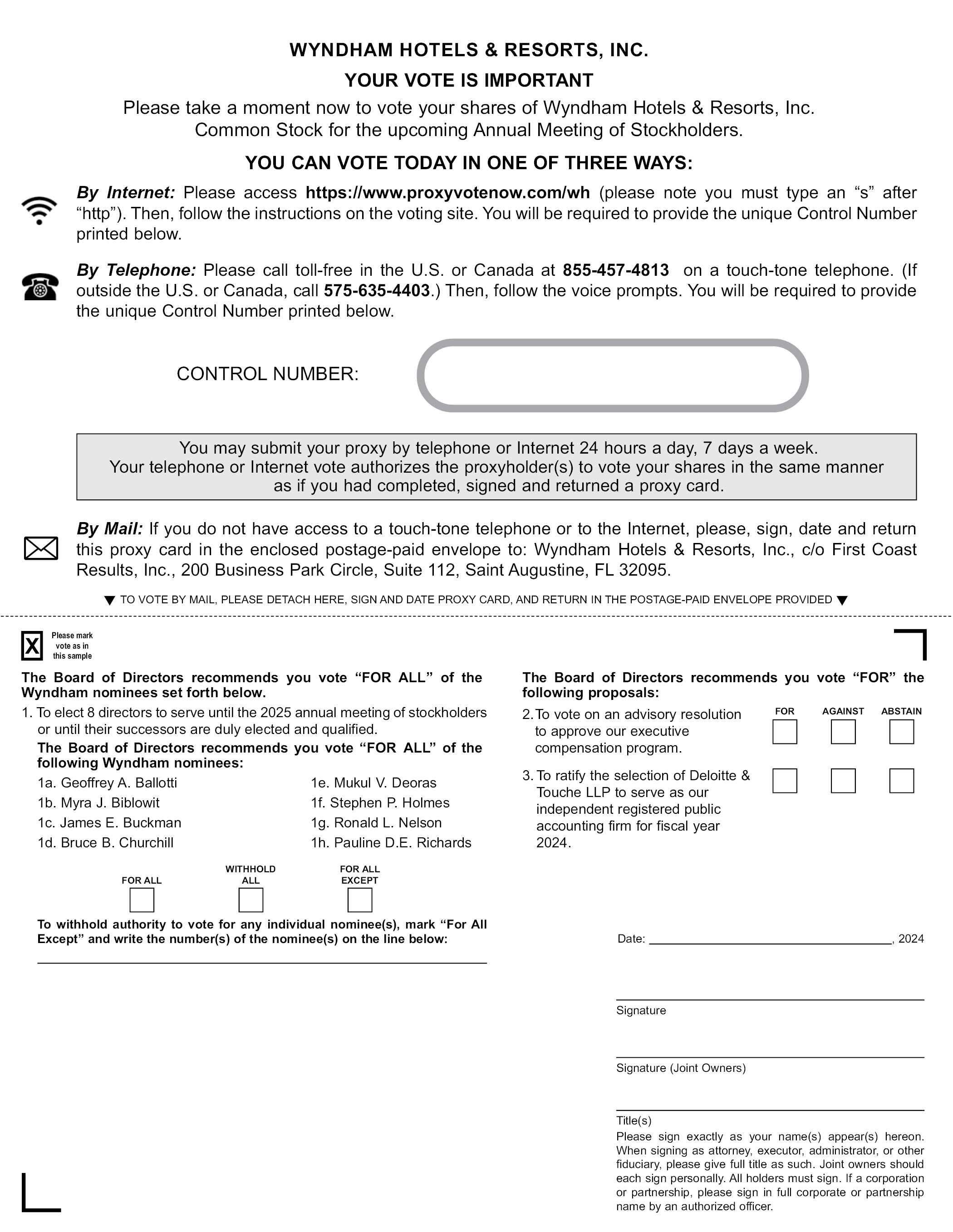 WYNDHAM HOTELS & RESORTS, INC. YOUR VOTE IS IMPORTANT Please take a moment now to vote your shares of Wyndham Hotels & Resorts, Inc. Common Stock for the upcoming Annual Meeting of Stockholders. YOU CAN VOTE TODAY IN ONE OF THREE WAYS: By Internet: Please access https://www.proxyvotenow.com/wh (please note you must type an “s” after “http”). Then, follow the instructions on the voting site. You will be required to provide the unique Control Number printed below. By Telephone: Please call toll-free in the U.S. or Canada at 855-457-4813 on a touch-tone telephone. (If outside the U.S. or Canada, call 575-635-4403.) Then, follow the voice prompts. You will be required to provide the unique Control Number printed below. CONTROL NUMBER: You may submit your proxy by telephone or Internet 24 hours a day, 7 days a week. Your telephone or Internet vote authorizes the proxyholder(s) to vote your shares in the same manner as if you had completed, signed and returned a proxy card. By Mail: If you do not have access to a touch-tone telephone or to the Internet, please, sign, date and return this proxy card in the enclosed postage-paid envelope to: Wyndham Hotels & Resorts, Inc., c/o First Coast Results, Inc., 200 Business Park Circle, Suite 112, Saint Augustine, FL 32095. TO VOTE BY MAIL, PLEASE DETACH HERE, SIGN AND DATE PROXY CARD, AND RETURN IN THE POSTAGE-PAID ENVELOPE PROVIDED The Board of Directors recommends you vote “FOR ALL” of the Wyndham nominees set forth below. 1. To elect 8 directors to serve until the 2025 annual meeting of stockholders or until their successors are duly elected and qualified. The Board of Directors recommends you vote “FOR ALL” of the following Wyndham nominees: 1a. Geoffrey A. Ballotti 1e. Mukul V. Deoras 1b. Myra J. Biblowit 1f. Stephen P. Holmes 1c. James E. Buckman 1g. Ronald L. Nelson 1d. Bruce B. Churchill 1h. Pauline D.E. Richards The Board of Directors recommends you vote “FOR” the following proposals: 2.To vote on an advisory resolution to approve our executive compensation program. 3. To ratify the selection of Deloitte & Touche LLP to serve as our independent registered public accounting firm for fiscal year 2024. To withhold authority to vote for any individual nominee(s), mark “For All Except” and write the number(s) of the nominee(s) on the line below: Date: , 2024 Signature Signature (Joint Owners) Title(s) Please sign exactly as your name(s) appear(s) hereon. When signing as attorney, executor, administrator, or other fiduciary, please give full title as such. Joint owners should each sign personally. All holders must sign. If a corporation or partnership, please sign in full corporate or partnership name by an authorized officer.