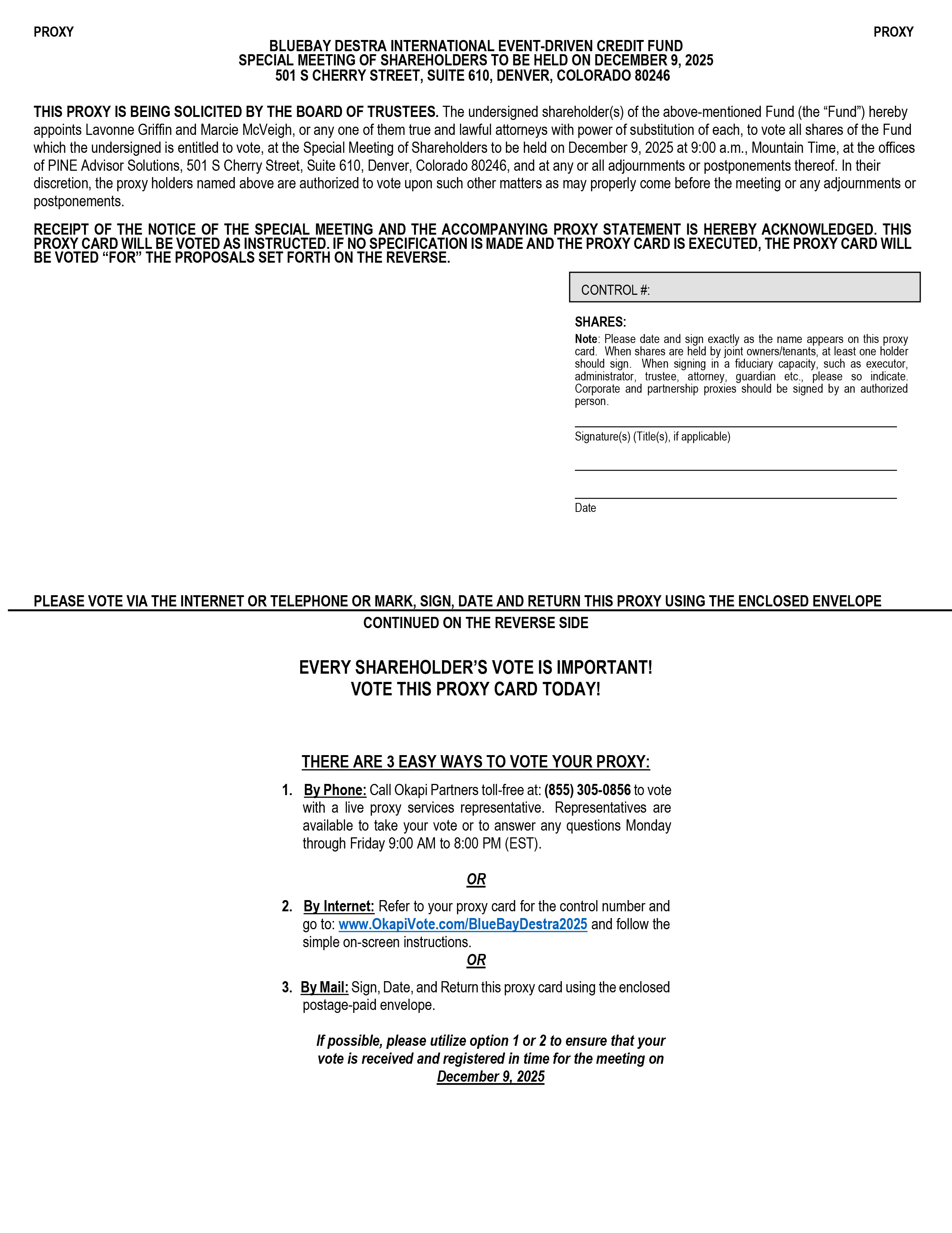PROXY PROXY BLUE B AY D E S TRA I NTE R N AT ION A L EV E NT - DRIV E N C RED I T F U ND S P ECIAL MEET ING O F S H AR E HOLDERS T O BE H E LD O N D EC EMBE R 9 , 2 0 2 5 50 1 S CH E RRY STRE E T, SU I TE 61 0 , DEN V ER, COL O RA D O 8 0 246 THIS P R OX Y IS BEING S O L I C I TED BY T HE B O A R D O F T R U STE E S. The un d ers igne d sh a r e ho l der( s ) o f th e above - menti on e d Fund (the “ Fu n d”) h e reby app oin ts Lavon n e G r iffi n an d Mar c i e McVei g h , o r an y on e o f th e m true and la wful attorne y s with p o wer o f substitu tio n o f each , to v o te a l l share s o f t h e Fund which the und er s igne d i s ent i tl e d to v ote , a t t h e S pecial Meetin g o f S h areho l ders t o be he l d on Decemb e r 9 , 202 5 a t 9:0 0 a.m. , Moun ta i n Tim e , a t th e offi c es o f PINE A d v iso r S olu ti o n s , 50 1 S Ch e rry Stree t , S u i te 6 10 , Denve r , Co lorad o 8 0 246, an d a t an y o r al l adjou r nment s o r po s tponem e nt s the r eof . I n their d i scretio n , the p r oxy ho l de r s na m e d abov e ar e a u thorized to v ot e upon su ch ot h e r matte rs a s m a y properl y c om e b efor e the mee t in g o r an y ad j our n ment s or postpone m ents. RECE I PT O F T HE NO TICE O F THE S P EC I AL MEE TI N G AN D T HE A C COM PANY I NG P R O XY STATEM E N T IS H E REBY ACKNO W LE DG ED . THIS PROXY C ARD WILL BE V O T E D AS I NST R U C TED . I F N O S P E CIFI C AT IO N IS MAD E A ND T H E PROXY C A R D IS E X EC U T E D, T HE P R OX Y CARD WI L L BE V OTED “F O R” THE P R OPOS A L S S E T FO R TH O N T HE R E V E RS E . PLEA S E VO TE VIA THE I N TE R NET O R T E LEPHONE OR M A R K, SIGN, DATE AND R E T U RN THIS P R OXY U SING T HE E N C LOS E D EN V E LOPE CO N TI N UED O N THE R E V E R S E S IDE E V ERY SHAR E HOLDER’S VOTE IS IMPORT A NT! VOTE T H IS P ROXY CARD TO D A Y! SHARES : Note : Please date a nd s ig n exact l y as the name appears on this proxy card . When shares are he l d by join t owners/ t enants, at le ast one ho ld er should s ig n . When s ig n in g i n a f i duciary capac it y, such as executor, administ r ator, t r ustee, attorney, gua r dian etc . , p le ase so in d ic ate . Corporate and partnersh i p prox ie s should be s ig ned by a n authorized person . Signature(s) (Tit l e(s), i f app li cab le) Date CONTROL #: THERE A R E 3 EASY WAYS TO VOTE YOUR PROX Y: 1. By Phone : Call O kapi P a rt n ers to ll - free at : ( 8 55 ) 30 5 - 085 6 to vote with a l i ve prox y s e rv i c e s repr e sent a tive . Re p r esentat i v e s are avai l ab l e to take yo u r v ot e o r to answ e r a n y q u estion s Mond ay through Fr id a y 9 : 00 A M to 8 : 00 P M (EST) . OR 2. By Intern e t : Refer to yo u r p r oxy c ar d f o r the control num be r and g o to : ww w . Oka piVote . c om / Bl u eBayDestr a 20 2 5 an d fo llo w the s impl e o n - scree n i nstructio n s . OR 3. By Mail : S ign , Date, an d Retu r n th i s prox y c a rd usin g the enclo s ed postag e - pa i d e n ve l ope . If possible, please util i ze o pt i on 1 or 2 to e n s ure th a t your vote is re c eiv e d a n d register e d in time for t h e meeti n g on December 9, 2 0 2 5