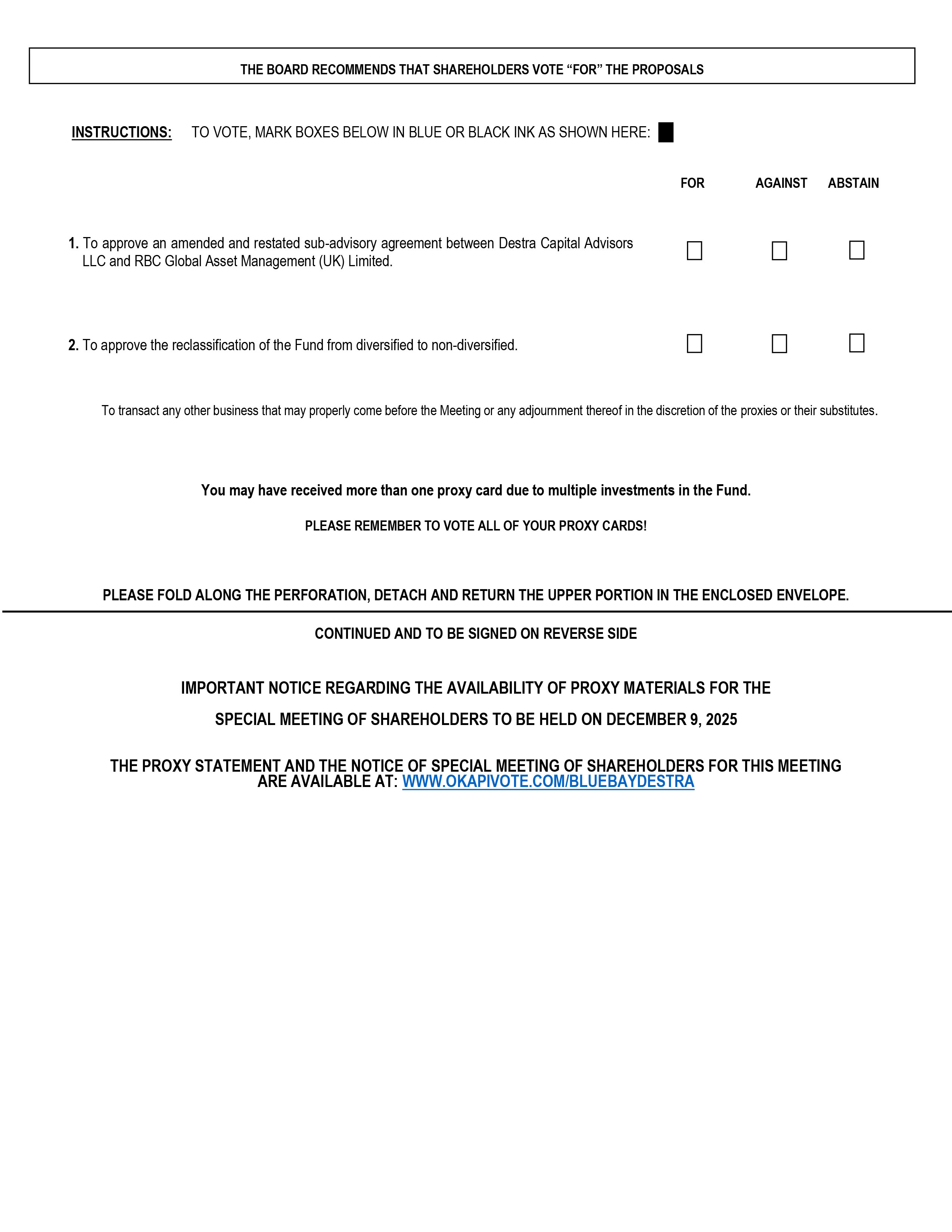 INSTRUC T I O NS: TO VOTE, MA RK B O X E S B E LO W IN BLUE O R B L A C K I NK A S S HO W N HERE: FOR AGAINST ABSTAIN 1 . To appr o ve a n amende d an d r e s tate d s u b - a d v isor y a g reeme n t betwe e n D e st r a Cap i tal A d v is o rs LL C a n d RBC Globa l Ass e t Ma n a gem en t (UK) L i mit ed. 2 . To appr o ve the r ecla s s ifi cat io n o f the Fund from d iver s ifie d to non - d i vers ifi ed. To transact a ny oth er bus in ess that may p ro p er l y co m e before the Me e ting or a ny a d jo u rnme n t t her e of i n t he d i scre t ion of the pr o x ie s or their s ubsti t ute s . You may have r ece ive d more t han one proxy ca r d due to mu l tiple i nves t me n ts in the Fund. PLEASE REMEMBER TO VOTE ALL O F YOUR PROXY CARDS! P LEA S E F O LD A LON G THE P ERFOR A TION, DETA C H A ND RETU R N T HE U P P ER PO RT IO N IN T HE E N CLOSE D E NV ELO P E . CO N TI N UED A ND TO BE S I G NED O N RE V E RSE S I DE IMPORT A NT NOTICE R E G A R DING THE AV A ILABILITY O F PROXY MATER I ALS FOR THE SPE C I AL ME E TING O F SHAREHO L DERS TO BE HELD O N DECEMBER 9 , 2025 THE PROXY S TATEMENT AND THE NOTICE OF SPE C I AL MEET ING O F SHAREHOLDERS F O R THIS MEETING A R E AV A ILABLE AT: WWW. OKAPIVO T E.COM/BLUEB A YDESTRA THE BOARD RECO M M ENDS TH A T SHAREHOLD E RS VOTE “FOR” THE PROPOSAL S