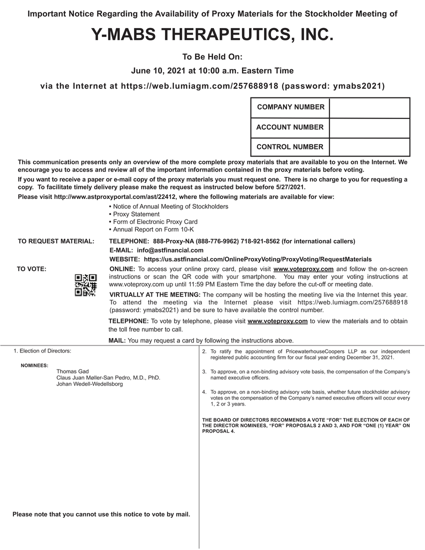 Important Notice Regarding the Availability of Proxy Materials for the Stockholder Meeting of BS THERAPEUTICS, INC. To Be Held On: June 10, 2021 at 10:00 a.m. Eastern Time via the Internet at https://web.lumiagm.com/257688918 (password: ymabs2021) This communication presents only an overview of the more complete proxy materials that are available to you on the Internet. We encourage you to access and review all of the important information contained in the proxy materials before voting. If you want to receive a paper or e-mail copy of the proxy materials you must request one. There is no charge to you for requesting a copy. To facilitate timely delivery please make the request as instructed below before 5/27/2021. Please visit http://www.astproxyportal.com/ast/22412, where the following materials are available for view: Notice of Annual Meeting of Stockholders Proxy Statement Form of Electronic Proxy Card Annual Report on Form 10-K TO REQUEST MATERIAL:TELEPHONE: 888-Proxy-NA (888-776-9962) 718-921-8562 (for international callers) E-MAIL: info@astfinancial.com WEBSITE: https://us.astfinancial.com/OnlineProxyVoting/ProxyVoting/RequestMaterials TO VOTE:ONLINE: To access your online proxy card, please visit www.voteproxy.com and follow the on-screen instructions or scan the QR code with your smartphone. You may enter your voting instructions at www.voteproxy.com up until 11:59 PM Eastern Time the day before the cut-off or meeting date. VIRTUALLY AT THE MEETING: The company will be hosting the meeting live via the Internet this year. To attend the meeting via the Internet please visit https://web.lumiagm.com/257688918 (password: ymabs2021) and be sure to have available the control number. TELEPHONE: To vote by telephone, please visit www.voteproxy.com to view the materials and to obtain the toll free number to call. MAIL: You may request a card by following the instructions above. 1. Election of Directors: NOMINEES: To ratify the appointment of PricewaterhouseCoopers LLP as our independent registered public accounting firm for our fiscal year ending December 31, 2021. Thomas Gad Claus Juan Møller-San Pedro, M.D., PhD. Johan Wedell-Wedellsborg To approve, on a non-binding advisory vote basis, the compensation of the Company’s named executive officers. To approve, on a non-binding advisory vote basis, whether future stockholder advisory votes on the compensation of the Company’s named executive officers will occur every 1, 2 or 3 years. THE BOARD OF DIRECTORS RECOMMENDS A VOTE “FOR” THE ELECTION OF EACH OF THE DIRECTOR NOMINEES, “FOR” PROPOSALS 2 AND 3, AND FOR “ONE (1) YEAR” ON PROPOSAL 4. Please note that you cannot use this notice to vote by mail. |
