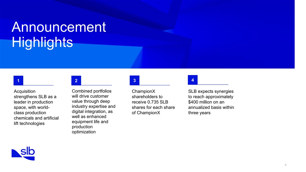 SLB expects to realize annual pretax synergies of approximately $400 million within the first three years post-closing through revenue growth and cost savings. The transaction is subject to ChampionX shareholders’ approval, regulatory approvals and other customary closing conditions. It is anticipated that the closing of the transaction will occur before the end of 2024.