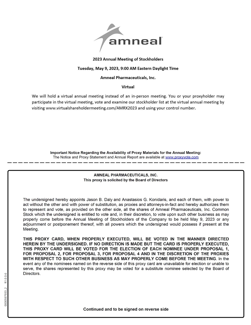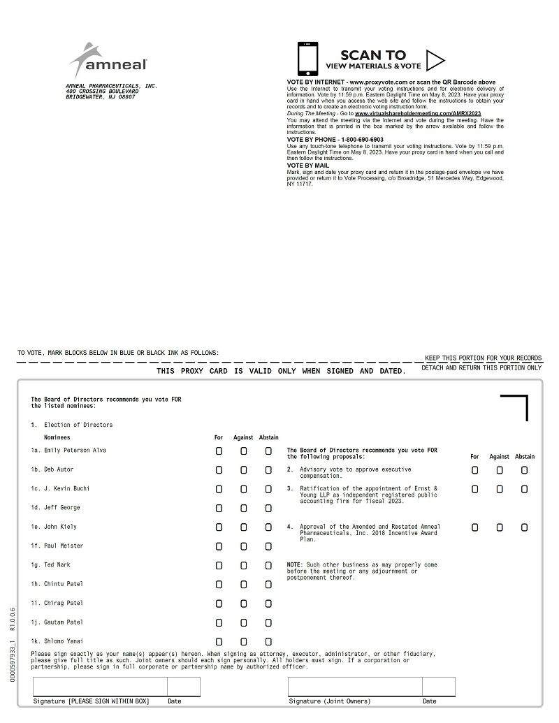 You are cordially invited to attend the Amneal TUESDAY, MAY 9, 2023 9:00 a.m., Eastern Daylight Time Virtual Meeting at www.virtualshareholdermeeting. Items to be Voted On 1. Elect as directors the 11 nominees named in the accompanying proxy statement; 2. Approve the compensation of our named executive officers on an advisory basis; 3. Ratify the appointment of Ernst & Young LLP as our independent registered public accounting firm for fiscal year 2023; 4. Approve the Amended and Restated Amneal Pharmaceuticals, Inc. 2018 Incentive Award Plan; and 5. Transact such other business as may properly come before the annual meeting or any adjournment or postponement of the meeting.