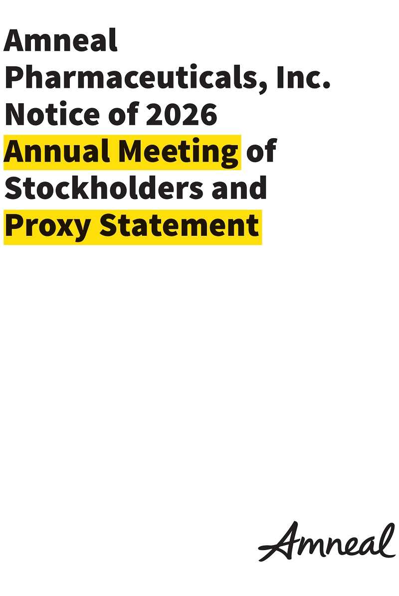 You are cordially invited to attend the Amneal Pharmaceuticals, Inc. 2026 Annual Meeting of Stockholders. WEDNESDAY, MAY 6, 2026 9:00 a.m., Eastern Daylight Time Virtual Meeting at www.virtualshareholdermeeting.com/AMRX2026 Items to be Voted On 1. Elect as directors the 10 nominees named in the accompanying proxy statement; 2. Approve the compensation of our named executive officers on an advisory basis; 3. Ratify the appointment of Ernst & Young LLP as our independent registered public accounting firm for fiscal year 2026; and 4. Transact such other business as may properly come before the annual meeting or any adjournment or postponement of the meeting.