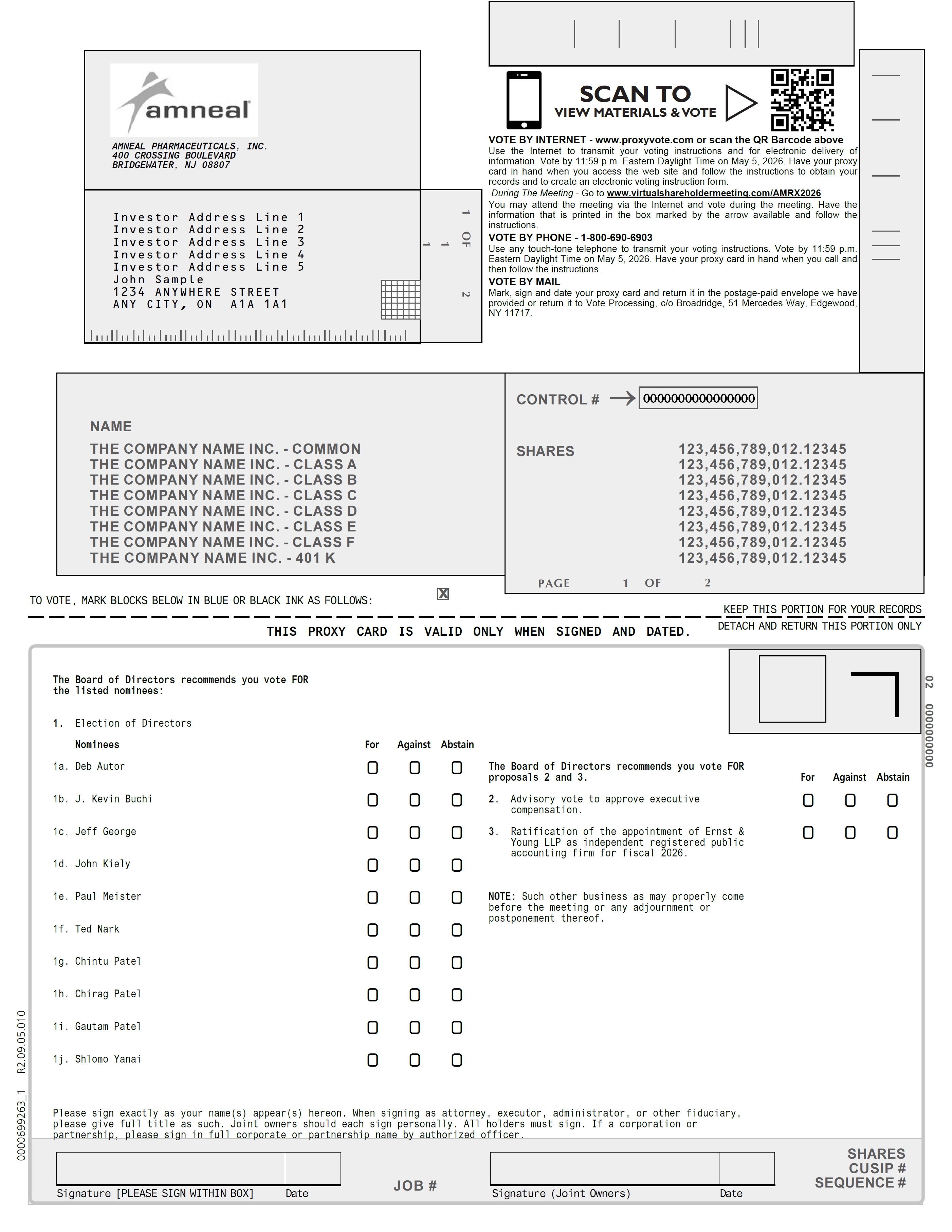 1 1 12345678 12345678 12345678 12345678 12345678 12345678 12345678 12345678 NAME THE COMPANY NAME INC. - COMMON 123,456,789,012.12345 THE COMPANY NAME INC. - CLASS A 123,456,789,012.12345 THE COMPANY NAME INC. - CLASS B 123,456,789,012.12345 THE COMPANY NAME INC. - CLASS C 123,456,789,012.12345 THE COMPANY NAME INC. - CLASS D 123,456,789,012.12345 THE COMPANY NAME INC. - CLASS E 123,456,789,012.12345 THE COMPANY NAME INC. - CLASS F 123,456,789,012.12345 THE COMPANY NAME INC. - 401 K 123,456,789,012.12345 x 02 0000000000 JOB # 1 OF 2 1 OF 2 PAGE SHARES CUSIP # SEQUENCE # THIS PROXY CARD IS VALID ONLY WHEN SIGNED AND DATED. KEEP THIS PORTION FOR YOUR RECORDS DETACH AND RETURN THIS PORTION ONLY TO VOTE, MARK BLOCKS BELOW IN BLUE OR BLACK INK AS FOLLOWS: Signature [PLEASE SIGN WITHIN BOX] Date Signature (Joint Owners) Date CONTROL # SHARES SCAN TO VIEW MATERIALS & VOTE 0 0 0 0 0 0 0 0 0 0 0 0 0 0 0 0 0 0 0 0 0 0 0 0 0 0 0 0 0 0 0 0 0 0 0 0 0000699263_1 R2.09.05.010 AMNEAL PHARMACEUTICALS, INC. 400 CROSSING BOULEVARD BRIDGEWATER, NJ 08807 Investor Address Line 1 Investor Address Line 2 Investor Address Line 3 Investor Address Line 4 Investor Address Line 5 John Sample 1234 ANYWHERE STREET ANY CITY, ON A1A 1A1 VOTE BY INTERNET - www.proxyvote.com or scan the QR Barcode above Use the Internet to transmit your voting instructions and for electronic delivery of information. Vote by 11:59 p.m. Eastern Daylight Time on May 5, 2026. Have your proxy card in hand when you access the web site and follow the instructions to obtain your records and to create an electronic voting instruction form. During The Meeting - Go to www.virtualshareholdermeeting.com/AMRX2026 You may attend the meeting via the Internet and vote during the meeting. Have the information that is printed in the box marked by the arrow available and follow the instructions. VOTE BY PHONE - 1-800-690-6903 Use any touch-tone telephone to transmit your voting instructions. Vote by 11:59 p.m. Eastern Daylight Time on May 5, 2026. Have your proxy card in hand when you call and then follow the instructions. VOTE BY MAIL Mark, sign and date your proxy card and return it in the postage-paid envelope we have provided or return it to Vote Processing, c/o Broadridge, 51 Mercedes Way, Edgewood, NY 11717. The Board of Directors recommends you vote FOR the listed nominees: 1. Election of Directors Nominees For Against Abstain 1a. Deb Autor 1b. J. Kevin Buchi 1c. Jeff George 1d. John Kiely 1e. Paul Meister 1f. Ted Nark 1g. Chintu Patel 1h. Chirag Patel 1i. Gautam Patel 1j. Shlomo Yanai The Board of Directors recommends you vote FOR proposals 2 and 3. For Against Abstain 2. Advisory vote to approve executive compensation. 3. Ratification of the appointment of Ernst & Young LLP as independent registered public accounting firm for fiscal 2026. NOTE: Such other business as may properly come before the meeting or any adjournment or postponement thereof. Please sign exactly as your name(s) appear(s) hereon. When signing as attorney, executor, administrator, or other fiduciary, please give full title as such. Joint owners should each sign personally. All holders must sign. If a corporation or partnership, please sign in full corporate or partnership name by authorized officer.