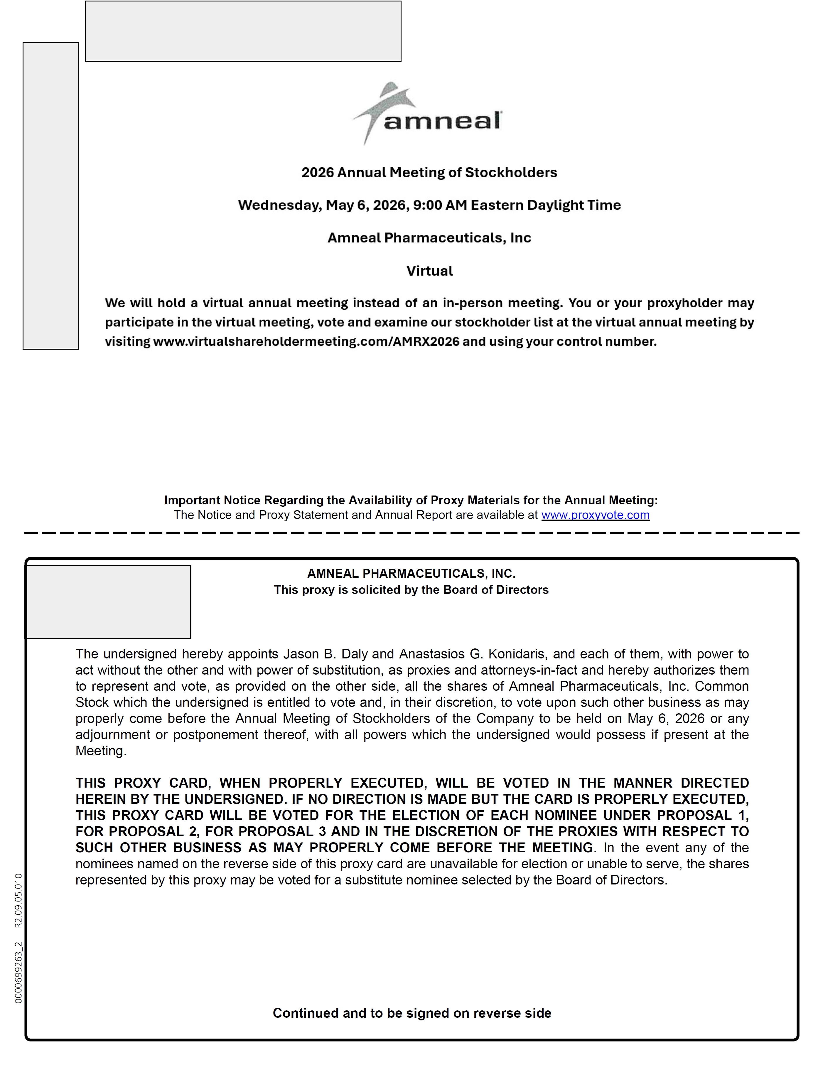 Notice Regarding the Availability of Proxy Materials for the Annual Meeting: The Notice and Proxy Statement and Annual Report are available at www.proxyvote.com AMNEAL PHARMACEUTICALS, INC. This proxy is solicited by the Board of Directors The undersigned hereby appoints Jason B. Daly and Anastasios G. Konidaris, and each of them, with power to act without the other and with power of substitution, as proxies and attorneys-in-fact and hereby authorizes them to represent and vote, as provided on the other side, all the shares of Amneal Pharmaceuticals, Inc. Common Stock which the undersigned is entitled to vote and, in their discretion, to vote upon such other business as may properly come before the Annual Meeting of Stockholders of the Company to be held on May 6, 2026 or any adjournment or postponement thereof, with all powers which the undersigned would possess if present at the Meeting. THIS PROXY CARD, WHEN PROPERLY EXECUTED, WILL BE VOTED IN THE MANNER DIRECTED HEREIN BY THE UNDERSIGNED. IF NO DIRECTION IS MADE BUT THE CARD IS PROPERLY EXECUTED, THIS PROXY CARD WILL BE VOTED FOR THE ELECTION OF EACH NOMINEE UNDER PROPOSAL 1, FOR PROPOSAL 2, FOR PROPOSAL 3 AND IN THE DISCRETION OF THE PROXIES WITH RESPECT TO SUCH OTHER BUSINESS AS MAY PROPERLY COME BEFORE THE MEETING. In the event any of the nominees named on the reverse side of this proxy card are unavailable for election or unable to serve, the shares represented by this proxy may be voted for a substitute nominee selected by the Board of Directors. Continued and to be signed on reverse side 0000699263_2 R2.09.05.010