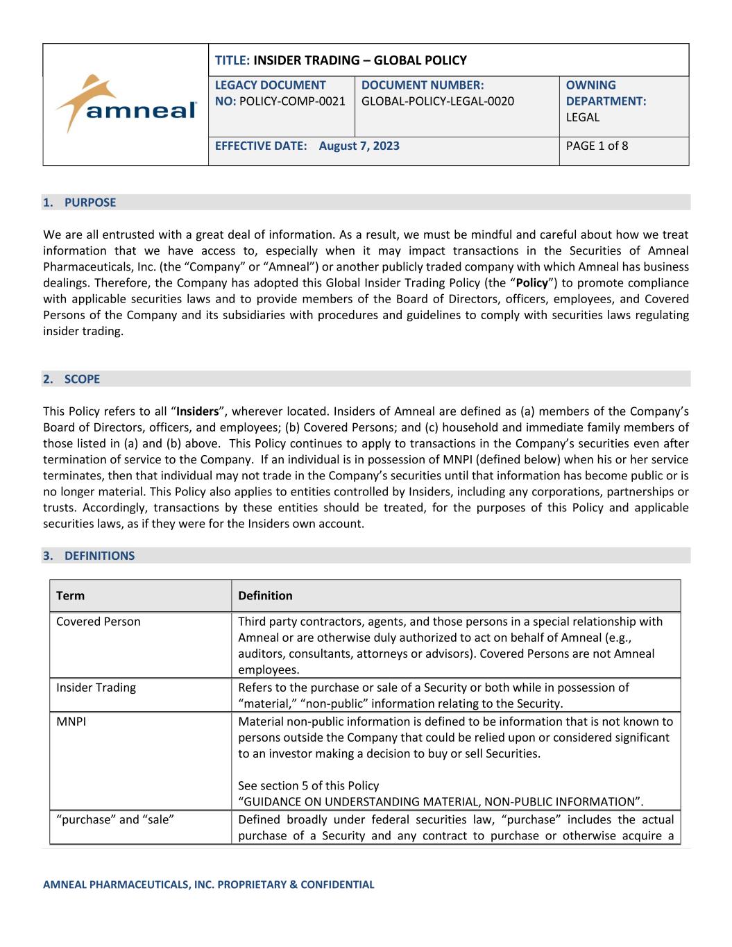 TITLE: INSIDER TRADING – GLOBAL POLICY LEGACY DOCUMENT NO: POLICY-COMP-0021 DOCUMENT NUMBER: GLOBAL-POLICY-LEGAL-0020 OWNING DEPARTMENT: LEGAL EFFECTIVE DATE: August 7, 2023 PAGE 1 of 8 AMNEAL PHARMACEUTICALS, INC. PROPRIETARY & CONFIDENTIAL 1. PURPOSE We are all entrusted with a great deal of information. As a result, we must be mindful and careful about how we treat information that we have access to, especially when it may impact transactions in the Securities of Amneal Pharmaceuticals, Inc. (the “Company” or “Amneal”) or another publicly traded company with which Amneal has business dealings. Therefore, the Company has adopted this Global Insider Trading Policy (the “Policy”) to promote compliance with applicable securities laws and to provide members of the Board of Directors, officers, employees, and Covered Persons of the Company and its subsidiaries with procedures and guidelines to comply with securities laws regulating insider trading. 2. SCOPE This Policy refers to all “Insiders”, wherever located. Insiders of Amneal are defined as (a) members of the Company’s Board of Directors, officers, and employees; (b) Covered Persons; and (c) household and immediate family members of those listed in (a) and (b) above. This Policy continues to apply to transactions in the Company’s securities even after termination of service to the Company. If an individual is in possession of MNPI (defined below) when his or her service terminates, then that individual may not trade in the Company’s securities until that information has become public or is no longer material. This Policy also applies to entities controlled by Insiders, including any corporations, partnerships or trusts. Accordingly, transactions by these entities should be treated, for the purposes of this Policy and applicable securities laws, as if they were for the Insiders own account. 3. DEFINITIONS Term Definition Covered Person Third party contractors, agents, and those persons in a special relationship with Amneal or are otherwise duly authorized to act on behalf of Amneal (e.g., auditors, consultants, attorneys or advisors). Covered Persons are not Amneal employees. Insider Trading Refers to the purchase or sale of a Security or both while in possession of “material,” “non-public” information relating to the Security. MNPI Material non-public information is defined to be information that is not known to persons outside the Company that could be relied upon or considered significant to an investor making a decision to buy or sell Securities. See section 5 of this Policy “GUIDANCE ON UNDERSTANDING MATERIAL, NON-PUBLIC INFORMATION”. “purchase” and “sale” Defined broadly under federal securities law, “purchase” includes the actual purchase of a Security and any contract to purchase or otherwise acquire a