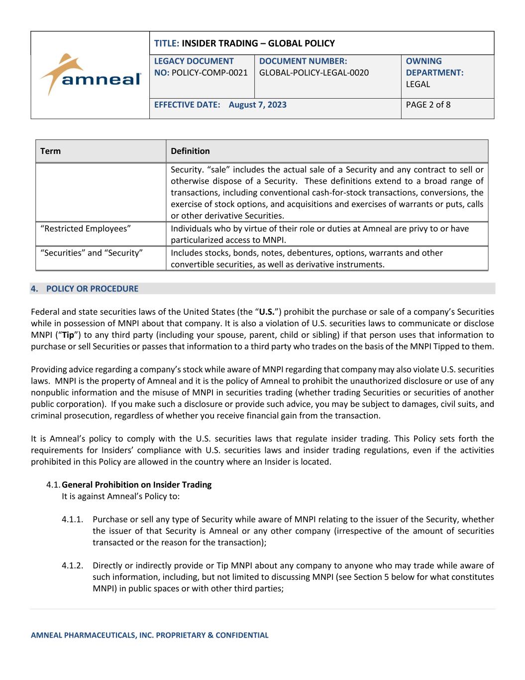 TITLE: INSIDER TRADING – GLOBAL POLICY LEGACY DOCUMENT NO: POLICY-COMP-0021 DOCUMENT NUMBER: GLOBAL-POLICY-LEGAL-0020 OWNING DEPARTMENT: LEGAL EFFECTIVE DATE: August 7, 2023 PAGE 2 of 8 AMNEAL PHARMACEUTICALS, INC. PROPRIETARY & CONFIDENTIAL Term Definition Security. “sale” includes the actual sale of a Security and any contract to sell or otherwise dispose of a Security. These definitions extend to a broad range of transactions, including conventional cash-for-stock transactions, conversions, the exercise of stock options, and acquisitions and exercises of warrants or puts, calls or other derivative Securities. “Restricted Employees” Individuals who by virtue of their role or duties at Amneal are privy to or have particularized access to MNPI. “Securities” and “Security” Includes stocks, bonds, notes, debentures, options, warrants and other convertible securities, as well as derivative instruments. 4. POLICY OR PROCEDURE Federal and state securities laws of the United States (the “U.S.”) prohibit the purchase or sale of a company’s Securities while in possession of MNPI about that company. It is also a violation of U.S. securities laws to communicate or disclose MNPI (“Tip”) to any third party (including your spouse, parent, child or sibling) if that person uses that information to purchase or sell Securities or passes that information to a third party who trades on the basis of the MNPI Tipped to them. Providing advice regarding a company’s stock while aware of MNPI regarding that company may also violate U.S. securities laws. MNPI is the property of Amneal and it is the policy of Amneal to prohibit the unauthorized disclosure or use of any nonpublic information and the misuse of MNPI in securities trading (whether trading Securities or securities of another public corporation). If you make such a disclosure or provide such advice, you may be subject to damages, civil suits, and criminal prosecution, regardless of whether you receive financial gain from the transaction. It is Amneal’s policy to comply with the U.S. securities laws that regulate insider trading. This Policy sets forth the requirements for Insiders’ compliance with U.S. securities laws and insider trading regulations, even if the activities prohibited in this Policy are allowed in the country where an Insider is located. 4.1. General Prohibition on Insider Trading It is against Amneal’s Policy to: 4.1.1. Purchase or sell any type of Security while aware of MNPI relating to the issuer of the Security, whether the issuer of that Security is Amneal or any other company (irrespective of the amount of securities transacted or the reason for the transaction); 4.1.2. Directly or indirectly provide or Tip MNPI about any company to anyone who may trade while aware of such information, including, but not limited to discussing MNPI (see Section 5 below for what constitutes MNPI) in public spaces or with other third parties;