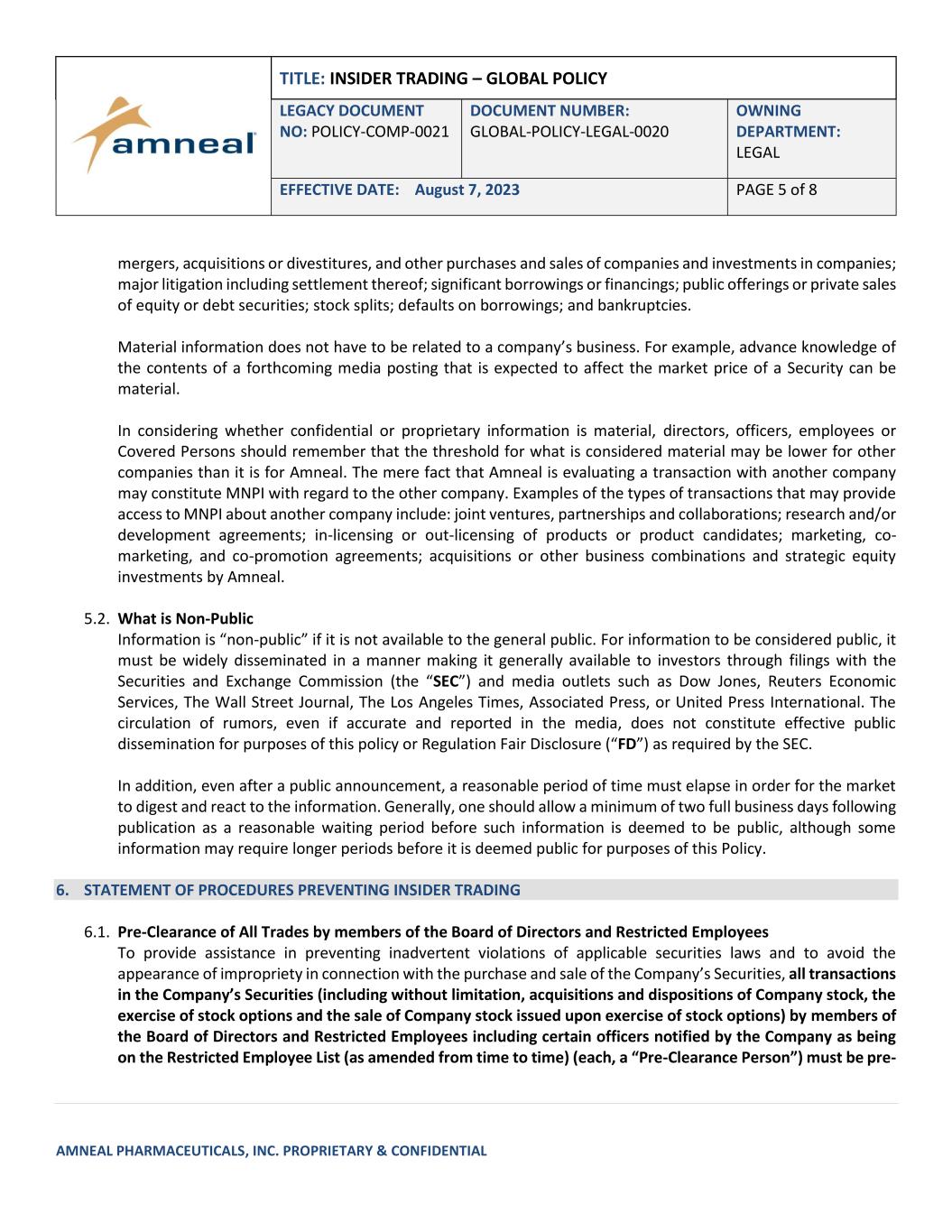 TITLE: INSIDER TRADING – GLOBAL POLICY LEGACY DOCUMENT NO: POLICY-COMP-0021 DOCUMENT NUMBER: GLOBAL-POLICY-LEGAL-0020 OWNING DEPARTMENT: LEGAL EFFECTIVE DATE: August 7, 2023 PAGE 5 of 8 AMNEAL PHARMACEUTICALS, INC. PROPRIETARY & CONFIDENTIAL mergers, acquisitions or divestitures, and other purchases and sales of companies and investments in companies; major litigation including settlement thereof; significant borrowings or financings; public offerings or private sales of equity or debt securities; stock splits; defaults on borrowings; and bankruptcies. Material information does not have to be related to a company’s business. For example, advance knowledge of the contents of a forthcoming media posting that is expected to affect the market price of a Security can be material. In considering whether confidential or proprietary information is material, directors, officers, employees or Covered Persons should remember that the threshold for what is considered material may be lower for other companies than it is for Amneal. The mere fact that Amneal is evaluating a transaction with another company may constitute MNPI with regard to the other company. Examples of the types of transactions that may provide access to MNPI about another company include: joint ventures, partnerships and collaborations; research and/or development agreements; in-licensing or out-licensing of products or product candidates; marketing, co- marketing, and co-promotion agreements; acquisitions or other business combinations and strategic equity investments by Amneal. 5.2. What is Non-Public Information is “non-public” if it is not available to the general public. For information to be considered public, it must be widely disseminated in a manner making it generally available to investors through filings with the Securities and Exchange Commission (the “SEC”) and media outlets such as Dow Jones, Reuters Economic Services, The Wall Street Journal, The Los Angeles Times, Associated Press, or United Press International. The circulation of rumors, even if accurate and reported in the media, does not constitute effective public dissemination for purposes of this policy or Regulation Fair Disclosure (“FD”) as required by the SEC. In addition, even after a public announcement, a reasonable period of time must elapse in order for the market to digest and react to the information. Generally, one should allow a minimum of two full business days following publication as a reasonable waiting period before such information is deemed to be public, although some information may require longer periods before it is deemed public for purposes of this Policy. 6. STATEMENT OF PROCEDURES PREVENTING INSIDER TRADING 6.1. Pre-Clearance of All Trades by members of the Board of Directors and Restricted Employees To provide assistance in preventing inadvertent violations of applicable securities laws and to avoid the appearance of impropriety in connection with the purchase and sale of the Company’s Securities, all transactions in the Company’s Securities (including without limitation, acquisitions and dispositions of Company stock, the exercise of stock options and the sale of Company stock issued upon exercise of stock options) by members of the Board of Directors and Restricted Employees including certain officers notified by the Company as being on the Restricted Employee List (as amended from time to time) (each, a “Pre-Clearance Person”) must be pre-