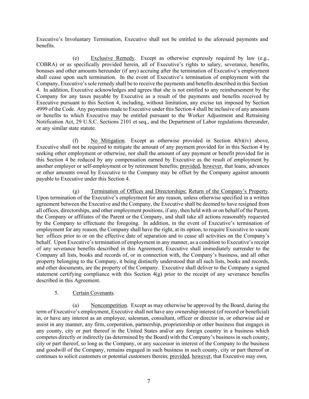 7 Executive’s Involuntary Termination, Executive shall not be entitled to the aforesaid payments and benefits. (e) Exclusive Remedy. Except as otherwise expressly required by law (e.g., COBRA) or as specifically provided herein, all of Executive’s rights to salary, severance, benefits, bonuses and other amounts hereunder (if any) accruing after the termination of Executive’s employment shall cease upon such termination. In the event of Executive’s termination of employment with the Company, Executive’s sole remedy shall be to receive the payments and benefits described in this Section 4. In addition, Executive acknowledges and agrees that she is not entitled to any reimbursement by the Company for any taxes payable by Executive as a result of the payments and benefits received by Executive pursuant to this Section 4, including, without limitation, any excise tax imposed by Section 4999 of the Code. Any payments made to Executive under this Section 4 shall be inclusive of any amounts or benefits to which Executive may be entitled pursuant to the Worker Adjustment and Retraining Notification Act, 29 U.S.C. Sections 2101 et seq., and the Department of Labor regulations thereunder, or any similar state statute. (f) No Mitigation. Except as otherwise provided in Section 4(b)(iv) above, Executive shall not be required to mitigate the amount of any payment provided for in this Section 4 by seeking other employment or otherwise, nor shall the amount of any payment or benefit provided for in this Section 4 be reduced by any compensation earned by Executive as the result of employment by another employer or self-employment or by retirement benefits; provided, however, that loans, advances or other amounts owed by Executive to the Company may be offset by the Company against amounts payable to Executive under this Section 4. (g) Termination of Offices and Directorships; Return of the Company’s Property. Upon termination of the Executive’s employment for any reason, unless otherwise specified in a written agreement between the Executive and the Company, the Executive shall be deemed to have resigned from all offices, directorships, and other employment positions, if any, then held with or on behalf of the Parent, the Company or affiliates of the Parent or the Company, and shall take all actions reasonably requested by the Company to effectuate the foregoing. In addition, in the event of Executive’s termination of employment for any reason, the Company shall have the right, at its option, to require Executive to vacate her offices prior to or on the effective date of separation and to cease all activities on the Company’s behalf. Upon Executive’s termination of employment in any manner, as a condition to Executive’s receipt of any severance benefits described in this Agreement, Executive shall immediately surrender to the Company all lists, books and records of, or in connection with, the Company’s business, and all other property belonging to the Company, it being distinctly understood that all such lists, books and records, and other documents, are the property of the Company. Executive shall deliver to the Company a signed statement certifying compliance with this Section 4(g) prior to the receipt of any severance benefits described in this Agreement. 5. Certain Covenants. (a) Noncompetition. Except as may otherwise be approved by the Board, during the term of Executive’s employment, Executive shall not have any ownership interest (of record or beneficial) in, or have any interest as an employee, salesman, consultant, officer or director in, or otherwise aid or assist in any manner, any firm, corporation, partnership, proprietorship or other business that engages in any county, city or part thereof in the United States and/or any foreign country in a business which competes directly or indirectly (as determined by the Board) with the Company’s business in such county, city or part thereof, so long as the Company, or any successor in interest of the Company to the business and goodwill of the Company, remains engaged in such business in such county, city or part thereof or continues to solicit customers or potential customers therein; provided, however, that Executive may own,