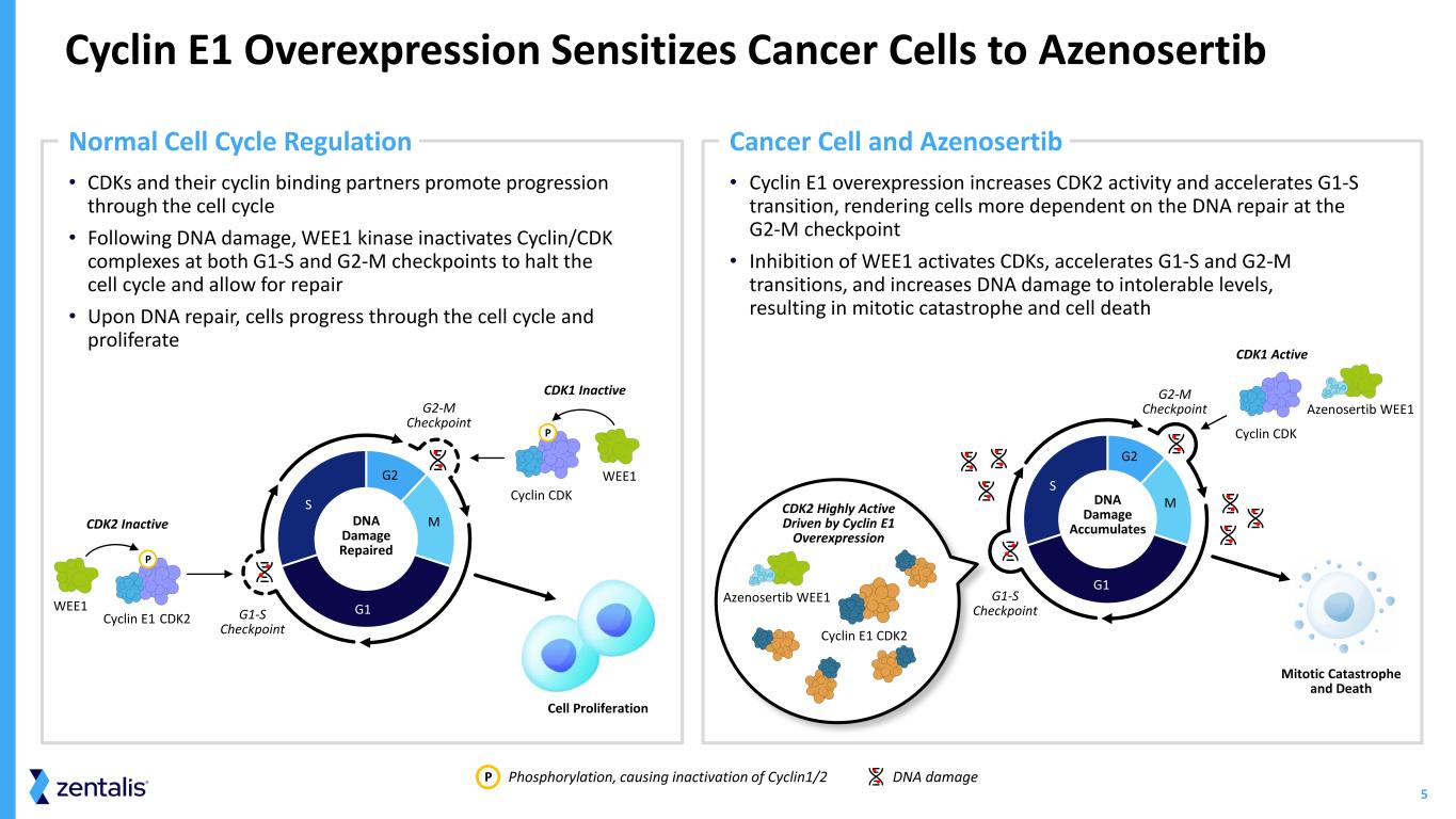 4 Projected Cash Runway into Late 2027, Beyond Anticipated Registration- Intent Phase 2 Topline Data o 2026: Initiate Phase 3 confirmatory trial following FDA feedback o YE 2026: Topline data from registration-intent† DENALI Part 2 o Potential for FDA accelerated approval in Cyclin E1- Positive PROC patients† Anticipated Upcoming Milestones * Cyclin E1 IHC+ based on Zentalis proprietary IHC cutoff and Cyclin E1 IHC assay developed from the existing clinical data † Subject to supportive data and FDA feedback and approval Abbreviations: 5:2 schedule = 5 days once-daily administration of azenosertib, followed by 2 days without azenosertib $280.7M cash, cash equivalents and marketable securities as of September 30, 2025 Interim clinical data demonstrated clinically meaningful results and manageable safety profile across multiple azenosertib monotherapy studies, with 200+ PROC patients treated at 300mg and 400mg QD 5:2 Established Cyclin E1 protein overexpression, as determined by proprietary IHC cutoff*, as predictive biomarker for azenosertib in PROC Registration-intent† Part 2 of the Phase 2 DENALI clinical trial is underway and enrolling patients Strategic Focus and Resource Prioritization on Cyclin E1-Positive PROC